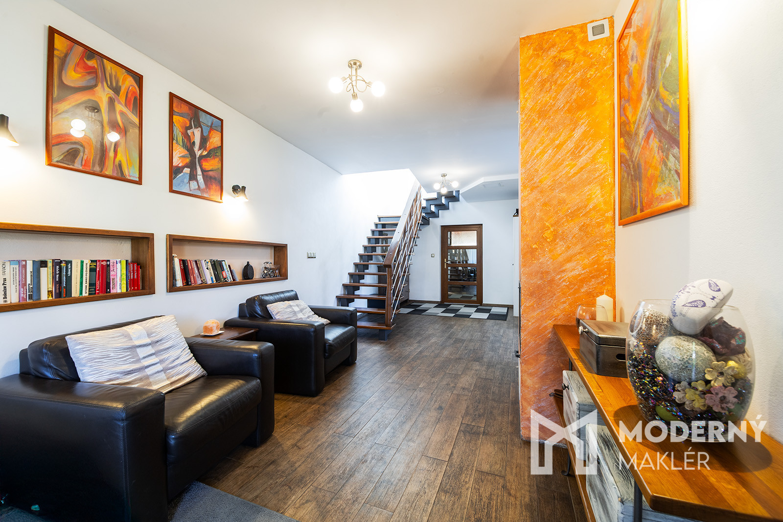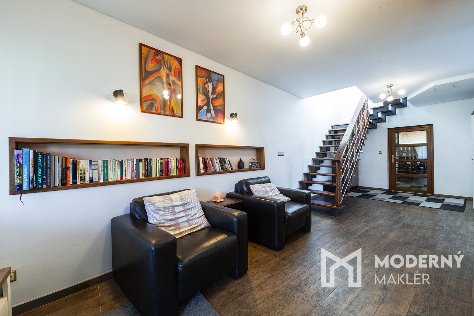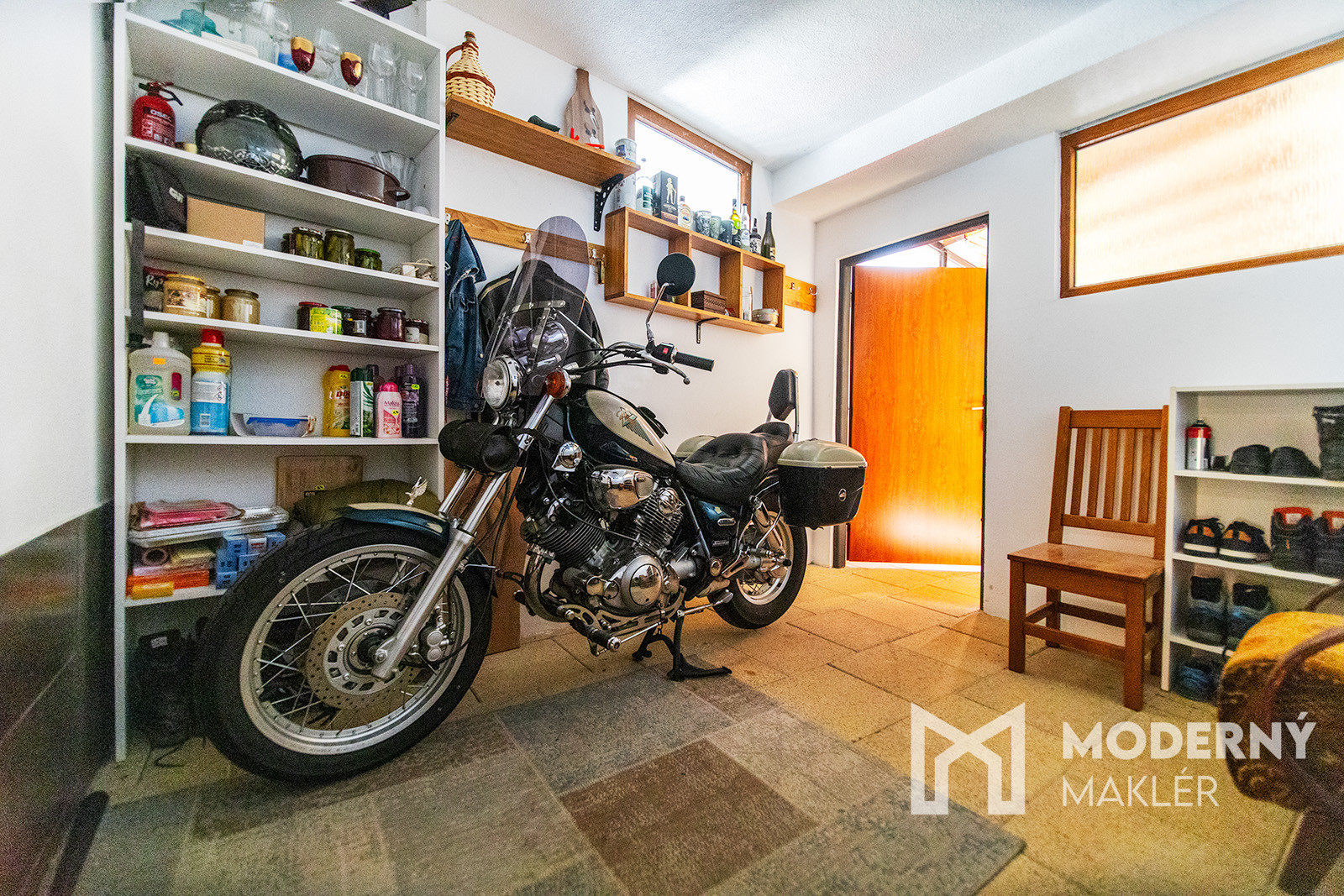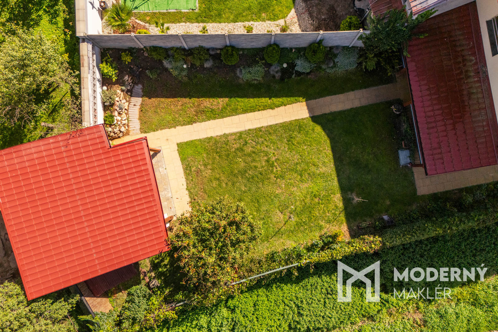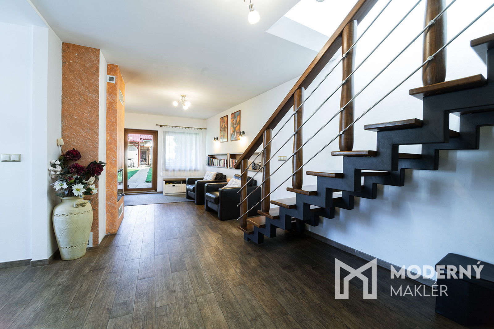 Pred domom je garáž pre 2 autá a 2 zastrešené parkovacie miesta. Na prízemí sa nachádza obývacia izba s krbom, spálňa, kúpeľňa so sprchovým kútom a WC, technická miestnosť a skladové priestory vhodné na podnikanie s oddeleným vstupom. Na poschodí je priestranná obývacia izba spojená s kuchyňou disponujúcou kuchynskou linkou so vstavanými spotrebičmi (elektrická varná doska, elektrická rúra, umývačka riadu, chladnička, mraznička a digestor). Z kuchyne je výstup na veľkú terasu orientovanú na juh. Na poschodí sú tiež dve detské izby, priestranný vstavaný šatník na chodbe a kúpeľňa s vaňou a WC. Dom sa predáva kompletne zariadený. Povala môže slúžiť ako ďalší odkladací priestor, rovnako ako bicykláreň na prízemí, do ktorej sa vstupuje bezpečnostnými dverami. Súčasťou nehnuteľnosti je aj záhradný domček s altánkom na konci záhrady, v ktorom je umiestený kotol na grilovanie.