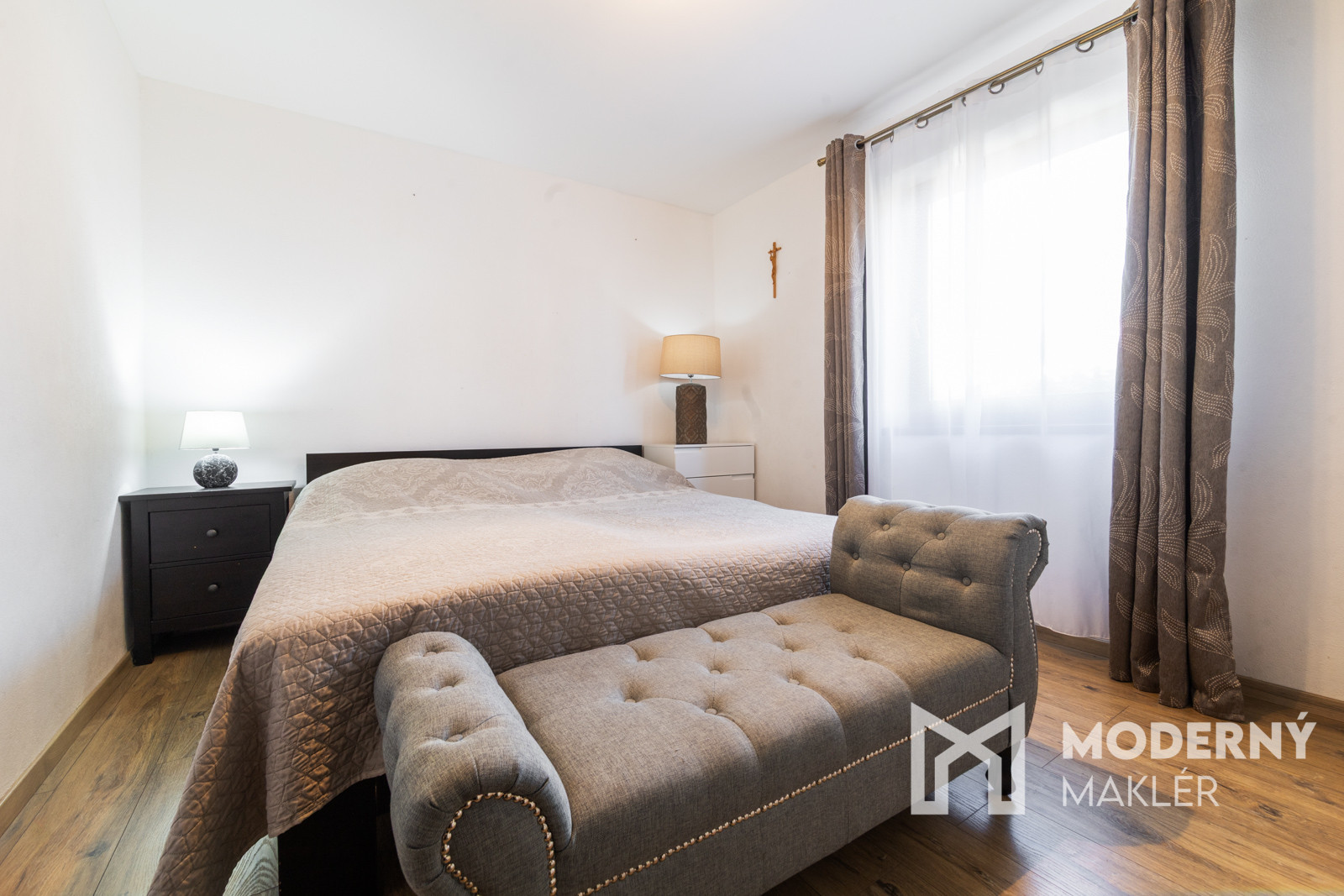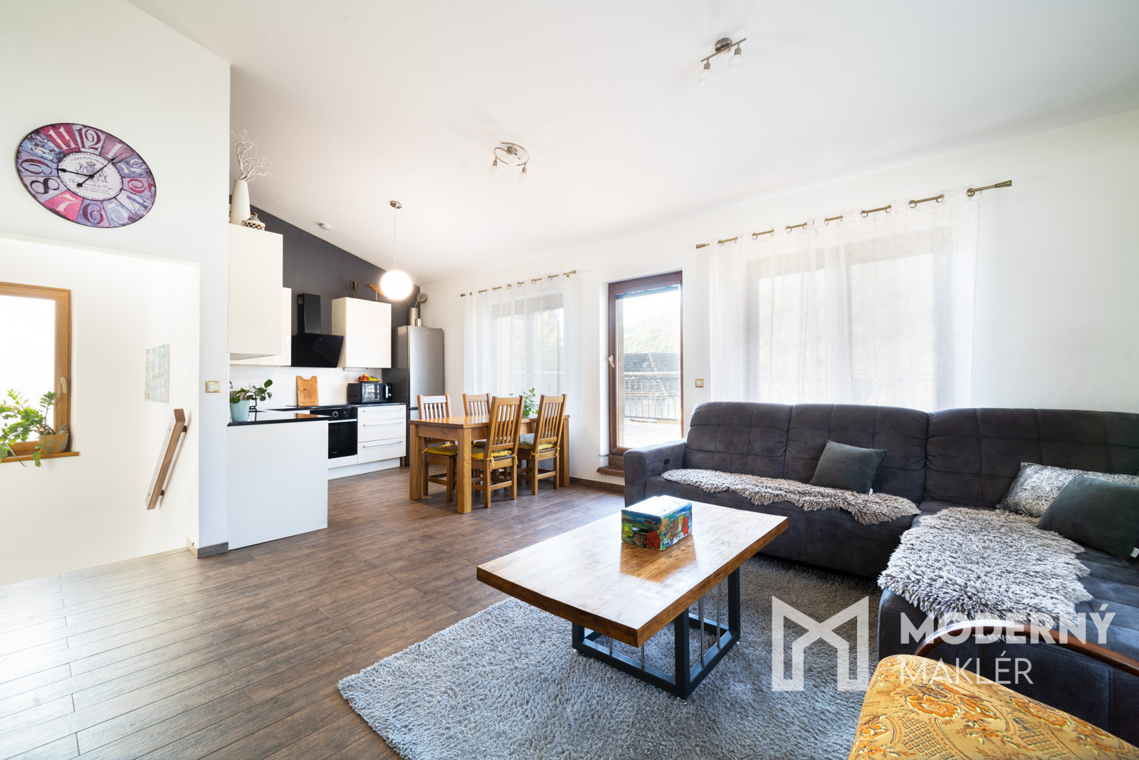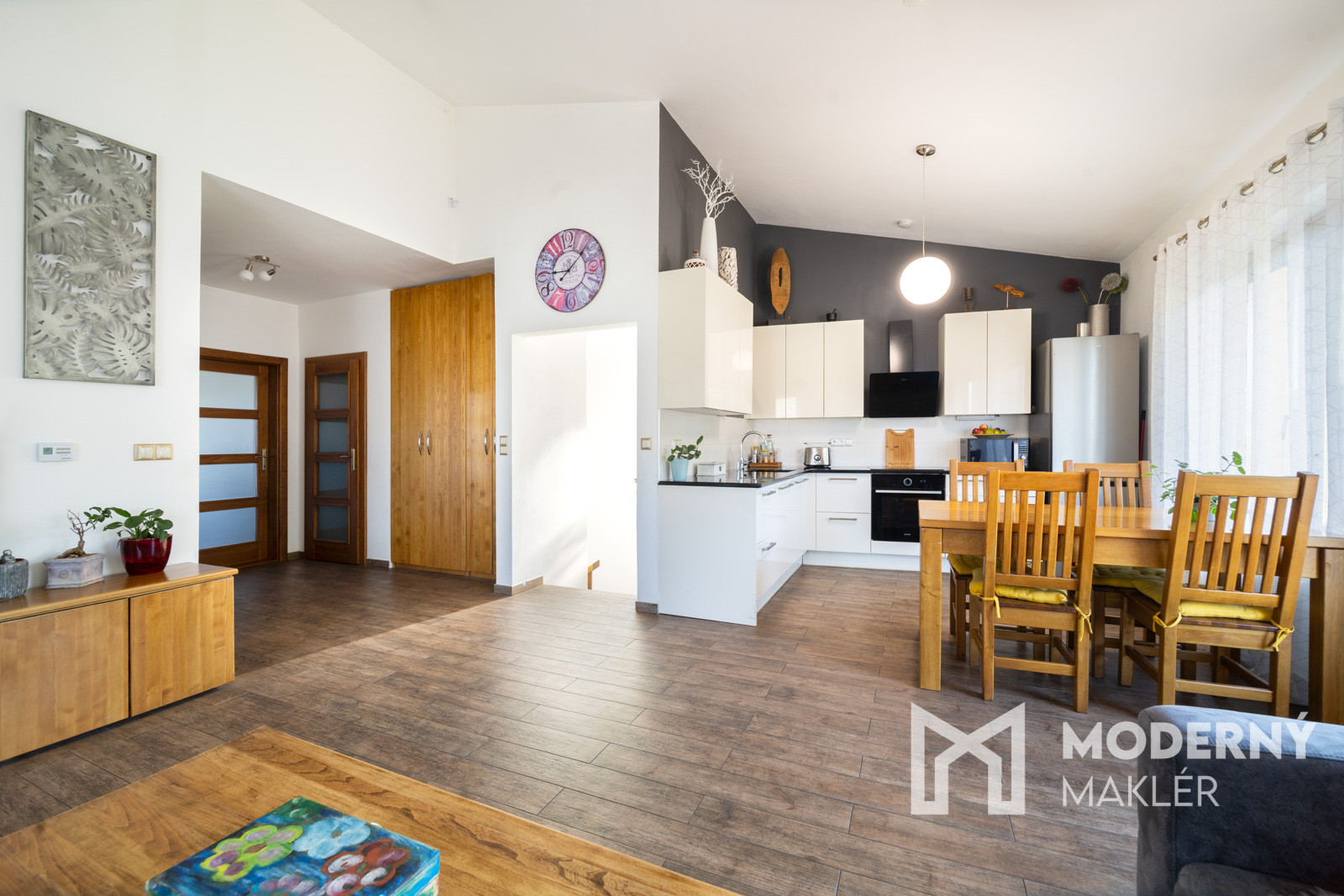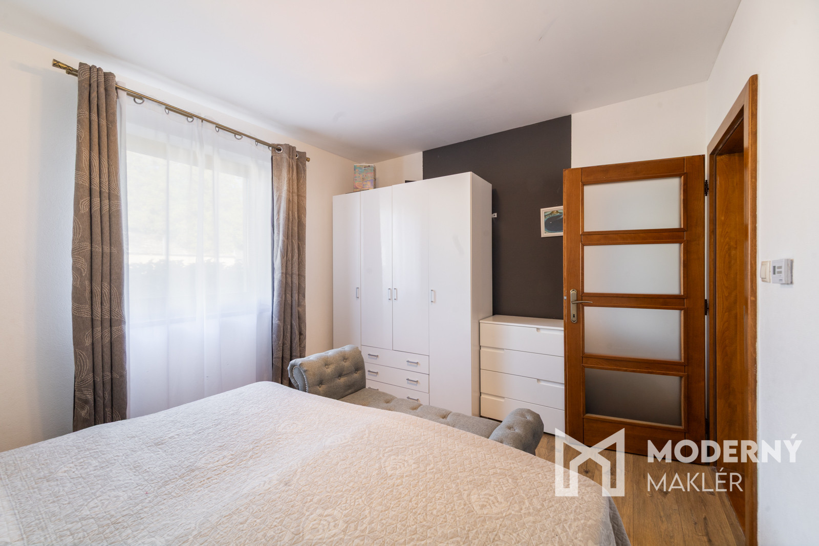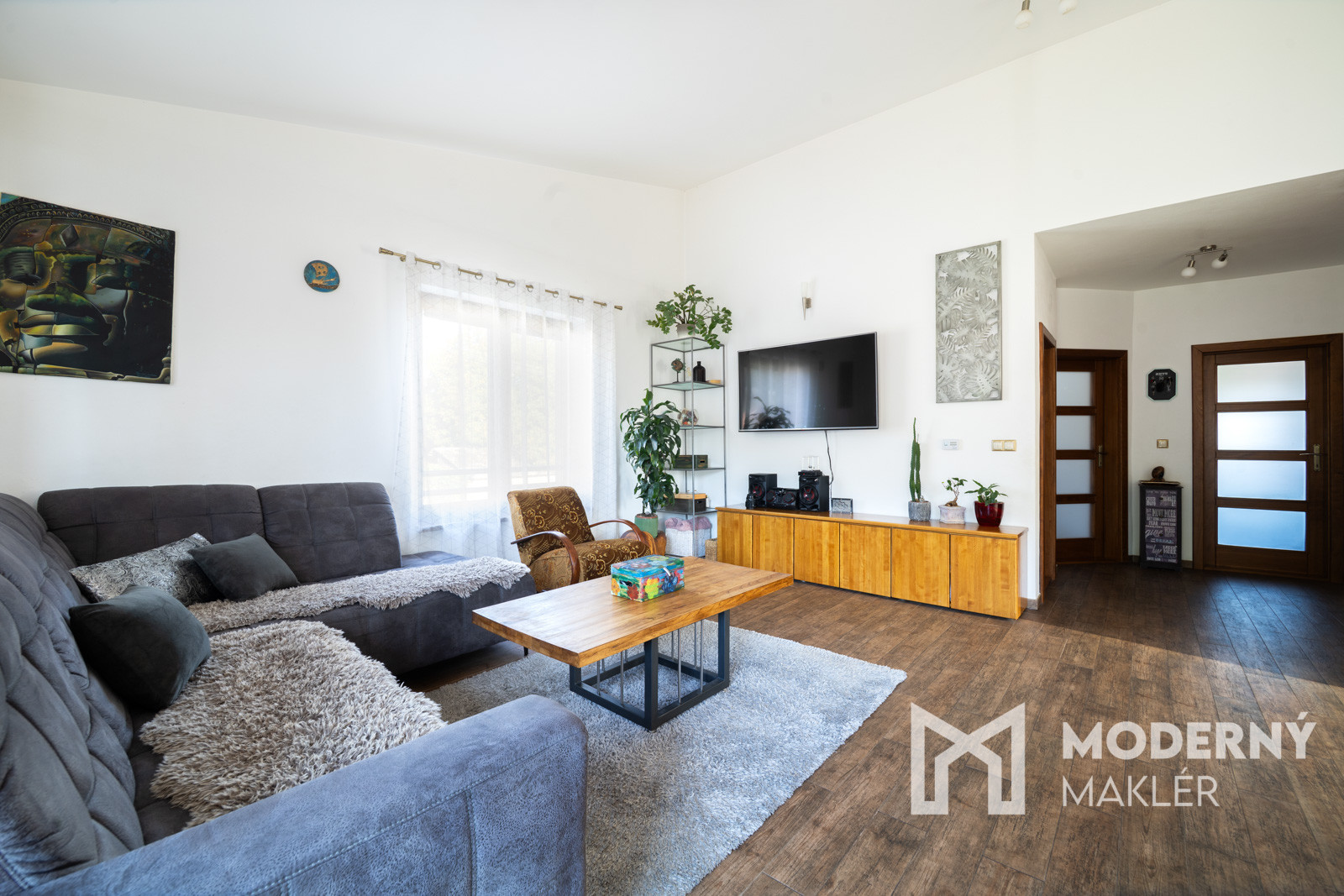 Pred domom je garáž pre 2 autá a 2 zastrešené parkovacie miesta. Na prízemí sa nachádza obývacia izba s krbom, spálňa, kúpeľňa so sprchovým kútom a WC, technická miestnosť a skladové priestory vhodné na podnikanie s oddeleným vstupom. Na poschodí je priestranná obývacia izba spojená s kuchyňou disponujúcou kuchynskou linkou so vstavanými spotrebičmi (elektrická varná doska, elektrická rúra, umývačka riadu, chladnička, mraznička a digestor). Z kuchyne je výstup na veľkú terasu orientovanú na juh. Na poschodí sú tiež dve detské izby, priestranný vstavaný šatník na chodbe a kúpeľňa s vaňou a WC. Dom sa predáva kompletne zariadený. Povala môže slúžiť ako ďalší odkladací priestor, rovnako ako bicykláreň na prízemí, do ktorej sa vstupuje bezpečnostnými dverami. Súčasťou nehnuteľnosti je aj záhradný domček s altánkom na konci záhrady, v ktorom je umiestený kotol na grilovanie.