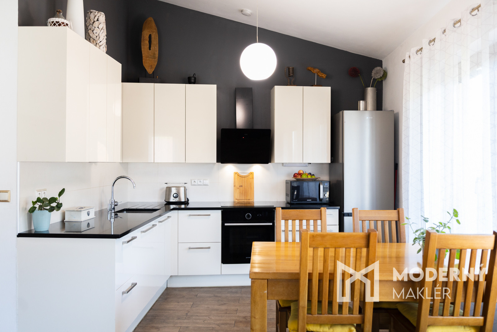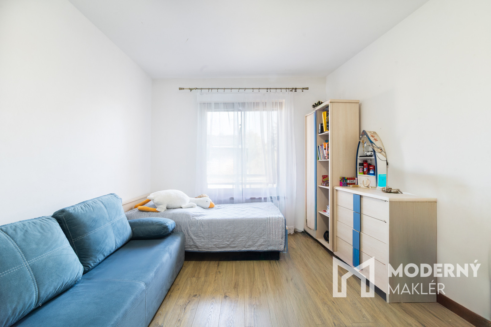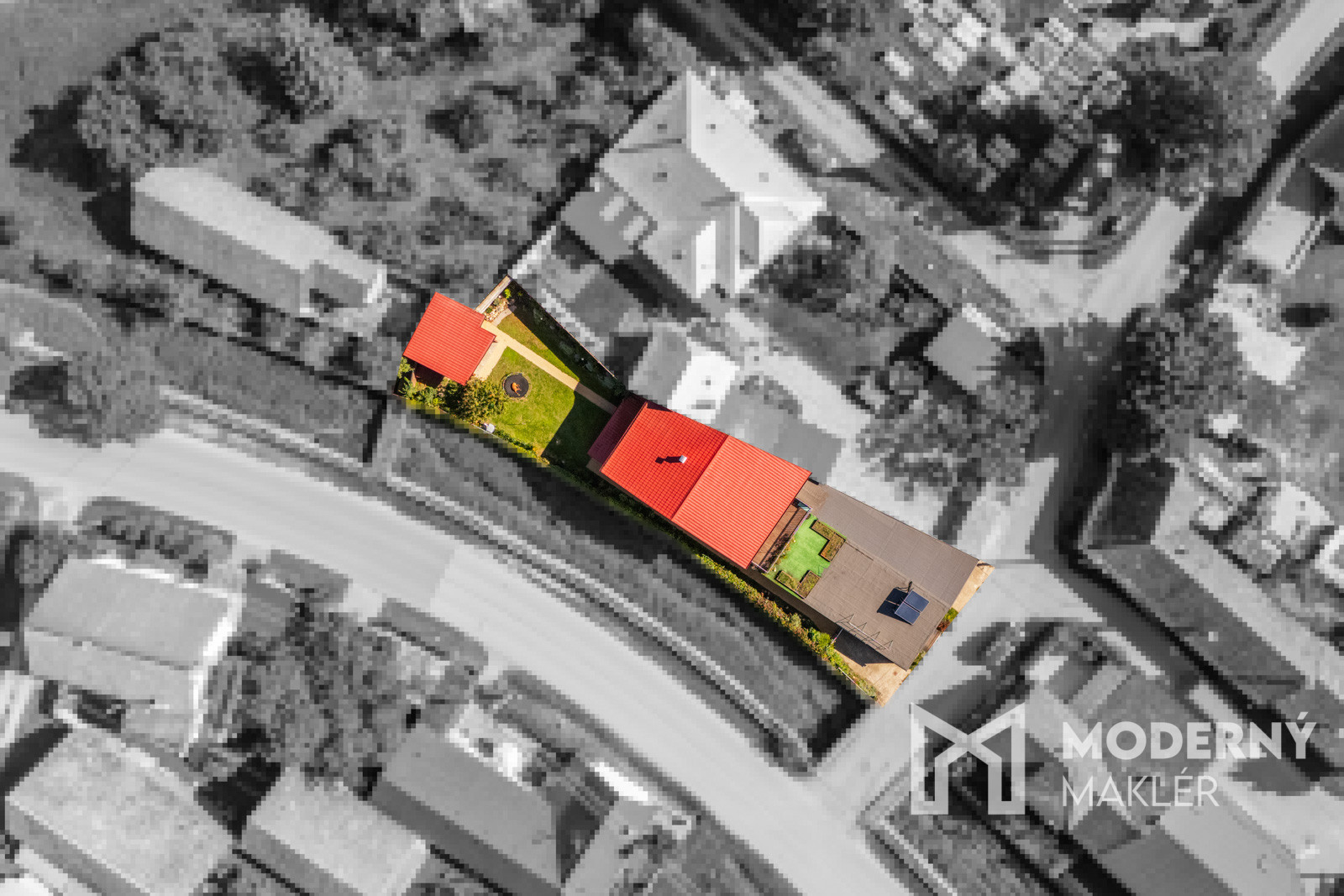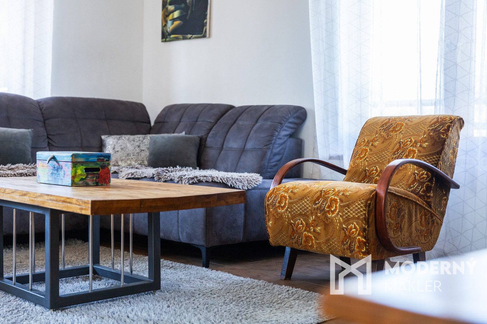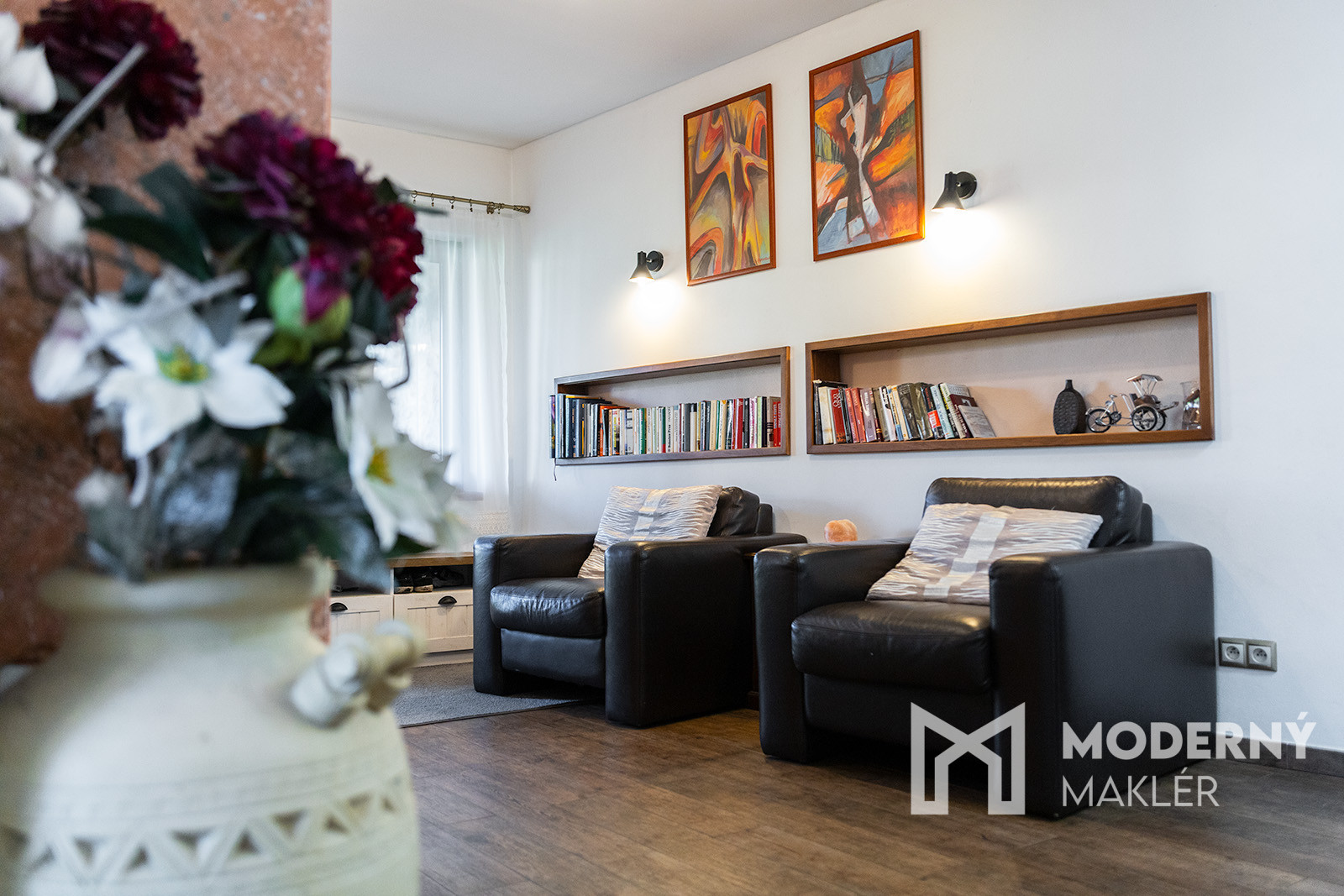 Pred domom je garáž pre 2 autá a 2 zastrešené parkovacie miesta. Na prízemí sa nachádza obývacia izba s krbom, spálňa, kúpeľňa so sprchovým kútom a WC, technická miestnosť a skladové priestory vhodné na podnikanie s oddeleným vstupom. Na poschodí je priestranná obývacia izba spojená s kuchyňou disponujúcou kuchynskou linkou so vstavanými spotrebičmi (elektrická varná doska, elektrická rúra, umývačka riadu, chladnička, mraznička a digestor). Z kuchyne je výstup na veľkú terasu orientovanú na juh. Na poschodí sú tiež dve detské izby, priestranný vstavaný šatník na chodbe a kúpeľňa s vaňou a WC. Dom sa predáva kompletne zariadený. Povala môže slúžiť ako ďalší odkladací priestor, rovnako ako bicykláreň na prízemí, do ktorej sa vstupuje bezpečnostnými dverami. Súčasťou nehnuteľnosti je aj záhradný domček s altánkom na konci záhrady, v ktorom je umiestený kotol na grilovanie.