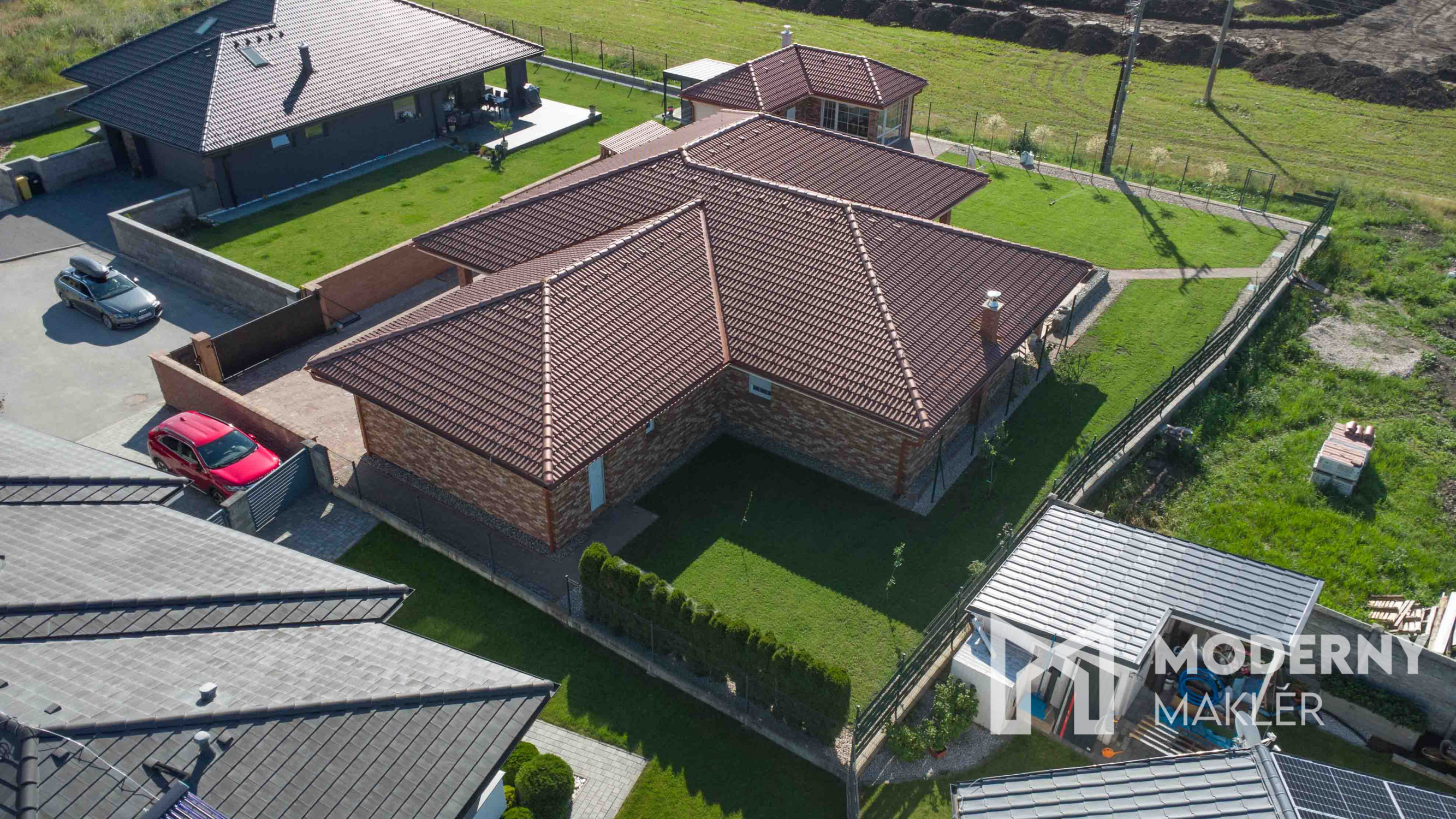 Dom je postavený z najmodernejších a energeticky efektívnych materiálov. Ytong Lambda 45 cm poskytuje vynikajúce tepelnoizolačné a zvukové vlastnosti, zatiaľ čo 10 cm hrubé zateplenie polystyrénom zaručuje nízke prevádzkové náklady a príjemnú klímu po celý rok. Fasádu zdobí elegantný tehlový obklad, ktorý podčiarkuje exkluzívny charakter stavby a zároveň ju chráni pred poveternostnými vplyvmi. Plastové okná s izolačným trojsklom zabezpečujú vynikajúcu tepelnú izoláciu, a vonkajšie bezpečnostné žalúzie s elektrickým ovládaním na všetkých oknách zabezpečujú súkromie. Vykurovanie je riešené teplovodným podlahovým systémom v kombinácii s moderným tepelným čerpadlom a zásobníkom vody s objemom 500 litrov. Dom je vybavený inteligentným systémom Loxone, ktorý umožňuje automatizované ovládanie osvetlenia, kúrenia a ďalších funkcií podľa individuálnych potrieb z mobilného zariadenia aj na diaľku. Predpríprava na kamerový systém už bola realizovaná. Budúci majiteľ sa môže tešiť na dokončený zavlažovací systém, výsadbu trávnika, okrasné dreviny, nový exteriérový obklad pred garážou a štýlové vonkajšie osvetlenie, ktoré bude dokončené pred predajom novému majiteľovi. Celý pozemok je oplotený a jeho exkluzivitu podčiarkuje ručne kovaná medená brána, ktorá je skutočným dizajnovým skvostom.