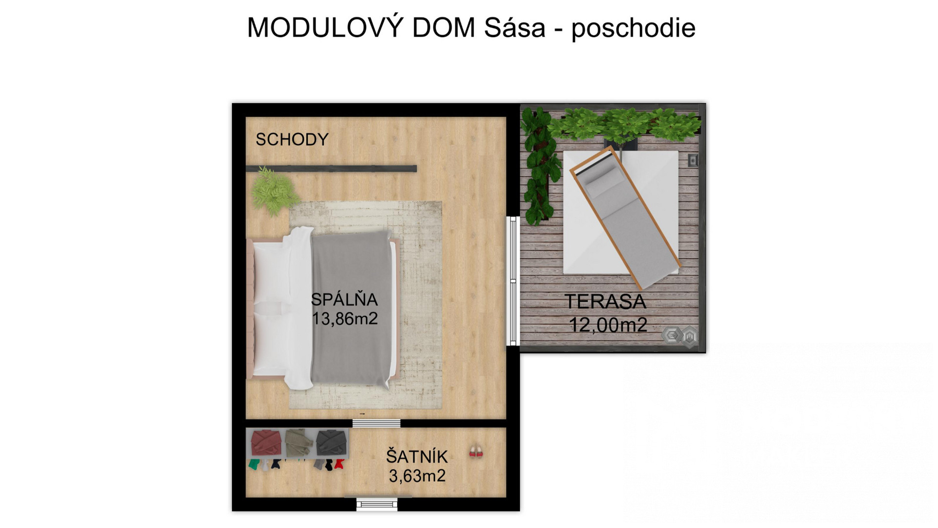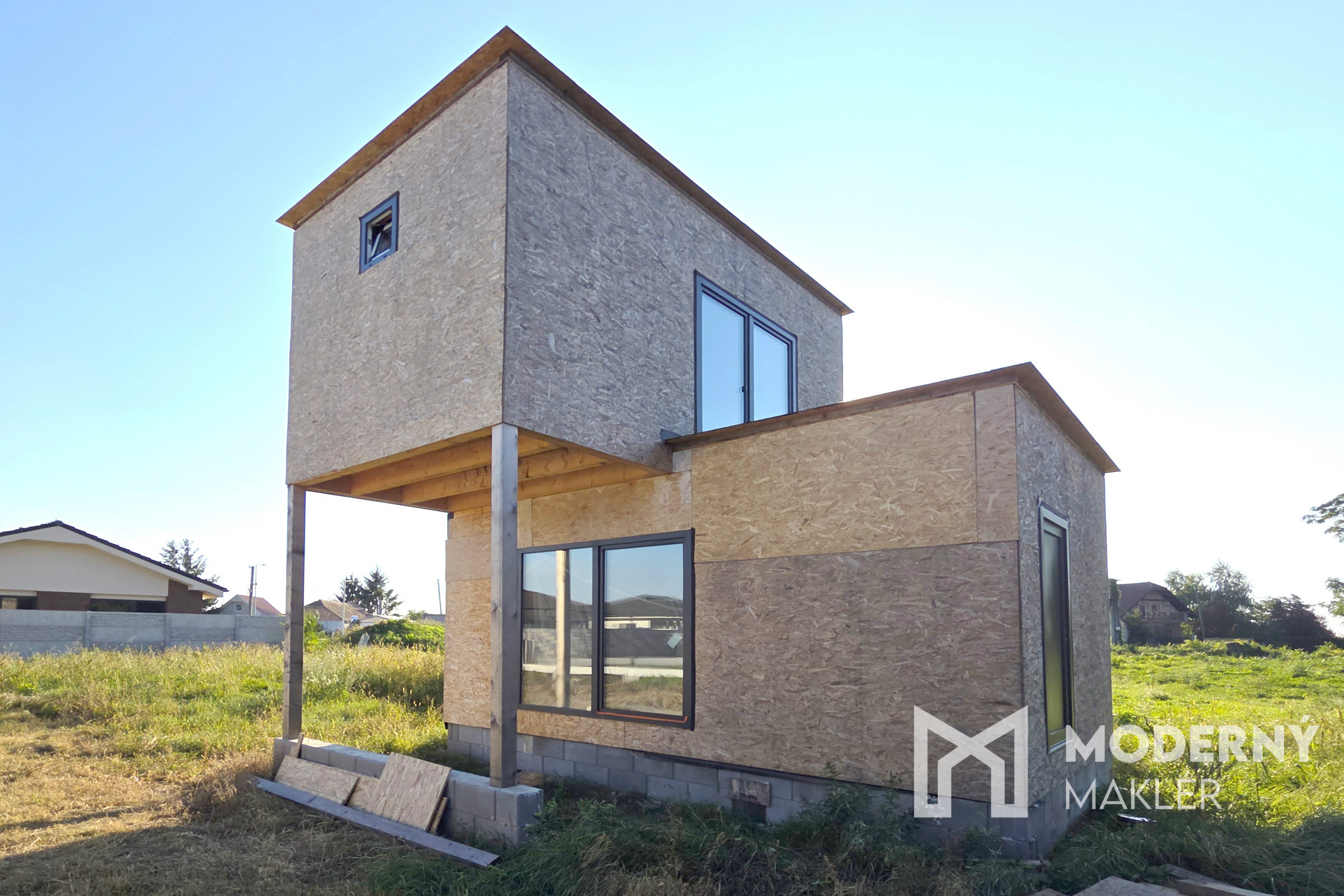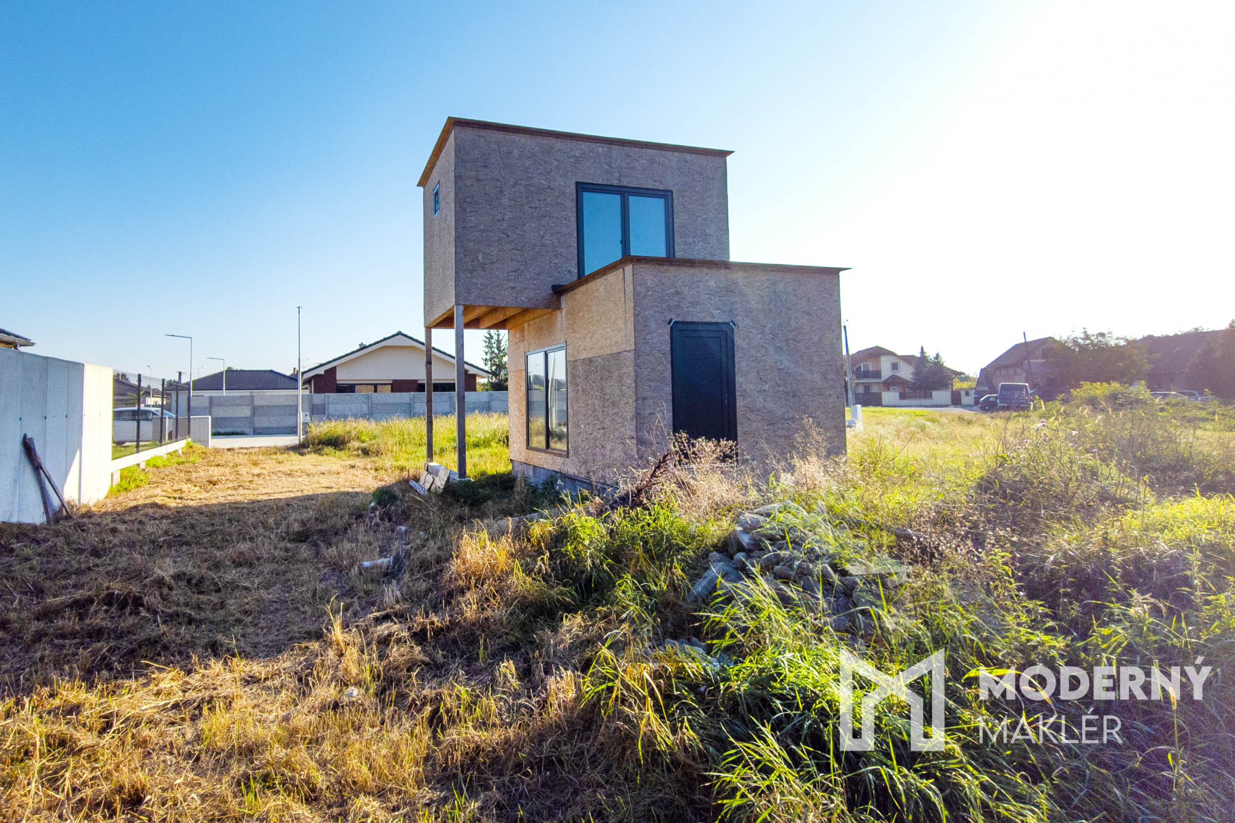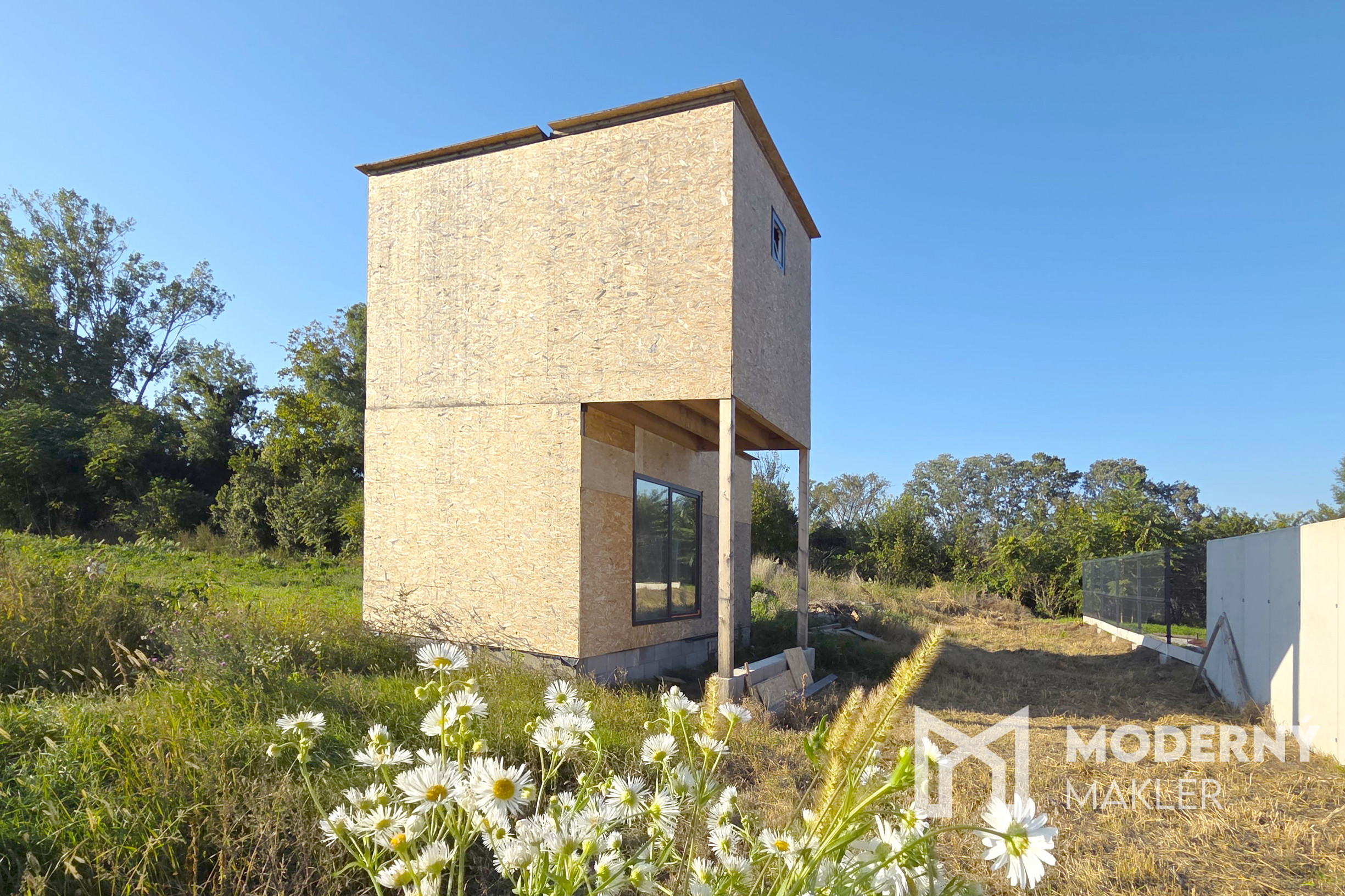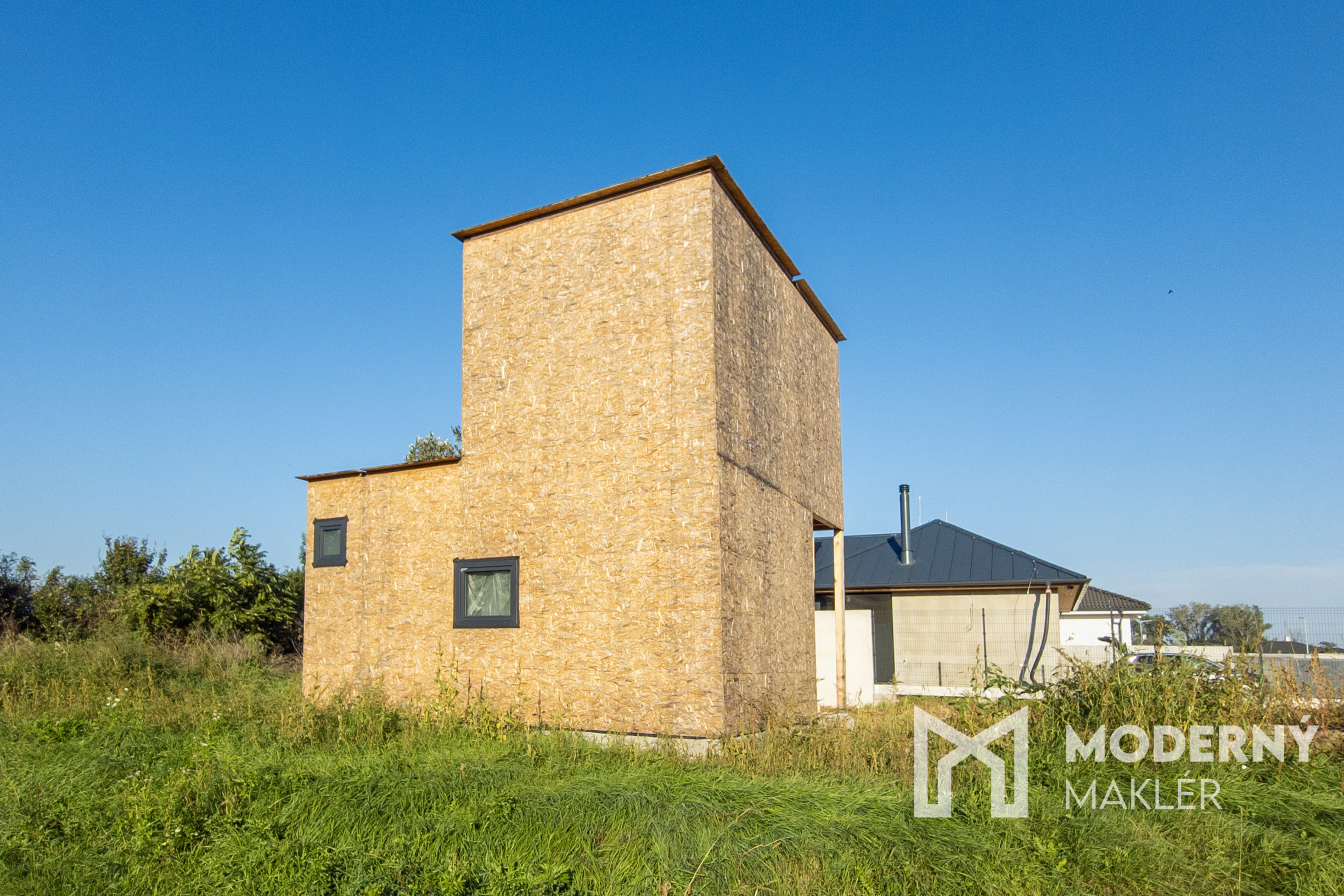 Modulový drevodom moderného typu je nepodpivničený, postavený na základovej doske. Na prízemí, s rozmermi 7×4 m, sa nachádza obývacia izba spojená s kuchyňou, kúpeľňa s toaletou a vstupná chodba. Poschodie, s rozmermi 6×4 m, tvorí spálňa so šatníkom a veľká terasa. Drevodom bude dostavaný do štandardu, s možnosťou dokončenia podľa predstáv nového majiteľa.
