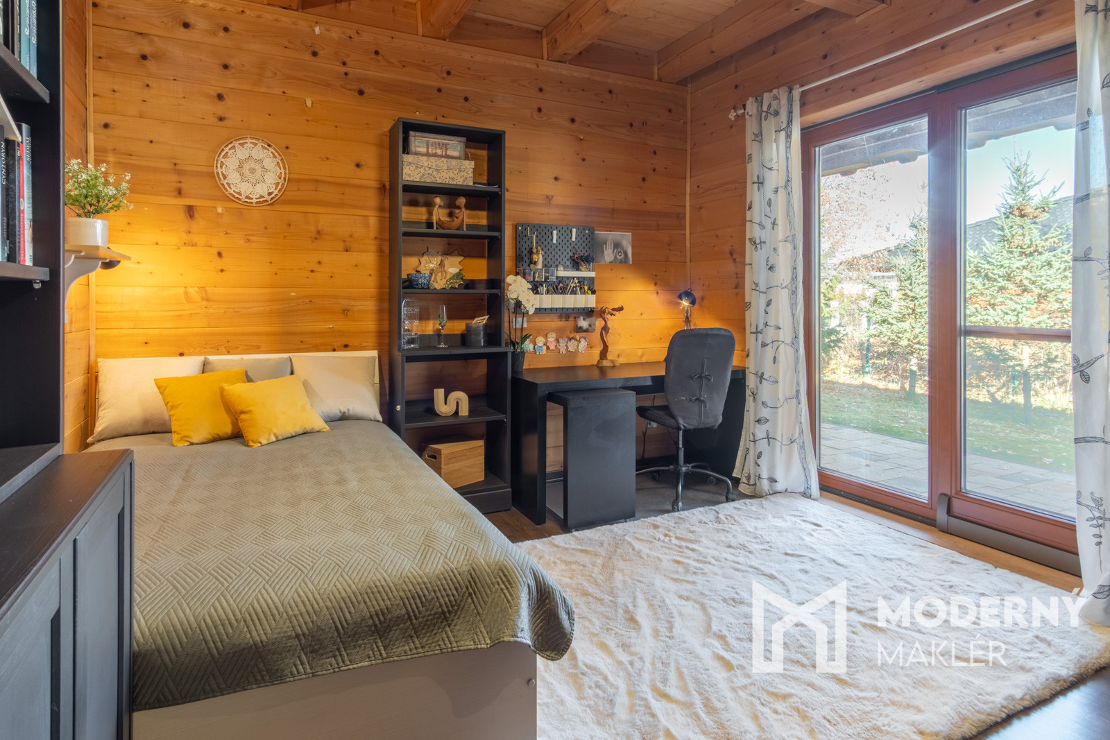 Dom bol navrhnutý s dôrazom na maximálny komfort, funkčnosť a súkromie pre všetkých členov rodiny. Už pri vstupe vás privíta priestranné zádverie, ktoré plynule prechádza do svetlej obývacej izby spojenej s kuchyňou a jedálňou. Tento otvorený priestor pôsobí vzdušne a útulne zároveň a jeho dominantu tvorí krbová pec, ktorá v chladnejších mesiacoch dotvára príjemnú atmosféru domova. Dom disponuje štyrmi spálňami, pričom dve z nich majú vlastnú kúpeľňu. Samostatne sa v dome nachádza aj toaleta pre hostí, špajza a hlavná kúpeľňa s práčovňou. Pre dokonalý oddych a regeneráciu slúžia dve sauny – fínska a infrasauna, zatiaľ čo zimná záhrada poskytuje pokojné útočisko na relax počas celého roka.