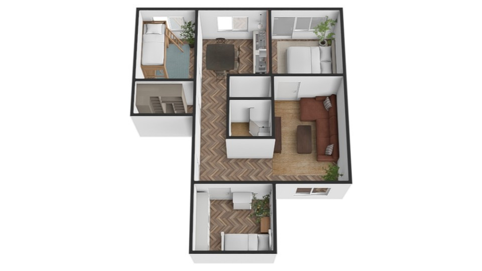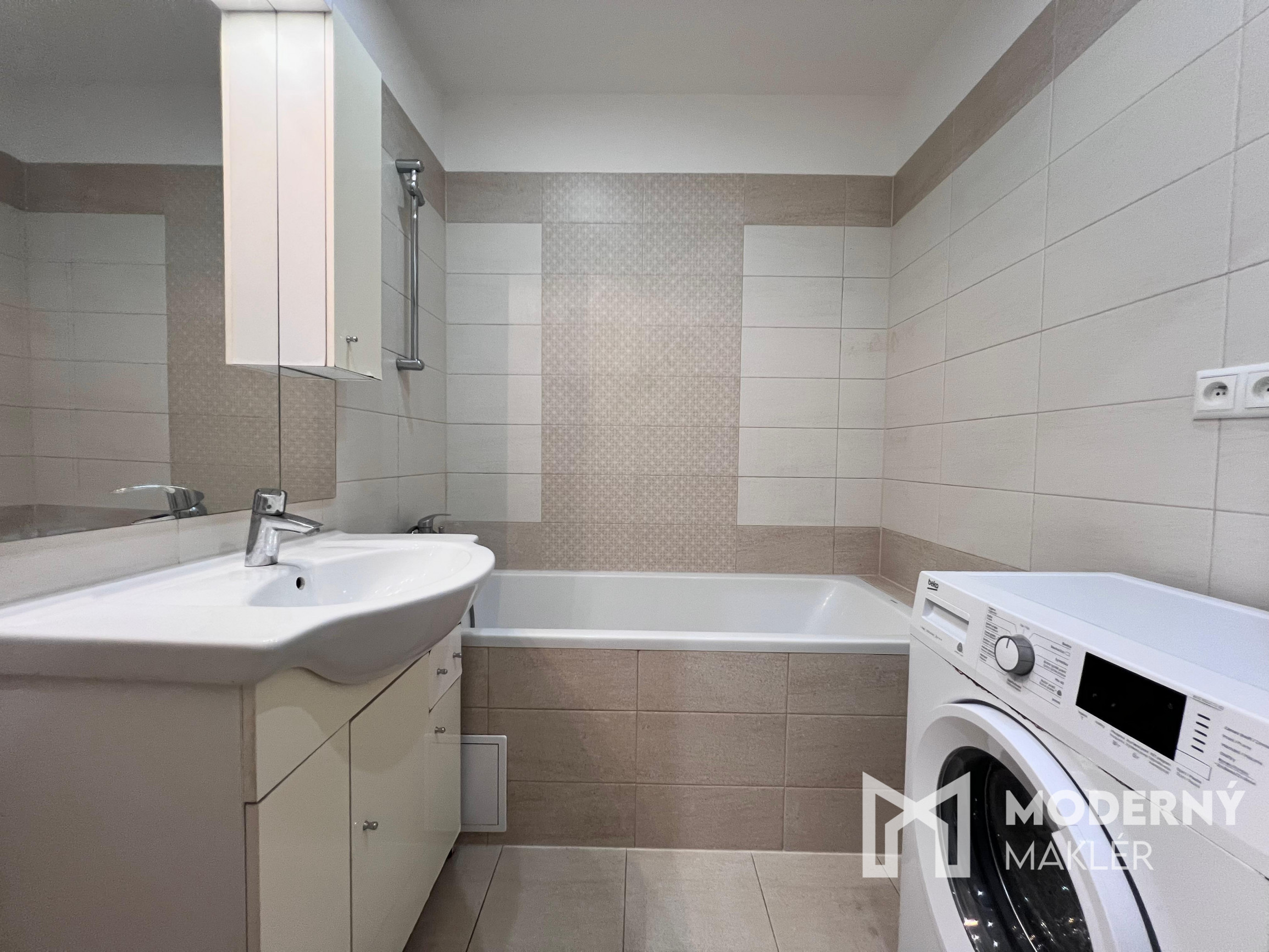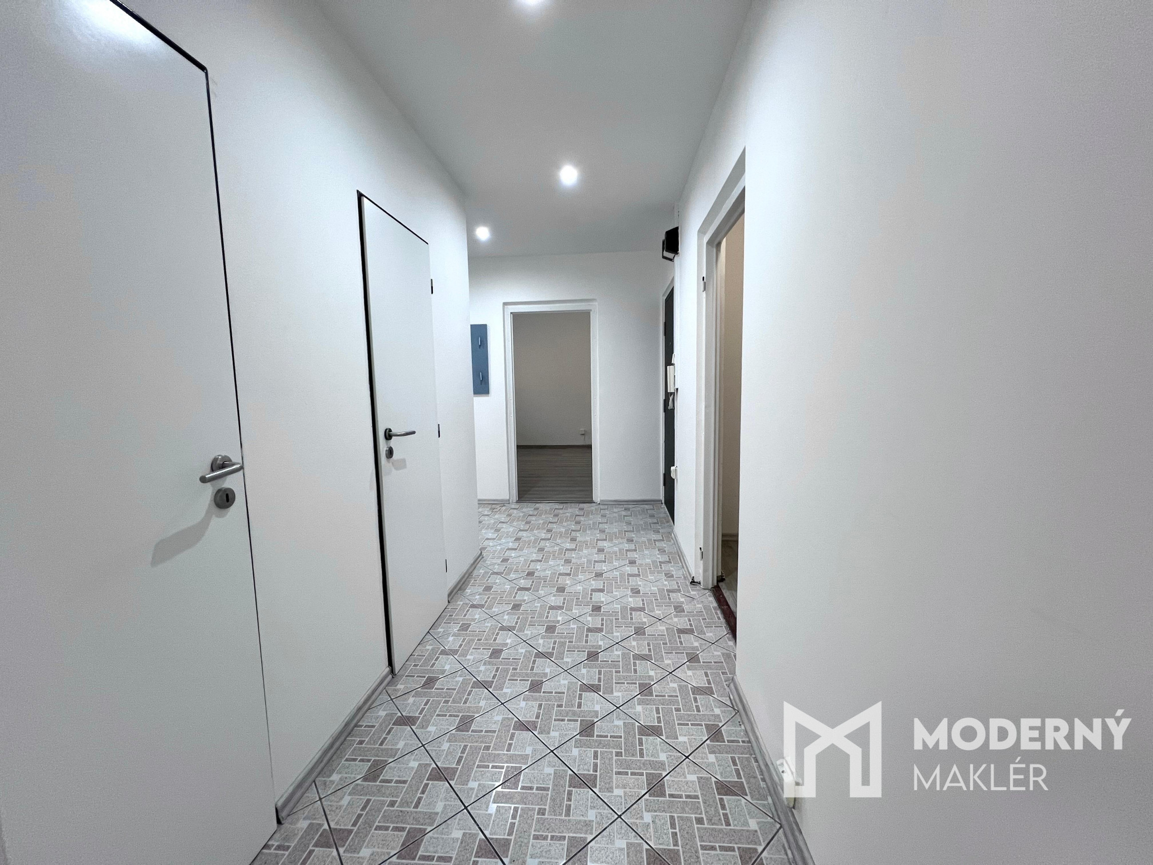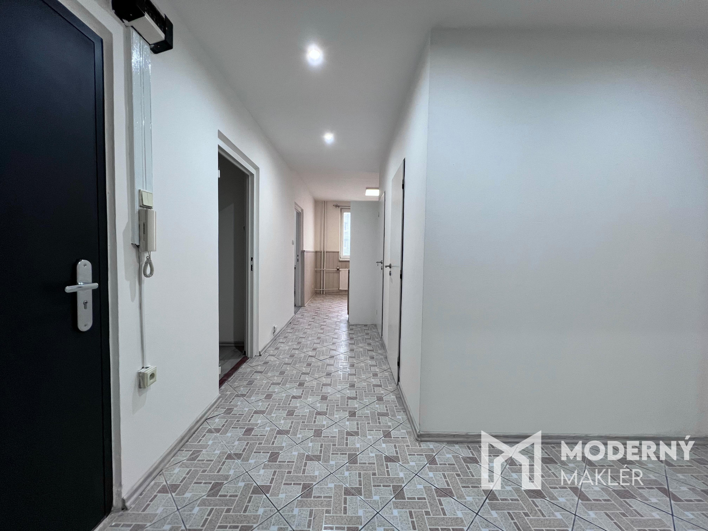 Do bytu sa vstupuje cez veľkorysú chodbu, na ktorej sa nachádza samostatné WC a kúpeľňa. Pravá strana chodby ponúka vstup do detskej izby, obývačky a spálne. Na ľavej strane sa nachádza priestranná kuchyňa, cez ktorú sa vchádza do druhej detskej izby. Praktickým bonusom vstupnej chodby je aj špajza, ktorá poskytuje dodatočný úložný priestor. Spálňa, obývačka a kuchyňa sú orientované na severovýchod.