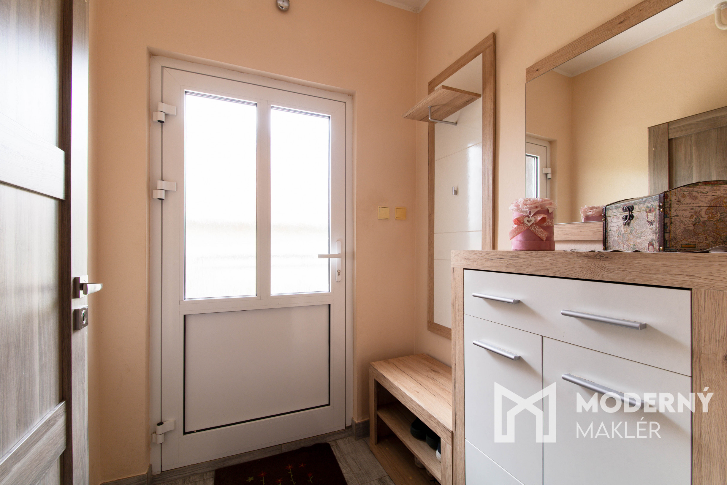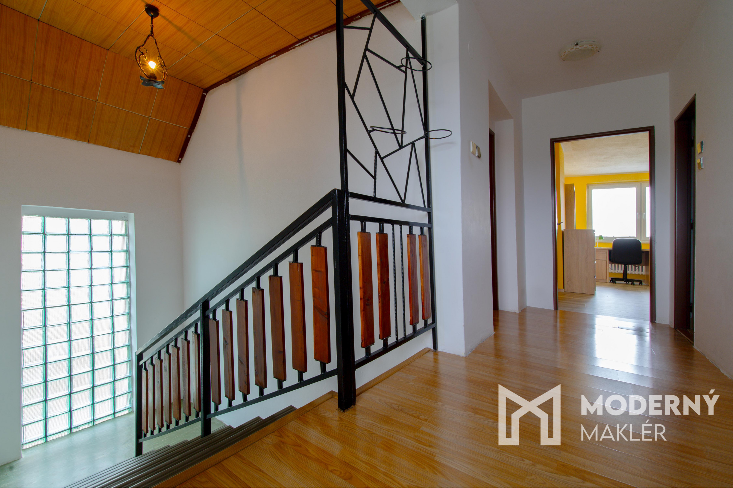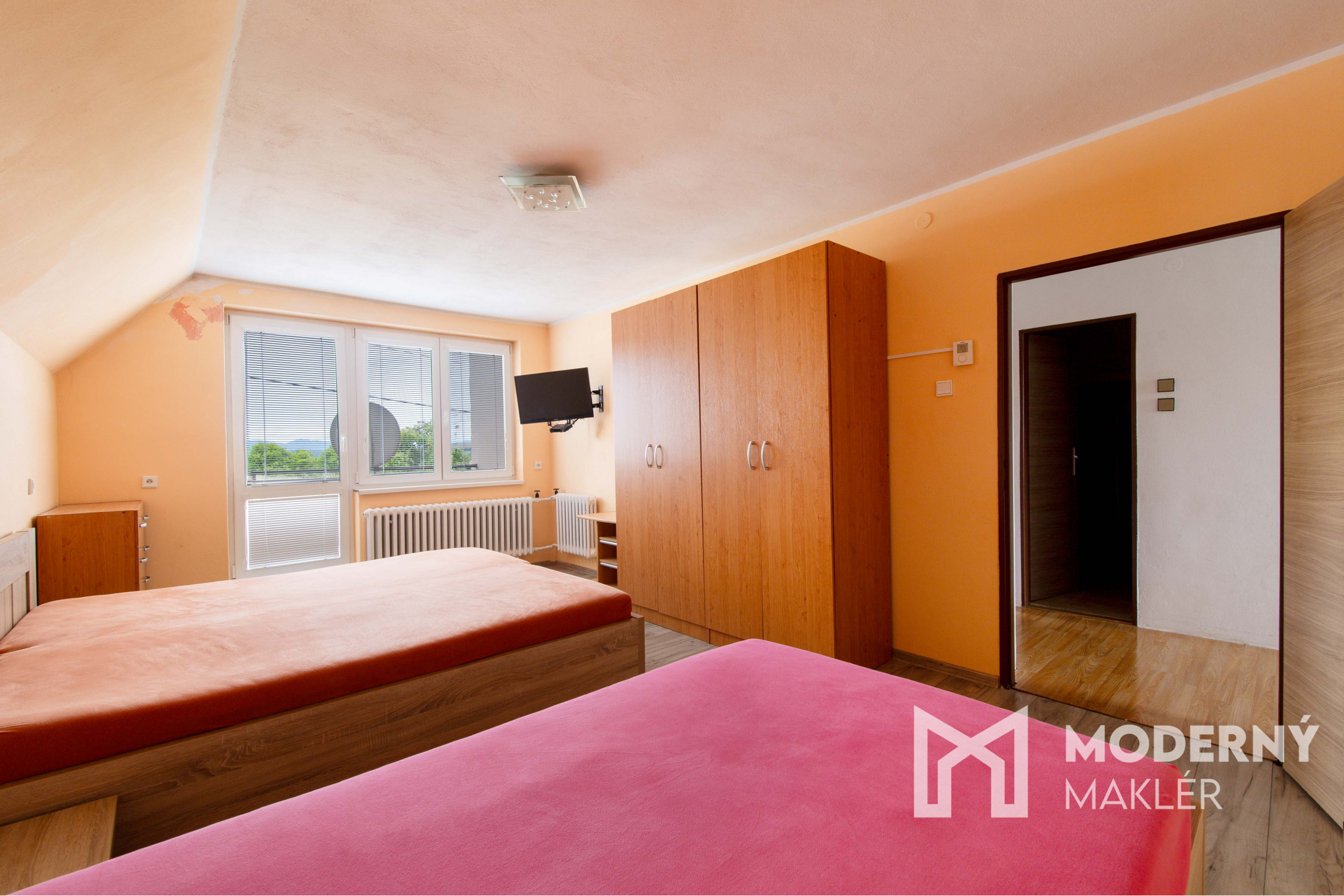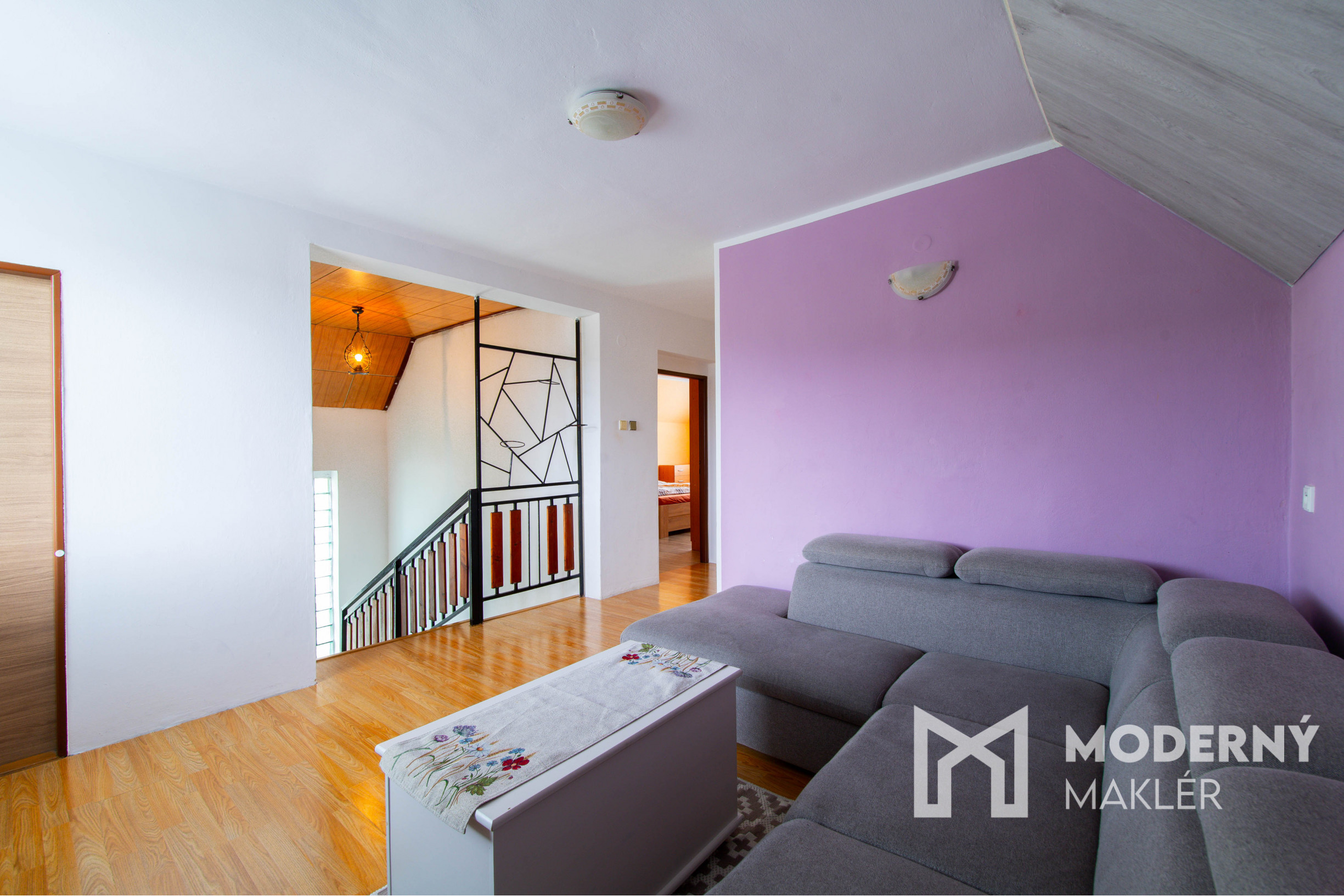 Na prízemí rodinného domu sa nachádza priestranné zádverie s úložným priestorom a vešiakovou zostavou, z ktorého sa vstupuje do hlavnej chodby. Časť domu ďalej ponúka samostatné WC, veľkú kúpeľňu s vaňou, komoru, obývaciu izbu, spálňu a kuchyňu. Prvé nadzemné podlažie tvorí chodba spojená s obývacou izbou, spálňa s výstupom na balkón, detská izba, kúpeľňa s WC a veľkorysá komora. Obe podlažia rodinného domu sú prepojené vnútorným schodiskom, ktoré pokračuje až do pivničných priestorov. Dom je kompletne podpivničený s množstvom úložného priestoru a ponúka potenciál na sebarealizáciu v podobe možnej prestavby na ďalšie obytné miestnosti alebo dielne. Praktickosť bývania zvyšujú dva samostatné vchody do domu. Nehnuteľnosť sa predáva čiastočne zariadená. Súčasťou predaja zostáva kompletná kuchynská linka so sporákom, praktické jedálenské sedenie, vstavaný úložný priestor, obývacia zostava a sedacia súprava.