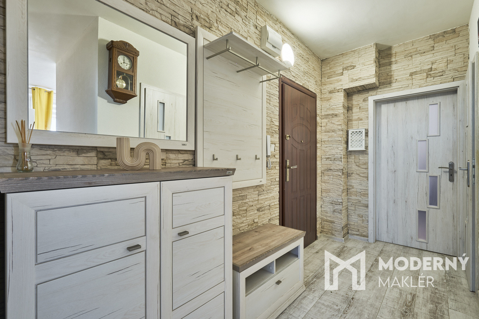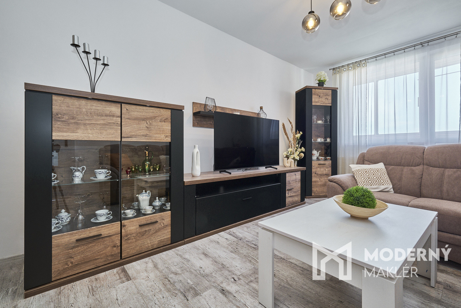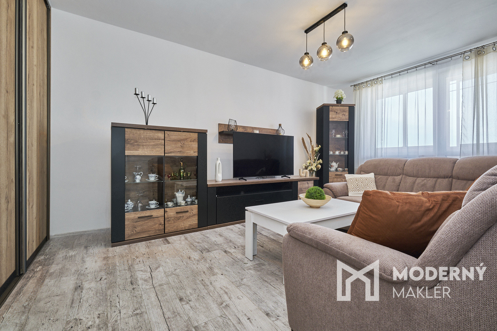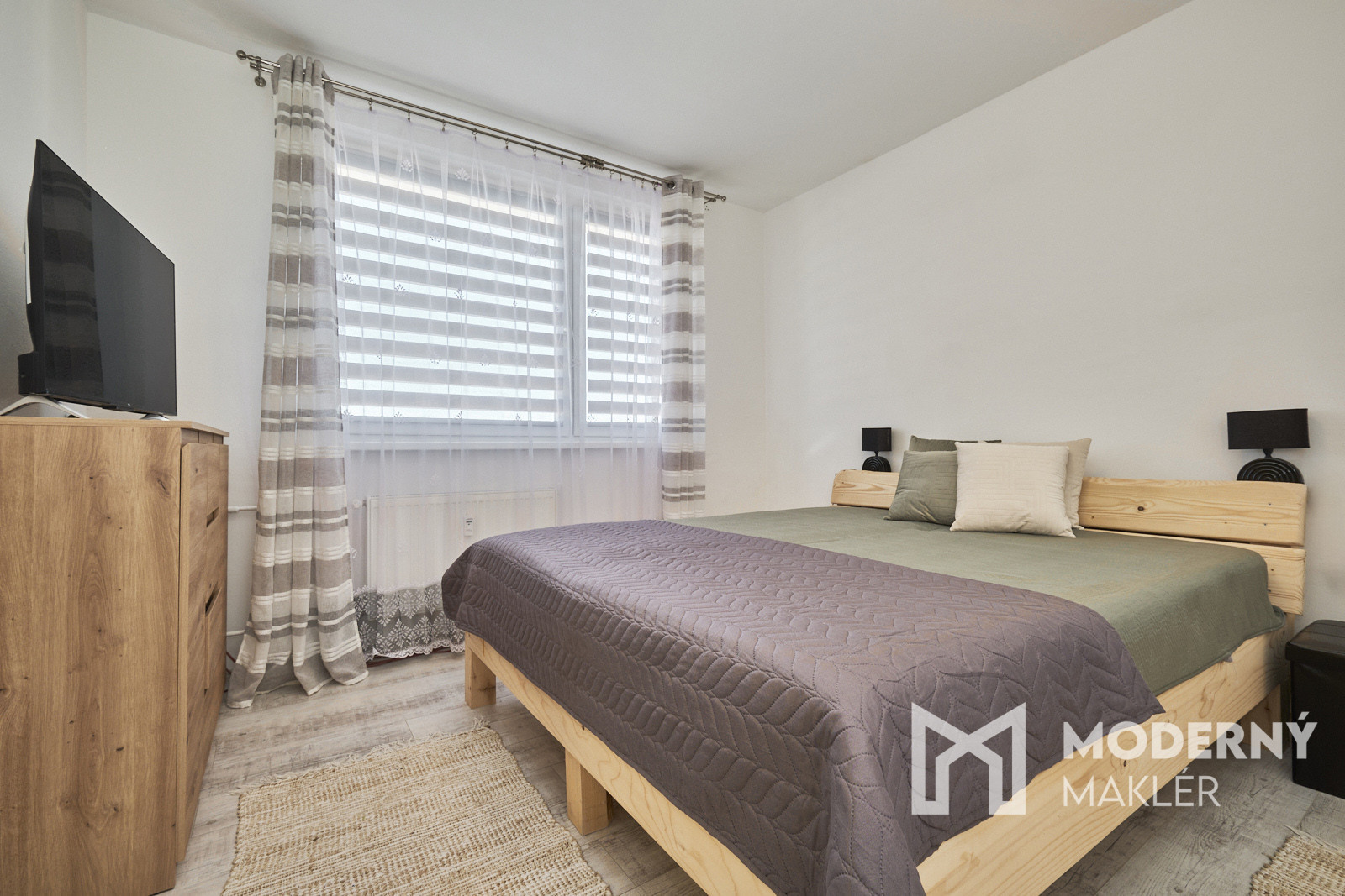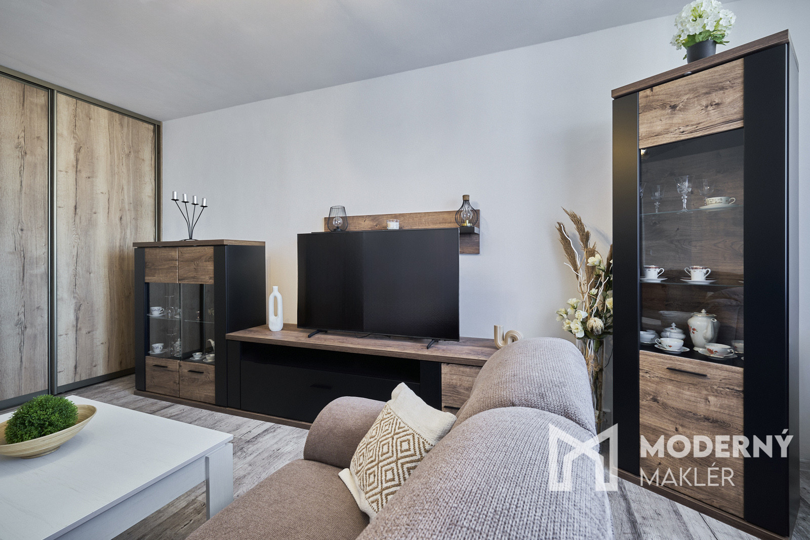 Nehnuteľnosť sa predáva kompletne zariadená. Kuchyňa je vybavená novou kuchynskou linkou so vstavanými spotrebičmi vrátane umývačky riadu, mikrovlnnej rúry a chladničky. Obývacia izba disponuje vkusným sektorovým nábytkom, sedacou súpravou a praktickou vstavanou skriňou. Spálňa je zariadená manželskou posteľou. Všetko vybavenie je nové a dodáva sa so zárukou.