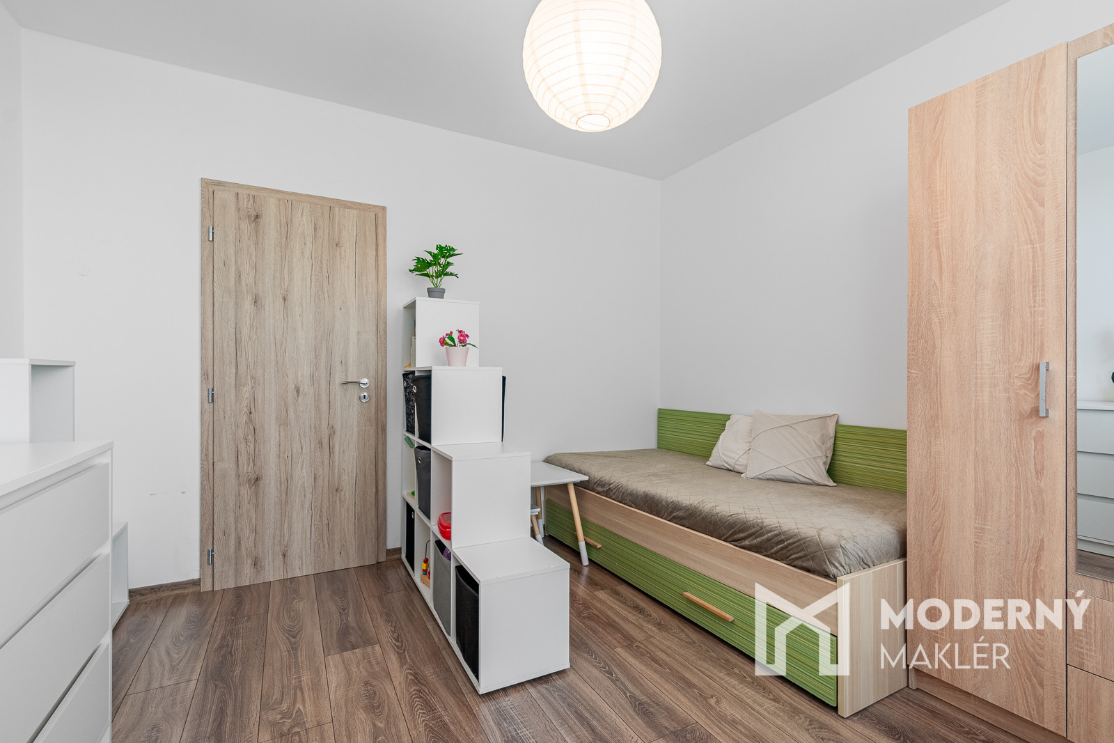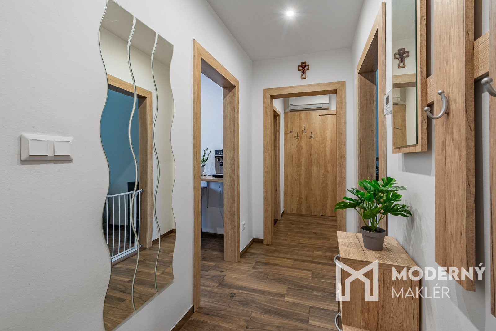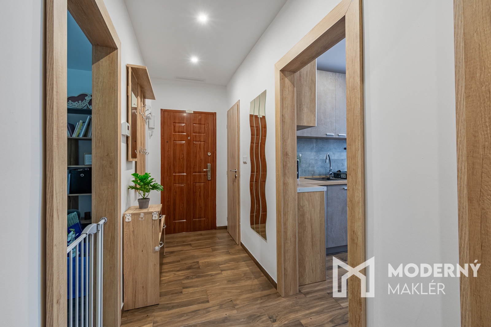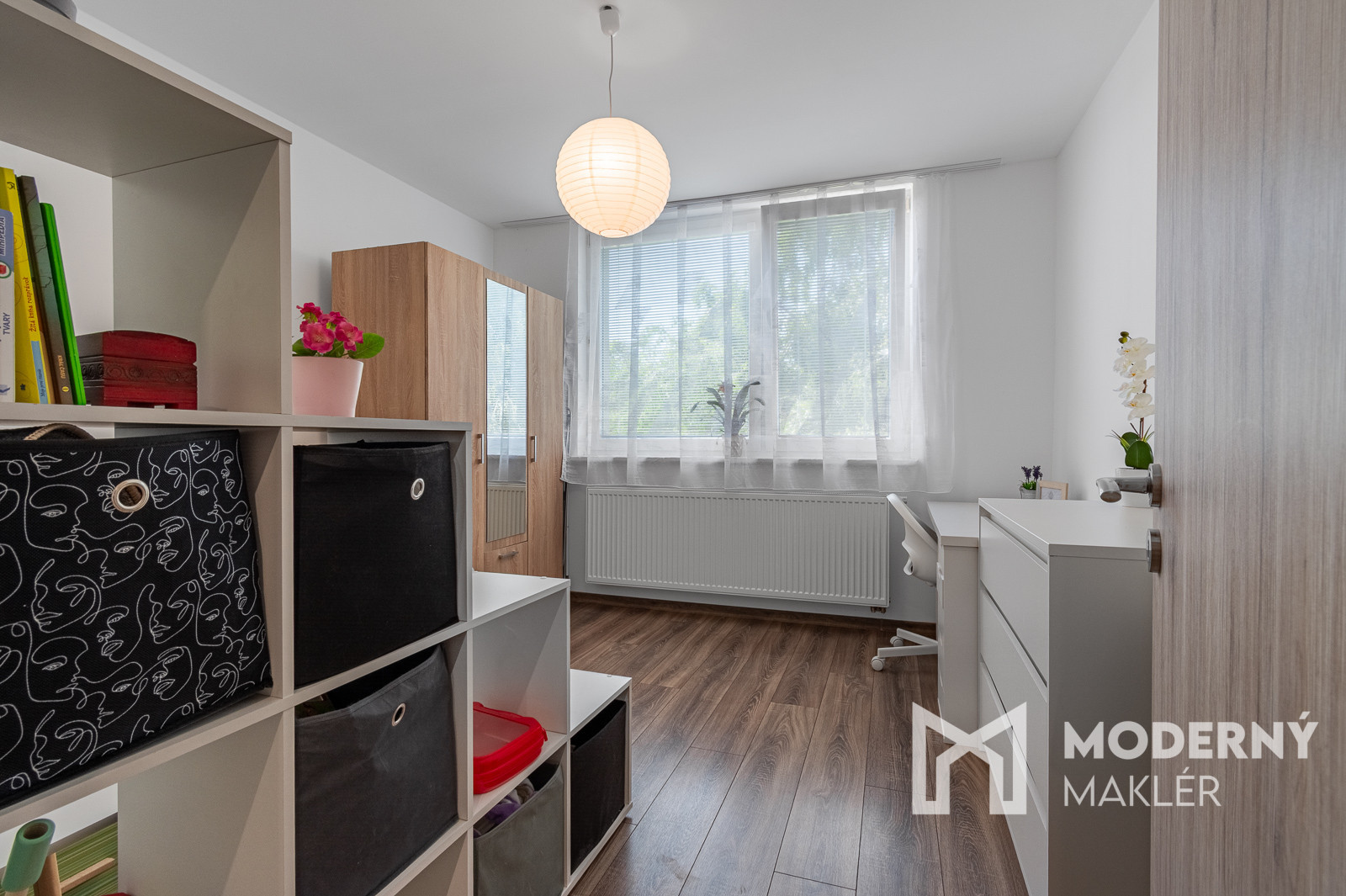 Nehnuteľnosť sa skladá z priestrannej vstupnej chodby, z ktorej sa dostanete do všetkých miestností. Po ľavej strane chodby sa nachádza samostatné WC, praktická kuchyňa so špajzou a spálňa s výstupom na balkón. Po pravej strane vstupnej chodby nájdete obývaciu izbu s východnou orientáciou, detstkú izbu a menšiu izbu s výstupom na logiu. Kúpeľňa je umiestnená na konci vstupnej chodby, čo zabezpečuje pohodlný prístup zo všetkých častí bytu.