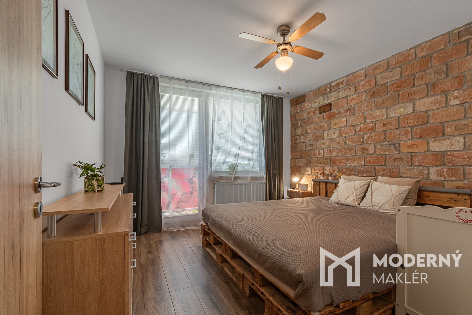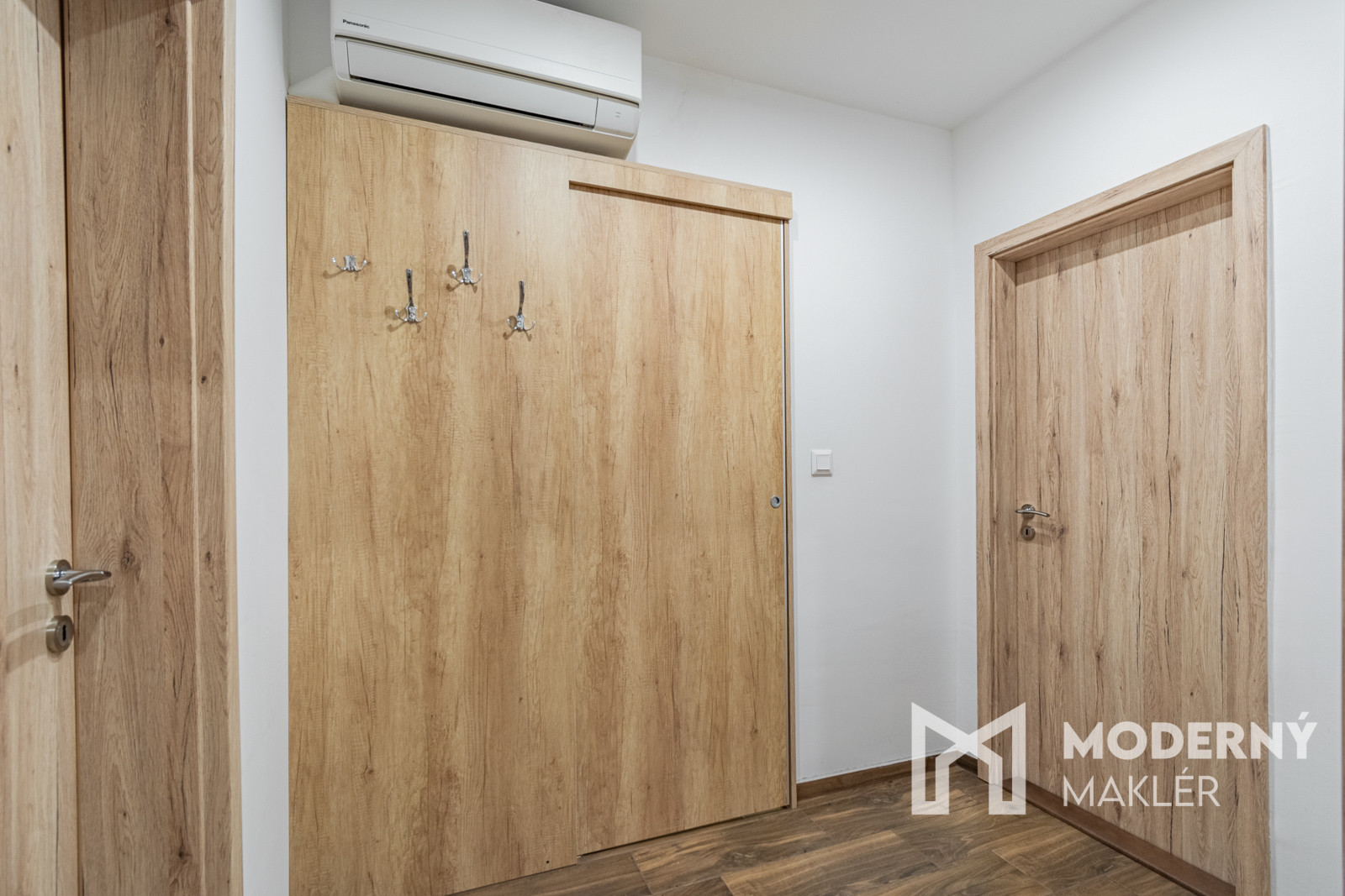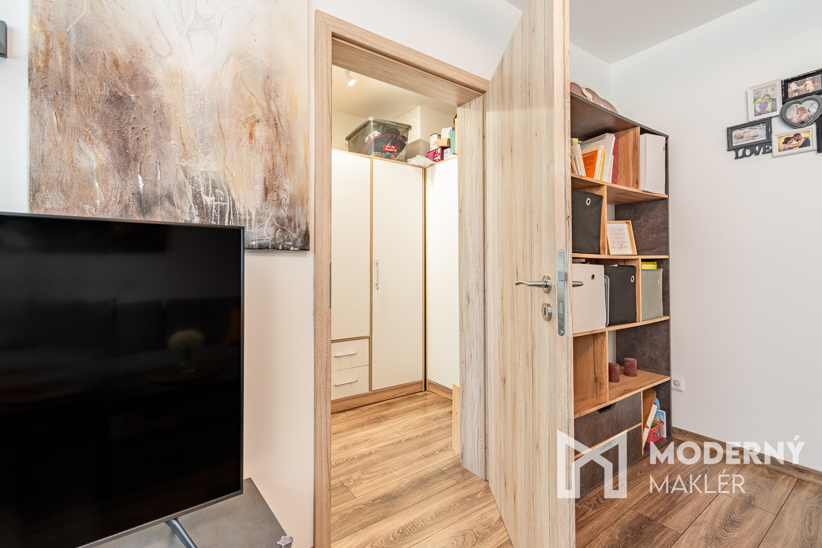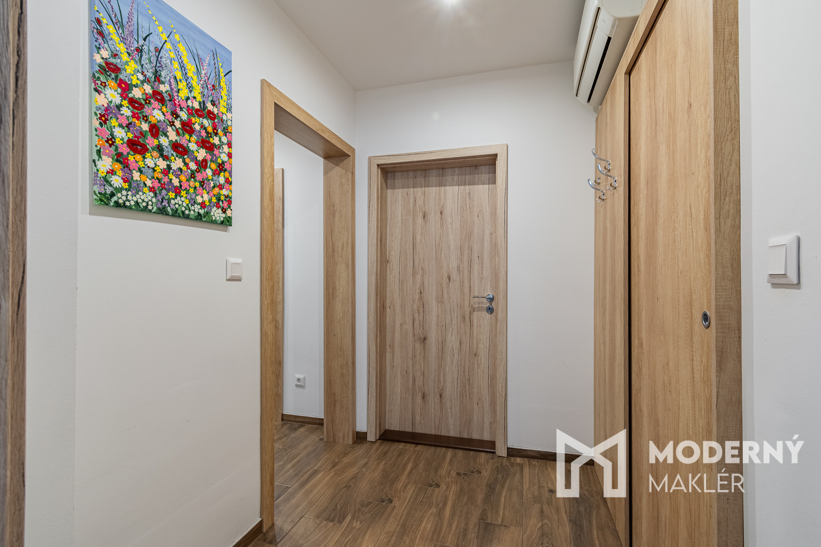 Nehnuteľnosť sa skladá z priestrannej vstupnej chodby, z ktorej sa dostanete do všetkých miestností. Po ľavej strane chodby sa nachádza samostatné WC, praktická kuchyňa so špajzou a spálňa s výstupom na balkón. Po pravej strane vstupnej chodby nájdete obývaciu izbu s východnou orientáciou, detstkú izbu a menšiu izbu s výstupom na logiu. Kúpeľňa je umiestnená na konci vstupnej chodby, čo zabezpečuje pohodlný prístup zo všetkých častí bytu.