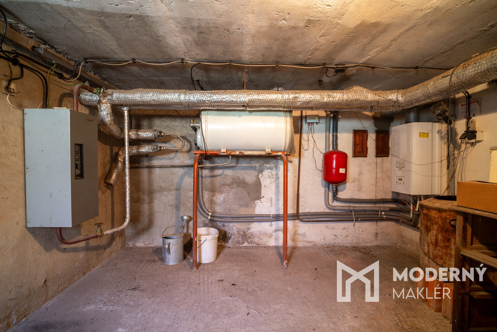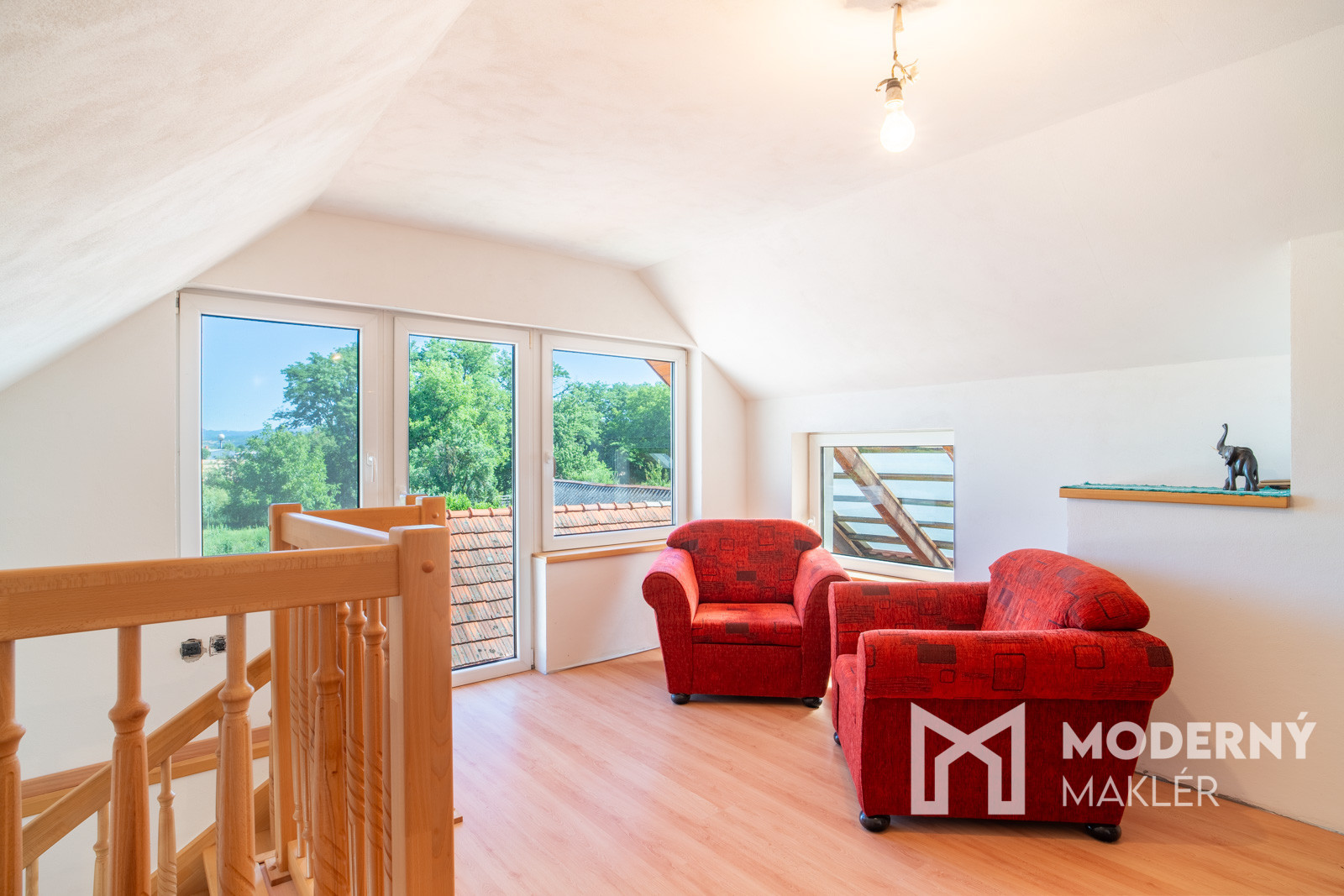 Dom pozostáva zo vstupnej chodby, z ktorej smeruje schodisko do podkrovia. Vľavo sa nachádza vstupná chodba, ktorá zabezpečuje prístup do všetkých miestností domu. Prízemie ponúka praktické riešenie denných aktivít. Nájdete tu špajzu, kúpeľňu s WC, bezbariérovým sprchovým kútom a umývadlom. Dominantou prízemného podlažia je veľká jedáleň prepojená s obývacou miestnosťou, ktorá vytvára priestranný spoločenský priestor. Samostatná kuchyňa s menšou jedálenskou časťou poskytuje komfort pri príprave jedál. Z kuchyne sa dostanete do prvej spálne domu. Podkrovie je prístupné po schodoch a ponúka galériu s možnosťou vytvorenia knižnice, sedenia alebo malej kuchynskej linky, na ktorú sú pripravené všetky potrebné prípojky. Cez chodbu sa dostanete do kúpeľne so sprchovým kútom a WC s umývadlom. V tejto časti domu sa nachádzajú tri veľké slnečné plnohodnotné izby orientované na juhovýchod, ktoré poskytujú výborné svetelné podmienky počas celého dňa. Na pozemku je veľký prístrešok vhodný na kryté parkovanie áut + samostatná zamykateľná garáž. Ako bonus je kamenná vínna pivnica.