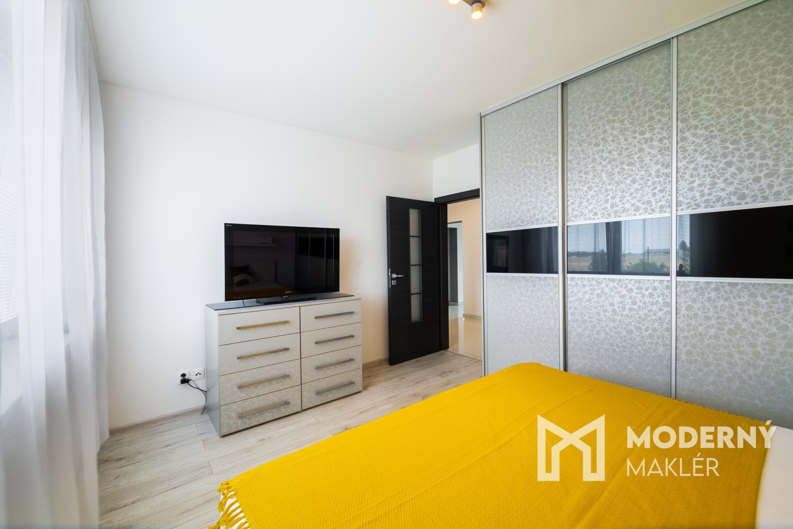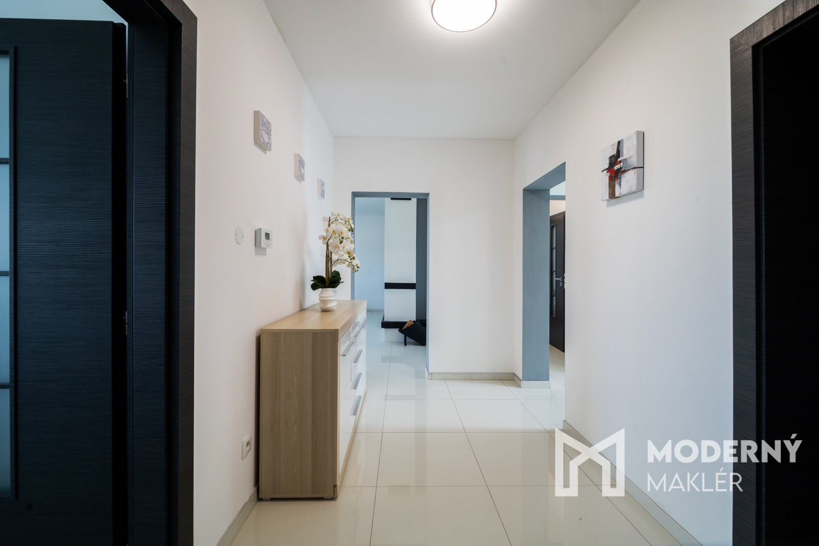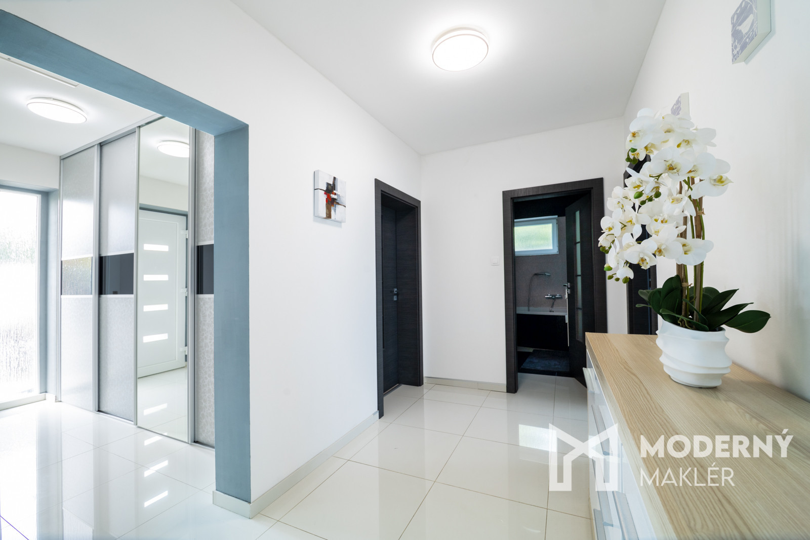 Rodinný dom sa skladá z priestrannej vstupnej chodby s bohatým úložným priestorom, ktorá tvorí centrálny vstupný bod nehnuteľnosti. Z hlavnej chodby sa nachádza po pravej strane hosťovská izba, pred ktorou je umiestnená samostatná kúpeľňa s WC a technickým zázemím. Ďalej z hlavnej chodby vedú samostatné vstupy do hlavnej spálne, detskej izby ktorá v súčasnosti slúži ako odkladací priestor, do hlavnej kúpeľne domu vybavenej WC a vaňou. Hlavným vstupom z chodby sa dostanete do centrálnej časti domu - priestrannej obývacej časti spojenej s kuchynskou a jedálenskou časťou, z ktorej je výstup na terasu a do dvora. Nehnuteľnosť má výhodnú orientáciu na juh a juhozápad, čo zabezpečuje dostatočné presvetlenie prirodzeným svetlom počas celého dňa.