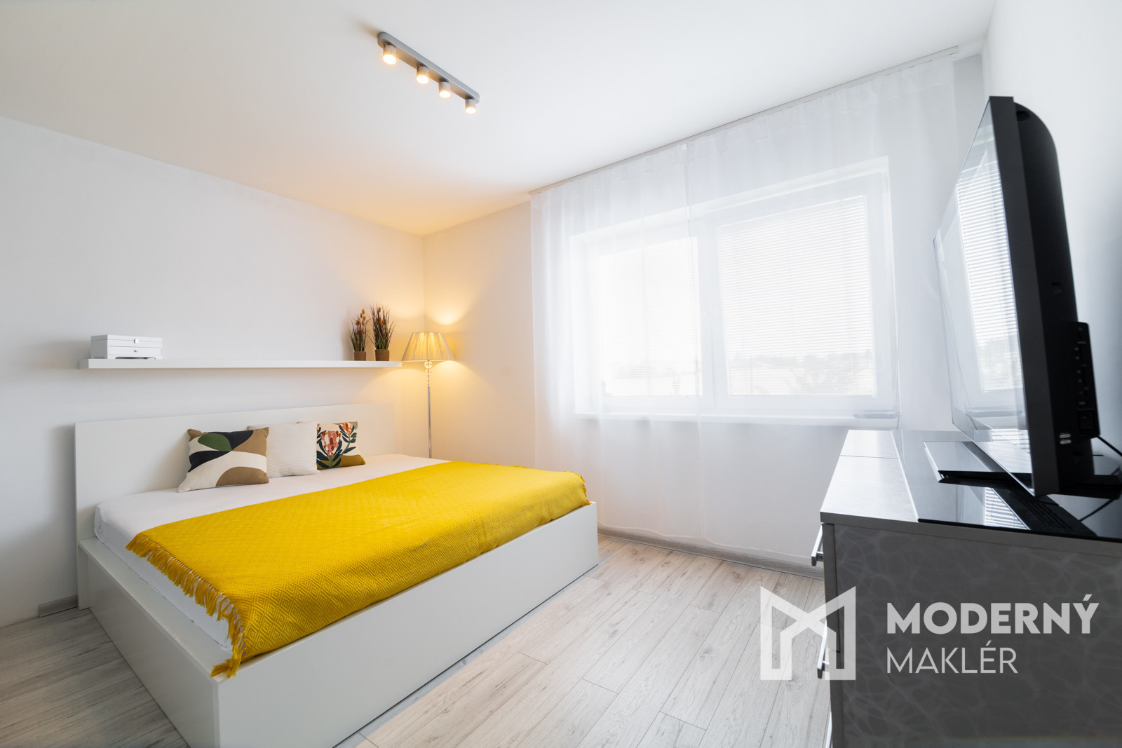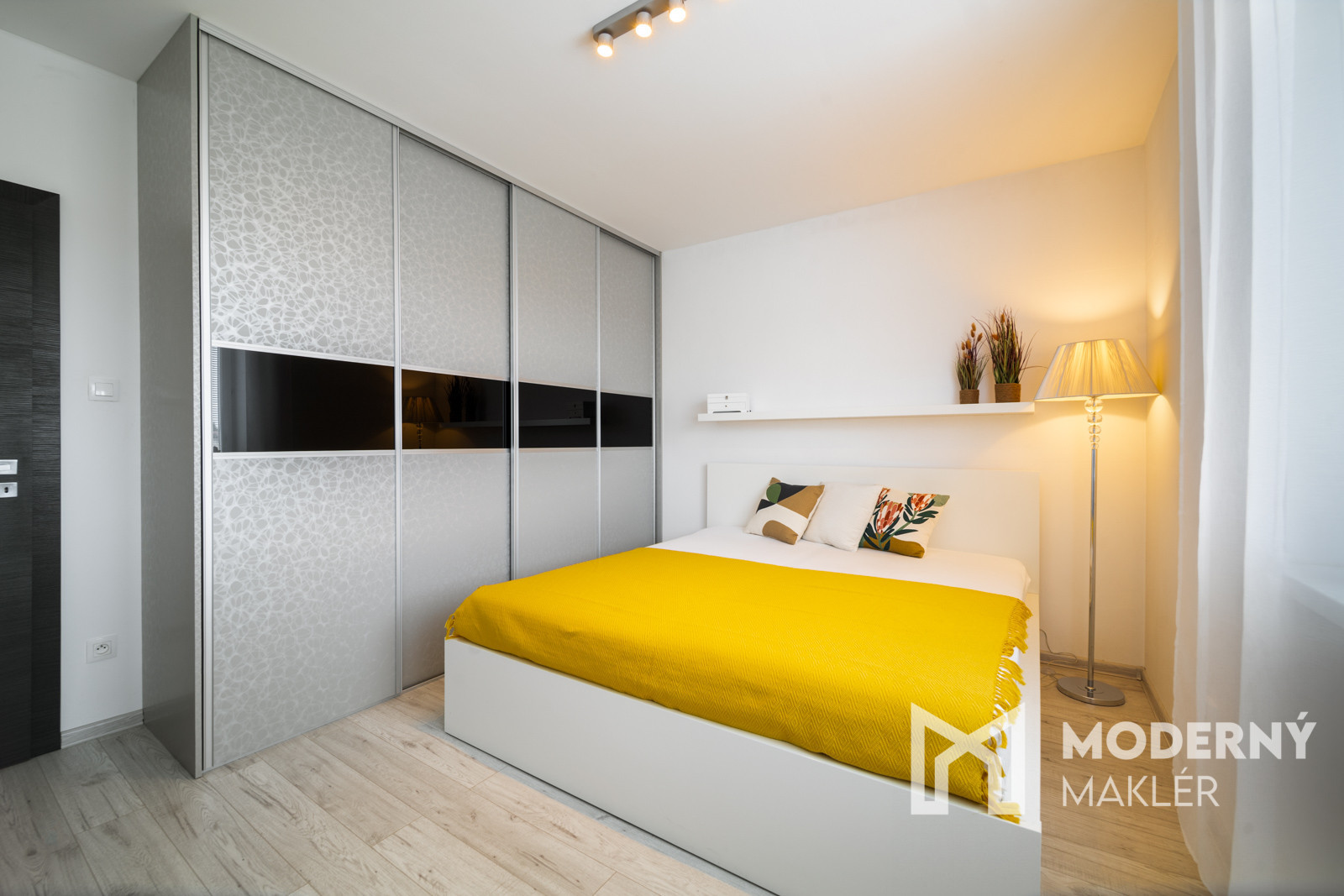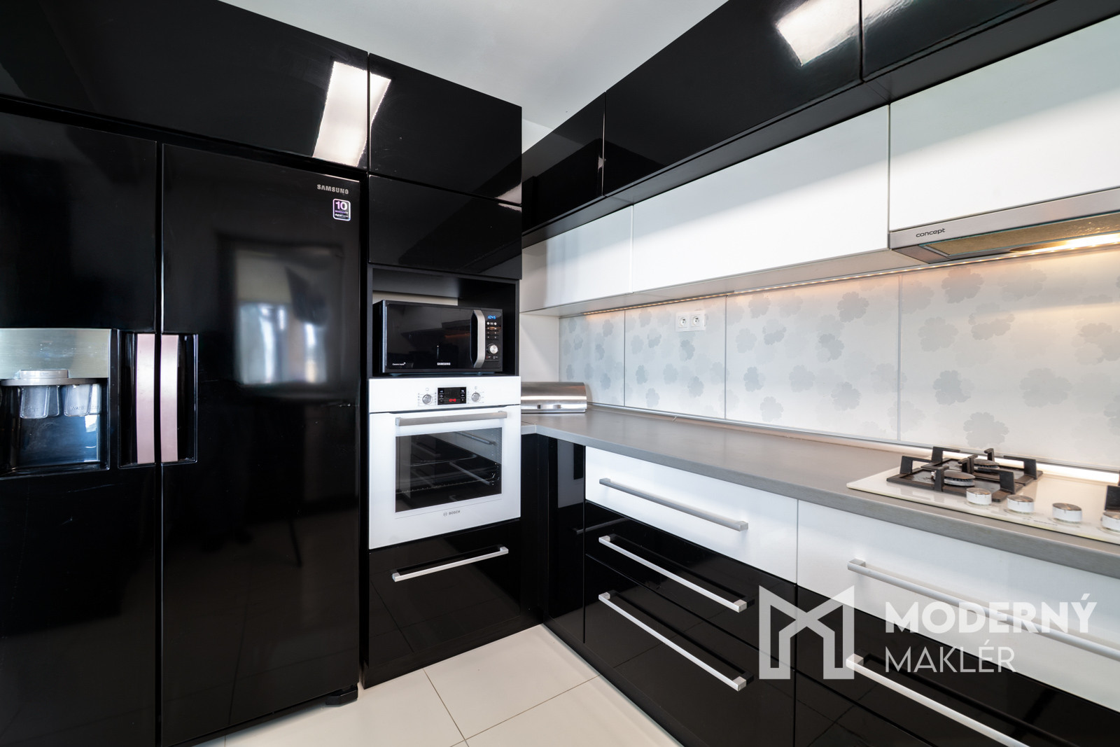 Byt sa predáva čiastočne zariadený. Vo vstupnej chodbe sa nachádzajú vstavané skrine a komoda pre praktické uloženie vecí. Kuchyňa je vybavená kuchynskou linkou na mieru so spotrebičmi, barovým pultom a jedálenským stolom so stoličkami. V obývacej časti je umiestnená sedacia súprava s konferenčným stolíkom, komoda pod televízor a krb, ktorý vytvára útulnú atmosféru. Hlavná spálňa je zariadená manželskou posteľou, vstavanými skrinami, komodou a televízorom. Hlavná kúpeľňa disponuje umývadlovou skrinkou. Hosťovská izba je vybavená manželskou posteľou, nočnými stolíkmi a komodou.