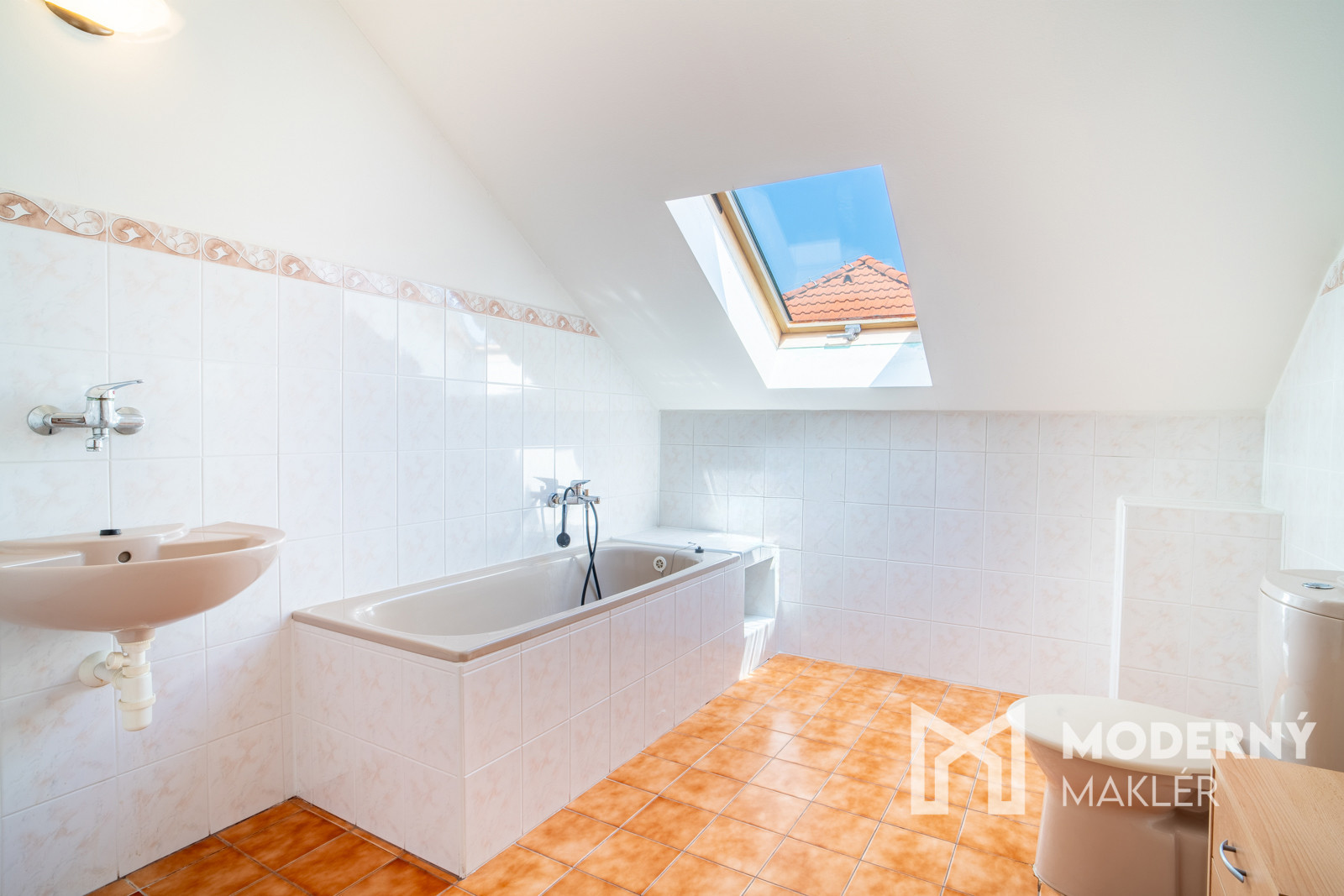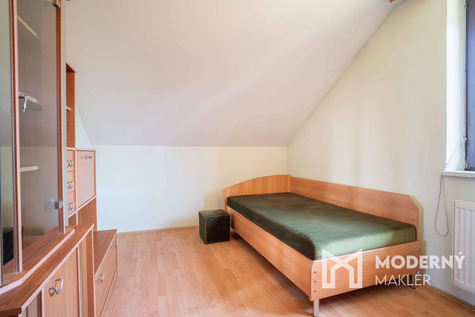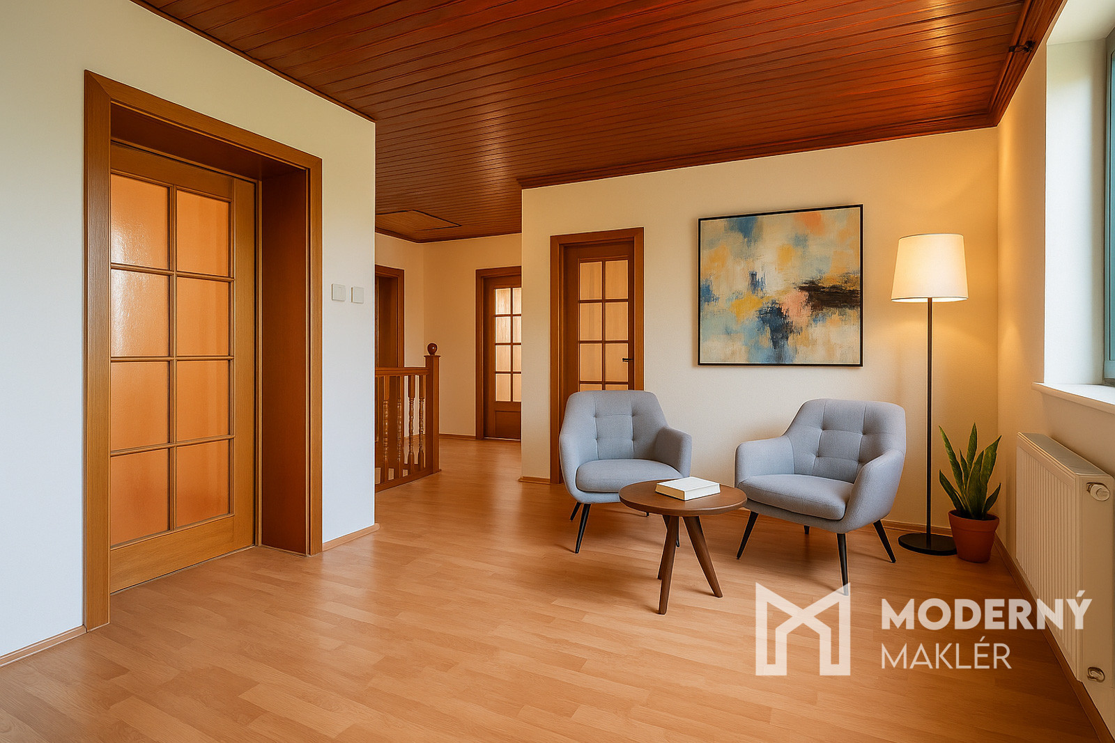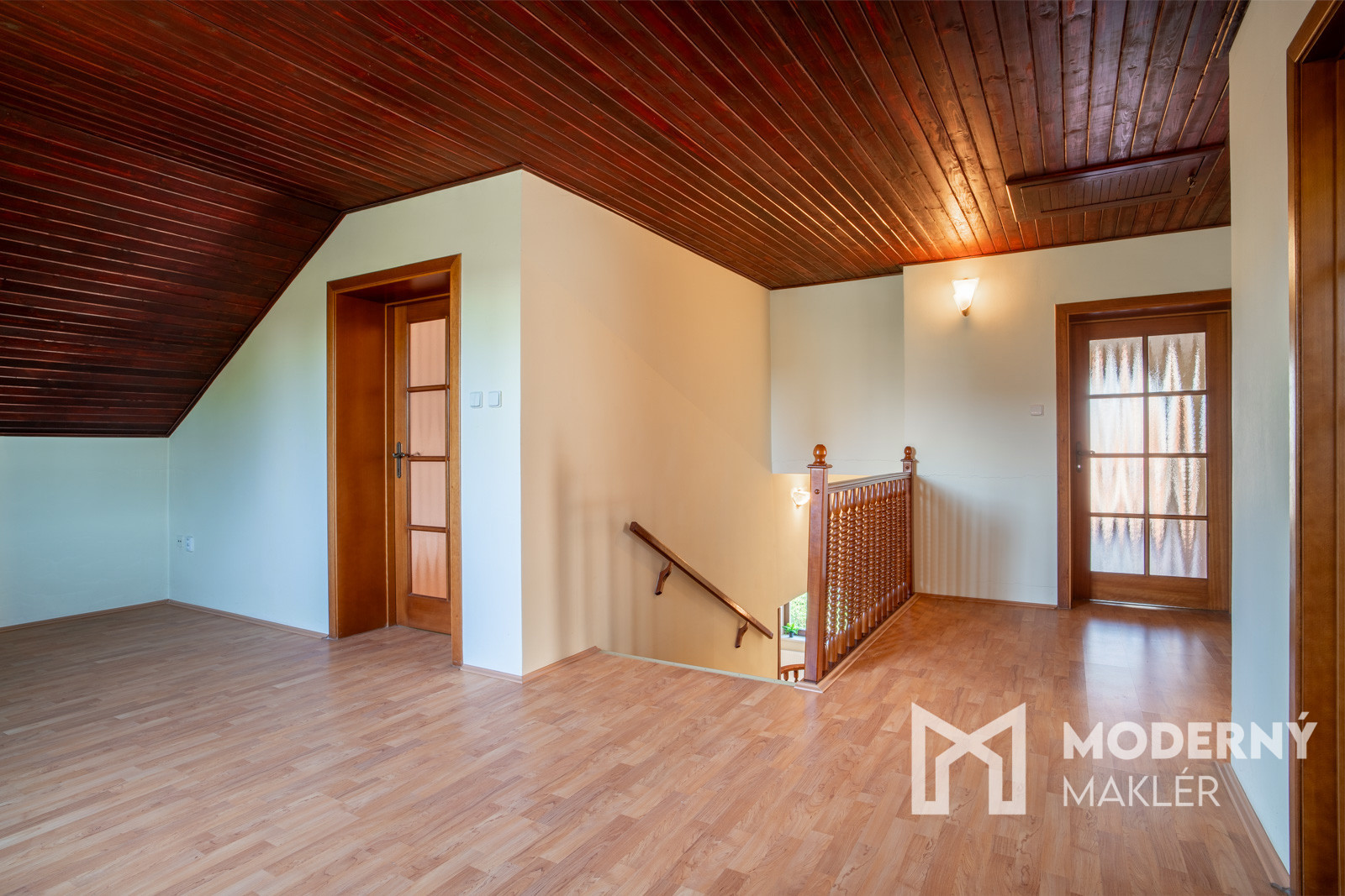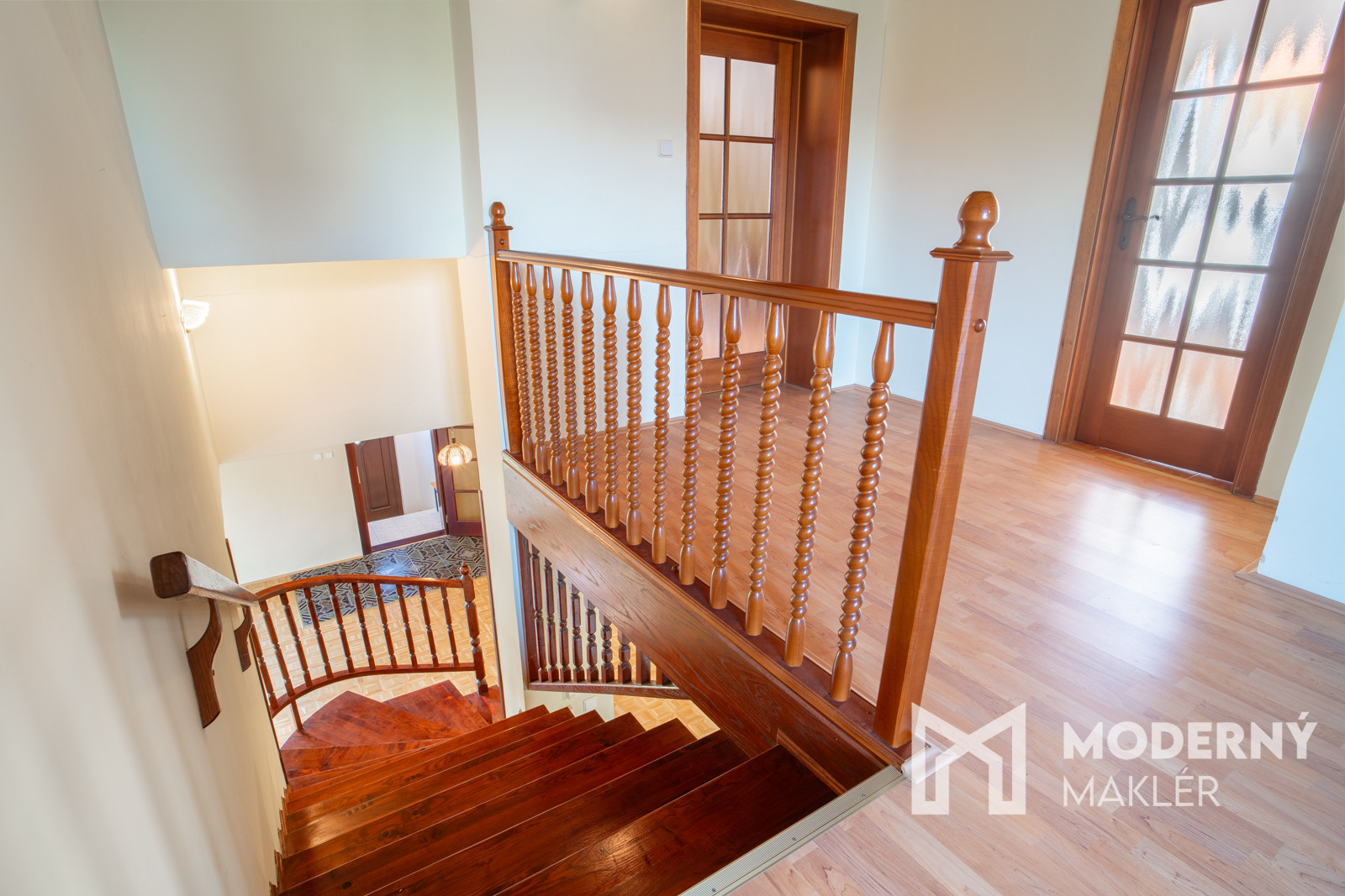 Na poschodí dominuje nádherná otvorená galéria, z ktorej sa dostanete do ďalších priestorov. Nájdete tu izbu s východom na priestranný balkón, hosťovskú izbu a kúpeľňu s WC a vaňou. Ďalej sa tu nachádza priestranná izba so zabudovaným odkladacím priestorom a výstupom na balkón. Z poschodia máte tiež prístup na podkrovie slúžiace ako odkladací priestor.