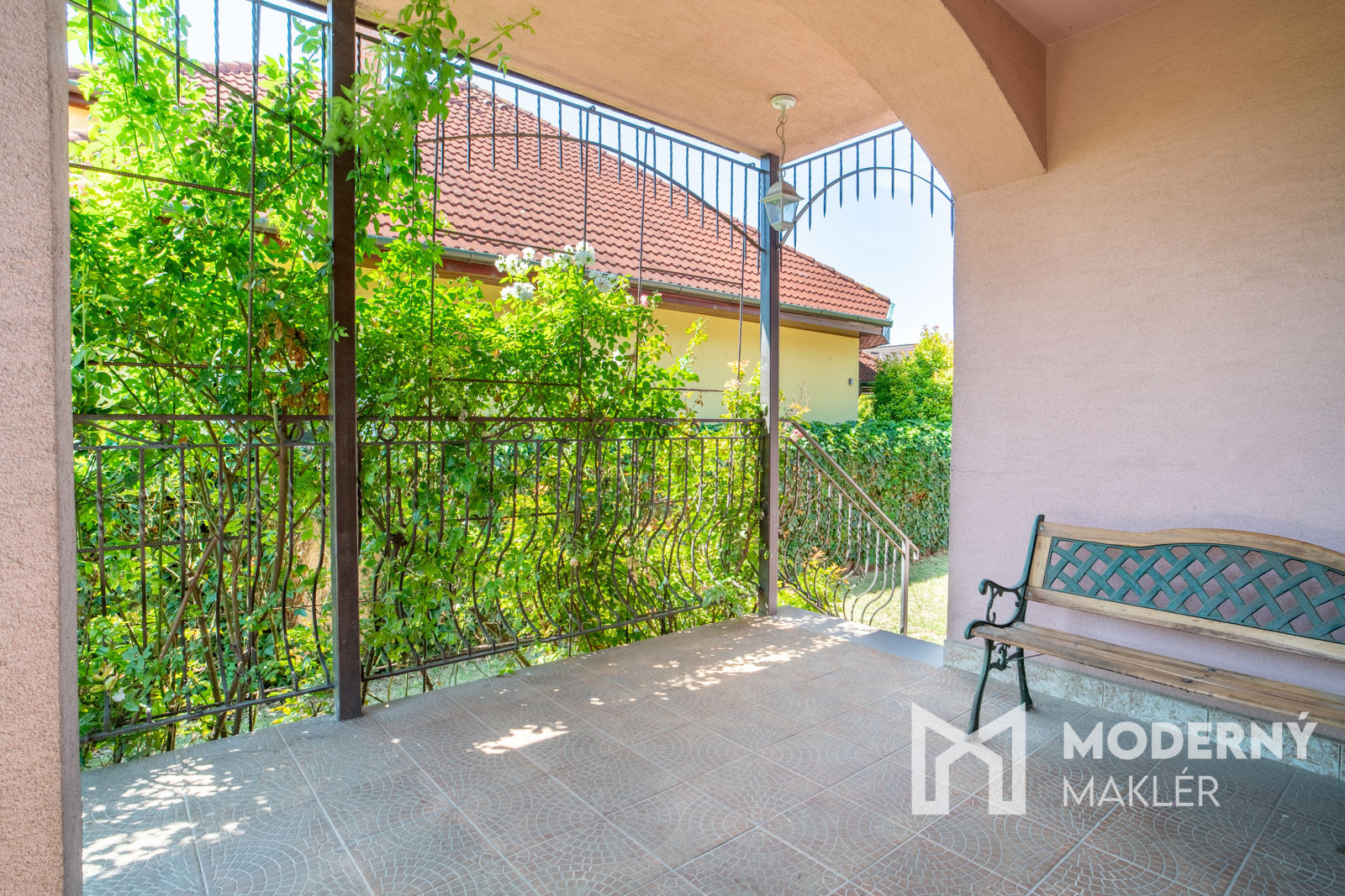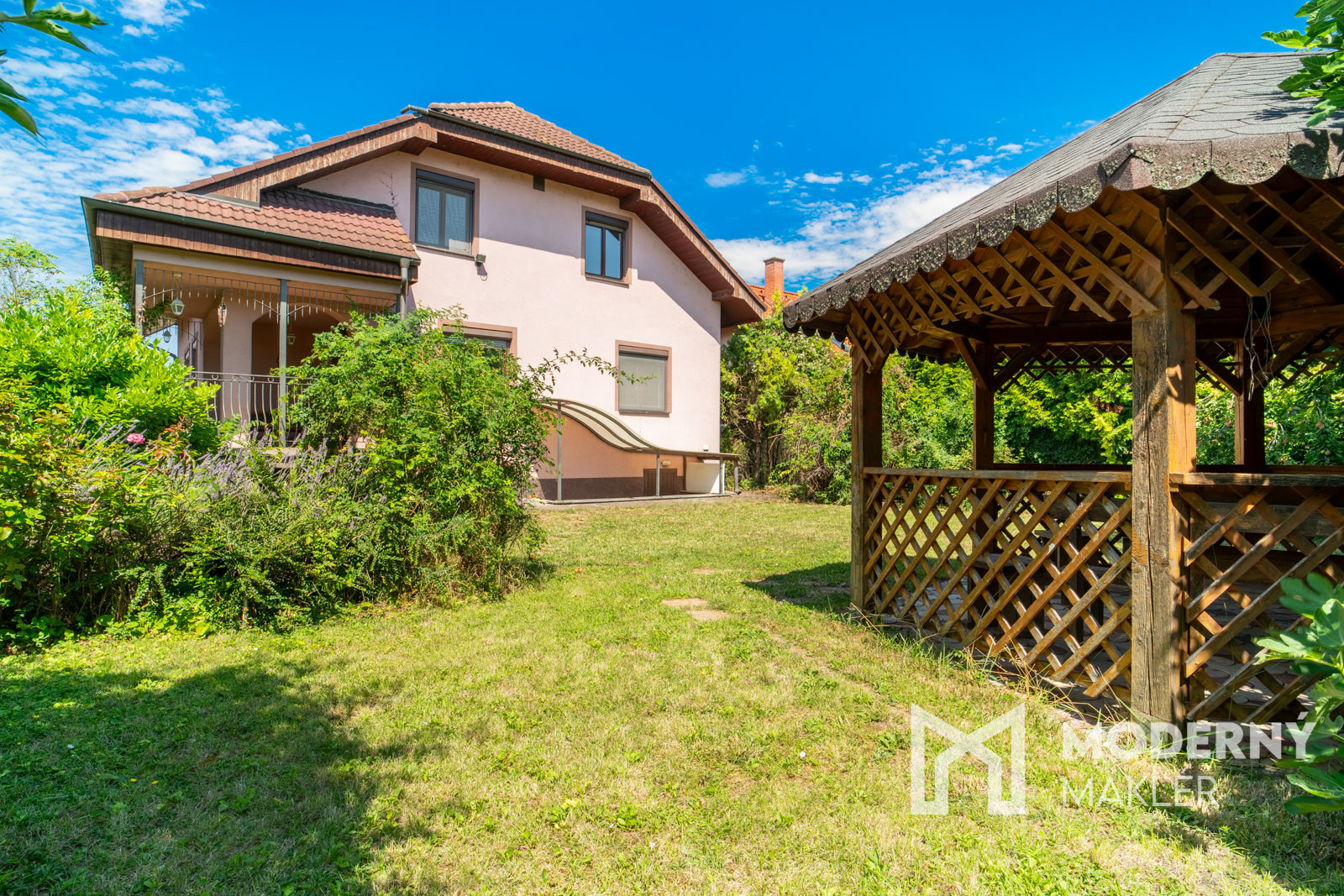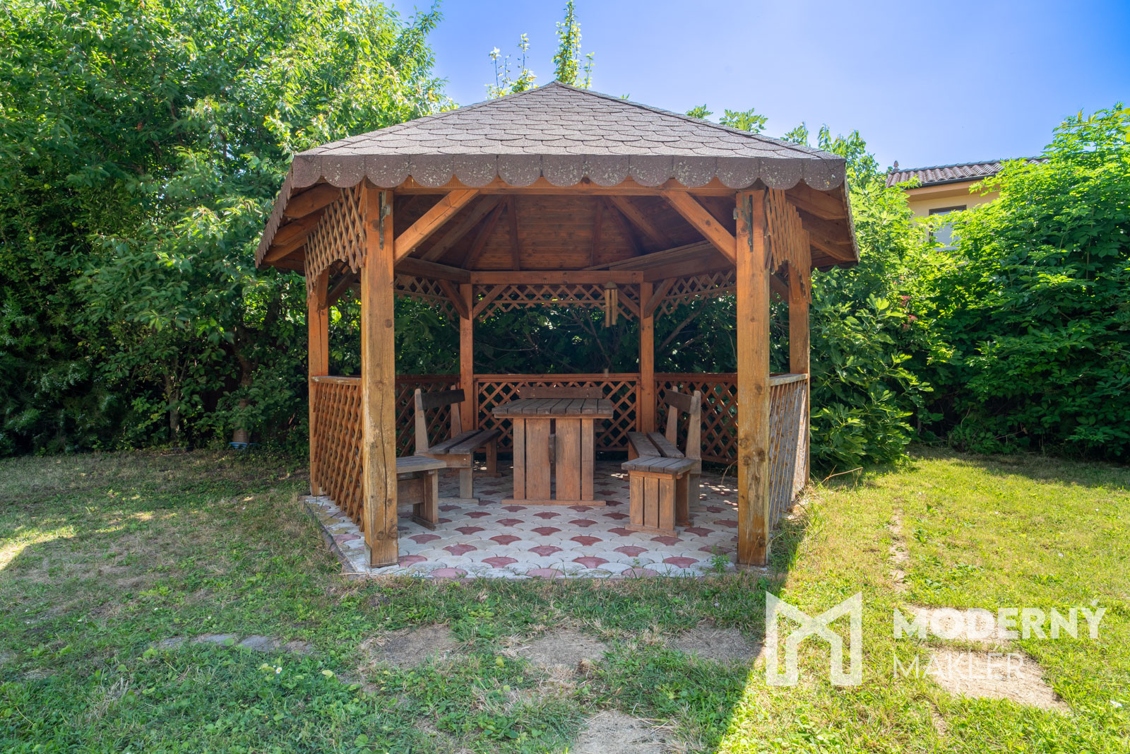 Záhrada, ktorá obklopuje dom , je malým rajom na zemi. Udržiavaná zeleň a rozmanitá dospelá vegetácia od hrušiek, jabloní, dúl, veľkých fíg a bazy, cez popínavé ruže, voňavú levanduľu a rakytník až po vinič, ktorý v letných mesiacoch ponúka sladké plody a tieň-vytvárajú čarovné zákutia na oddych. Nechýba ani praktický záhradný domček, ktorý poskytuje priestor na náradie a doplnky. Na záhrade sa nachádza krásny drevený altánok vyrobený na mieru pre chvíle strávené s rodinou .