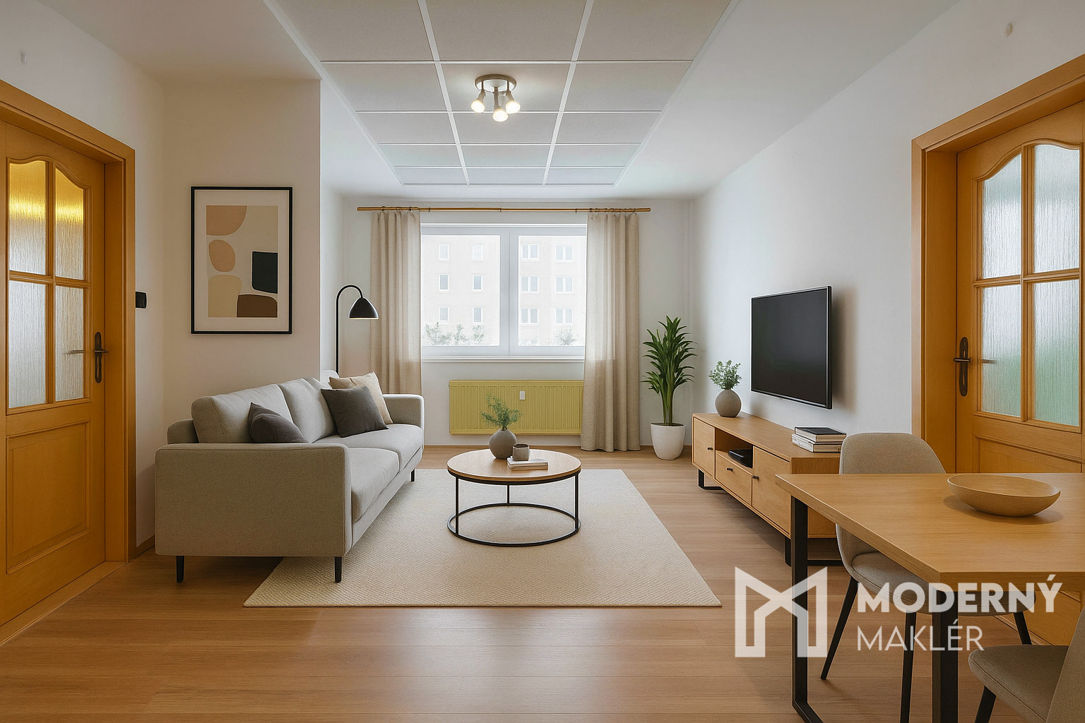 Byt prešiel čiastočnou rekonštrukciou s úpravou pôvodnej dispozície. Po vstupe do bytu sa nachádza priestranná obývacia izba spojená s kuchyňou, pričom pôvodná vstupná chodba bola zrušená a vznikol veľkorysý otvorený priestor. V byte nájdete priestrannú kúpeľňu s oknom, ktorá vznikla z pôvodnej kuchyne, a samostatnú toaletu. Z otvorenej obývacej izby sa dostanete do dvoch izieb - detskej izby alebo spálne s výstupom na balkón. Byt má výhodnú orientáciu - kúpeľňa je orientovaná na sever, zatiaľ čo všetky tri izby sú otočené na slnečnú južnú stranu. Orientácia zabezpečuje úsporu tepla hlavne v zimných mesiacoch a dostatok prirodzeného svetla počas celého roka. Byt je možné kúpiť so zariadením ako je vidno na fotkách alebo nezariadený.