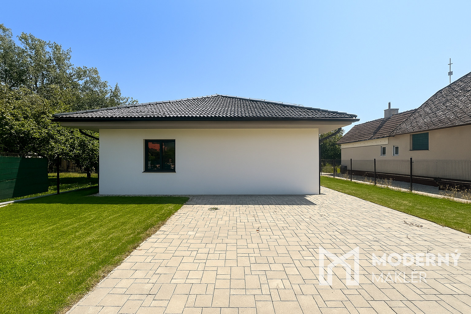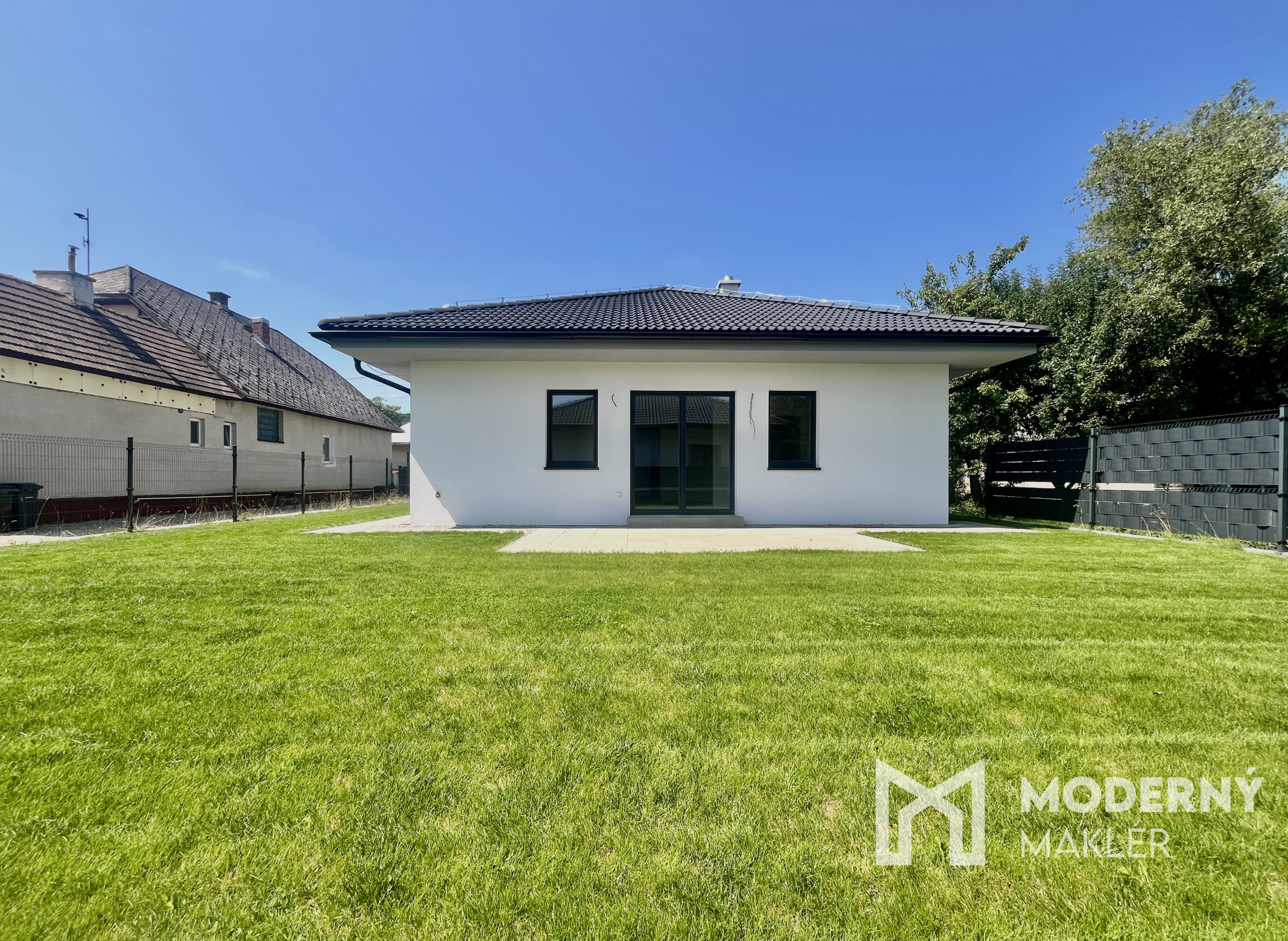 Stavba je založená na zaizolovanej základovej platni, s nosnými obvodovými stenami z ytongu hrúbky 37,5 cm. Strop a valbová strecha sú dokončené, pričom strecha je pokrytá kvalitnou betónovou škridlou. Okná sú plastové, vchodové dvere hliníkové, a všetky vonkajšie aj vnútorné steny a stropy majú finálne povrchové úpravy. Tepelný komfort zabezpečuje podlahové kúrenie v kombinácii so zateplením systémom Baumit (12 cm polystyrén), čo zaručuje nízke prevádzkové náklady. Dom je vybavený kompletnou elektroinštaláciou so zásuvkami a vypínačmi, bleskozvodom, rozvodom vody, kúrenia a kanalizácie, funkčným komínom a všetkými inžinierskymi sieťami – elektrina, voda, kanalizácia aj plyn sú zavedené priamo do objektu. Exteriér dotvára upravené okolie so zámkovou dlažbou a prístupovým chodníkom, čím sa podčiarkuje celkový moderný a praktický charakter domu. Nehnuteľnosť sa predáva v štádiu holodomu, čo novému majiteľovi umožňuje dokončenie podľa vlastných predstáv. Ostáva zrealizovať montáž kuchynskej linky, vnútorných dverí a zárubní, sanity, podláh a svietidiel.