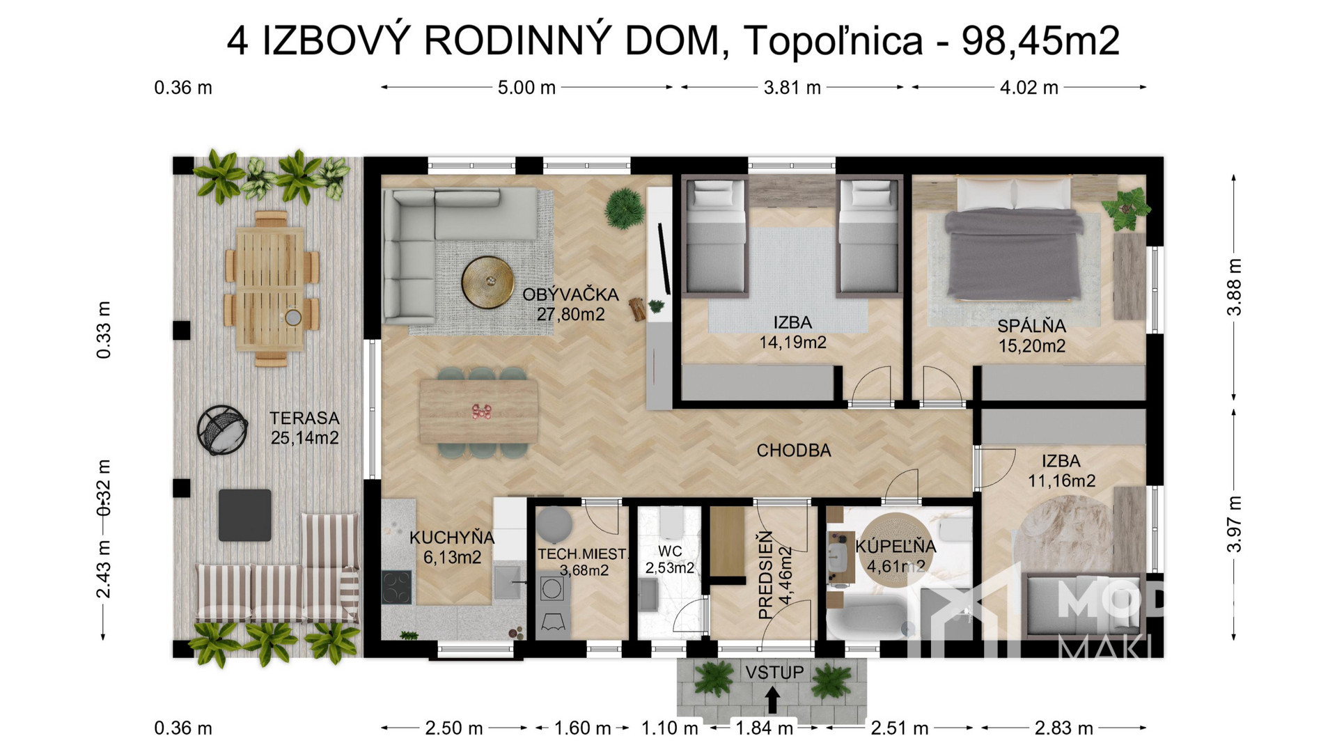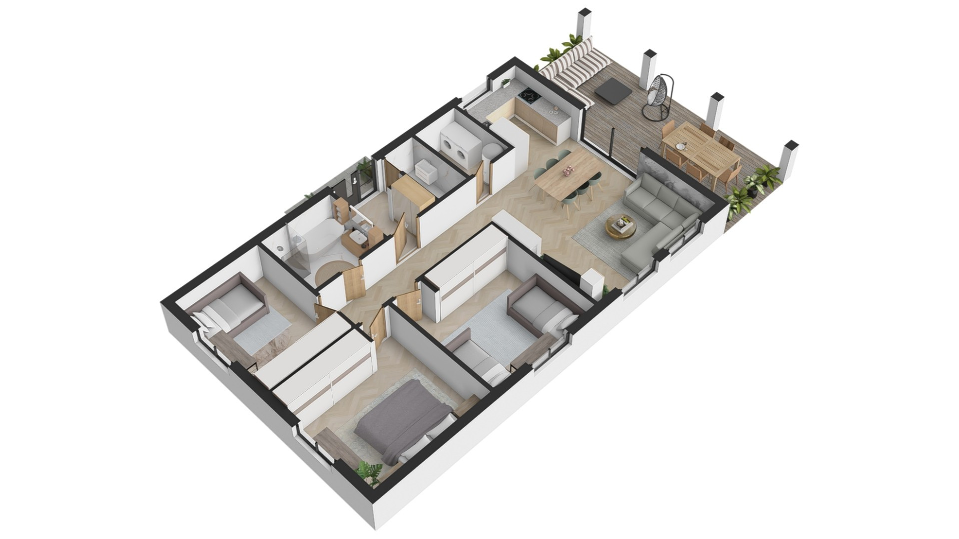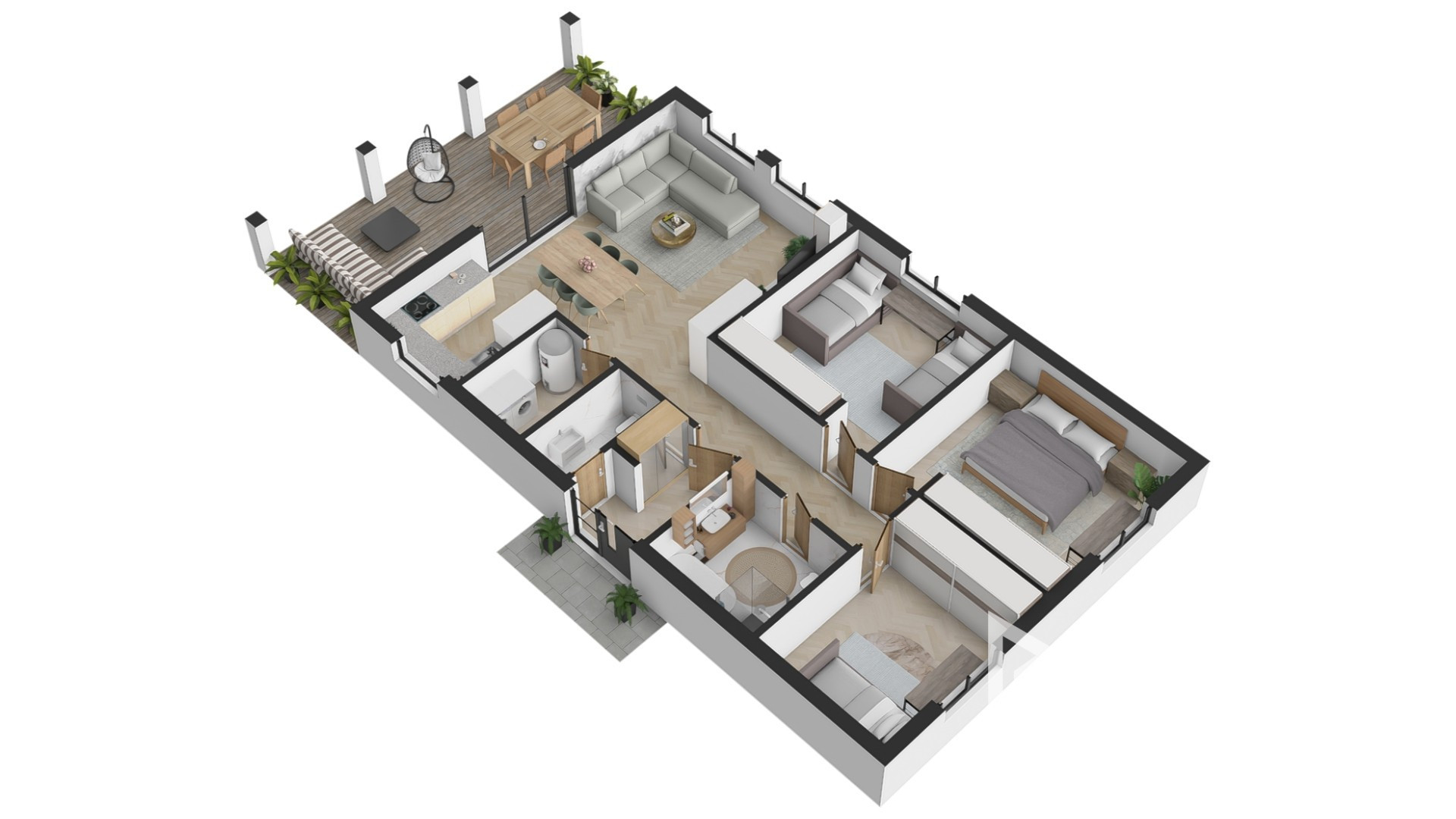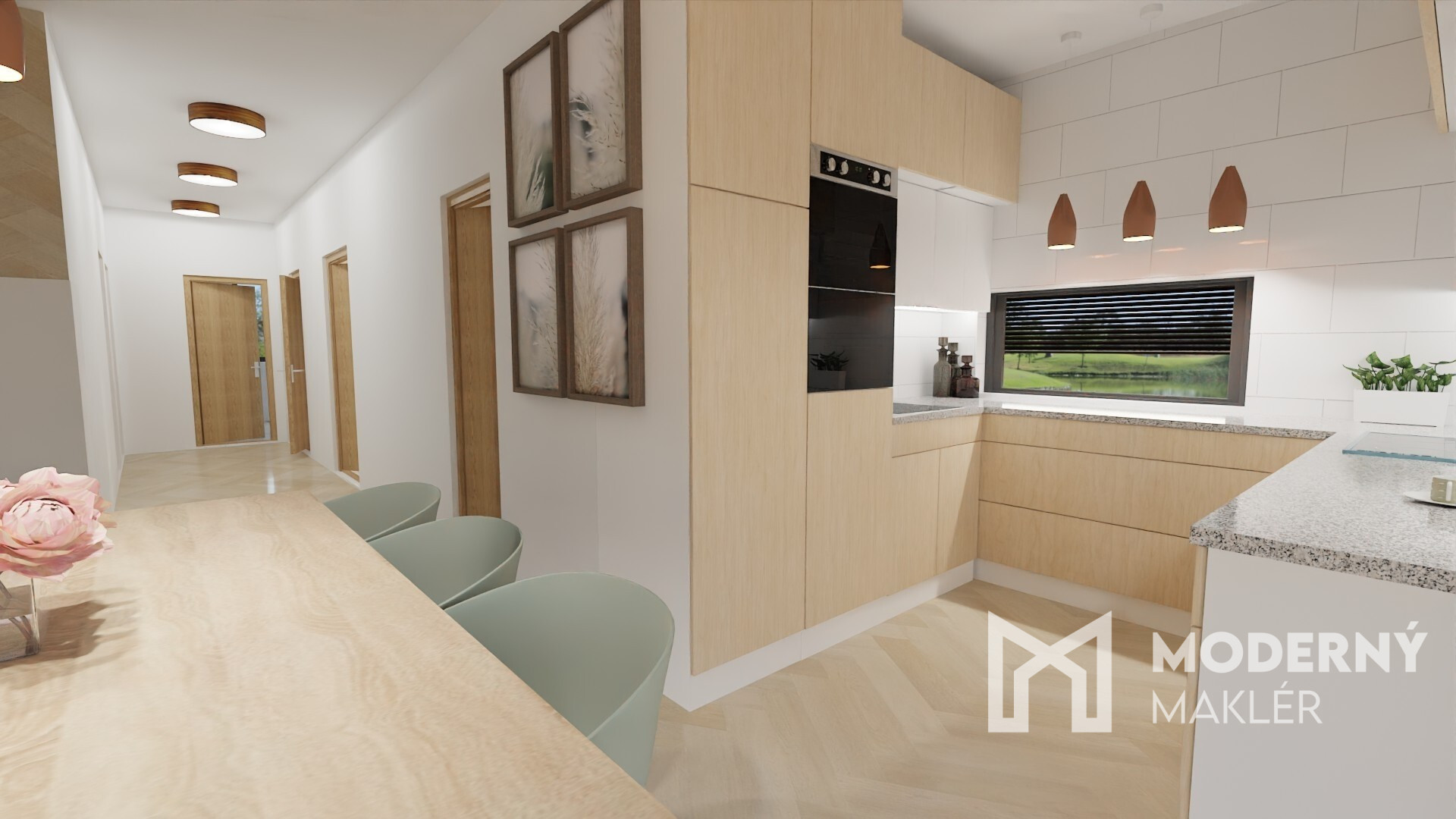 Rodinný dom pozostáva zo vstupnej chodby, ktorá vedie do hlavnej chodby domu, z ktorej sa dostanete do všetkých miestností. Nehnuteľnosť ponúka dve detské izby, spálňu, kúpeľňu, samostatné WC, technickú miestnosť a priestrannú dennú zónu pozostávajúcu z kuchyne s jedálňou a obývacou miestnosťou. Denná zóna je orientovaná na južnú stranu, čo zabezpečuje optimálne prirodzené osvetlenie počas celého dňa.