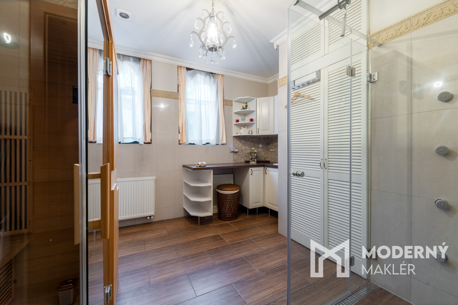 Nehnuteľnosť je zariadená kvalitnými materiálmi, ktoré spájajú nadštandard s pohodlím. Podlahy kombinujú drevo, laminát a keramickú dlažbu. Na prízemí sa nachádza pracovňa s rustikálnym nábytkom a pracovným stolom, obývacia izba s gaučom, konferenčným stolíkom a krbom, prepojená s kuchyňou z masívu so vstavanými spotrebičmi a praktickým ostrovom. Kúpeľne sú vybavené modernou sanitou vrátane vaní, sprchových kútov, umývadiel a bidetu. Hosťovská izba na poschodí je kompletne novo zariadená. Veľkým benefitom sú dve sauny, prvá je súčasťou kúpeľne s práčovňou, druhá sa nachádza v samostatnom domčeku prerobenom na súkromné fitness so sprchou a oddychovou časťou.