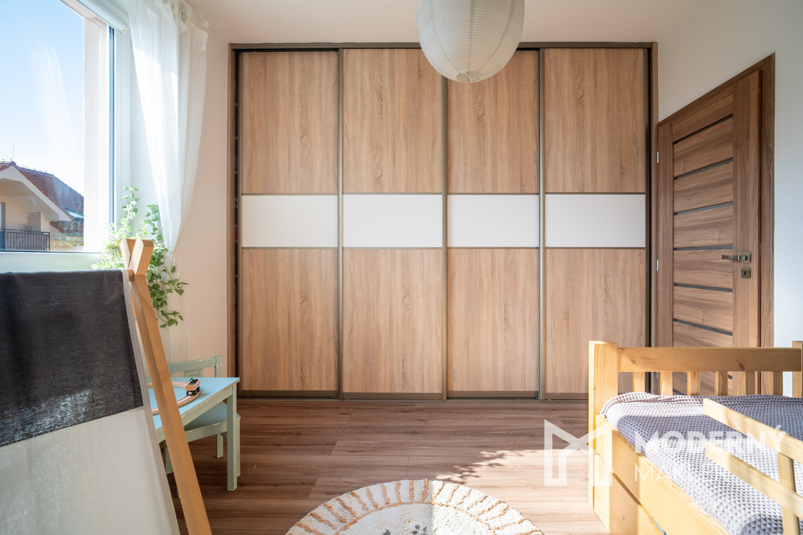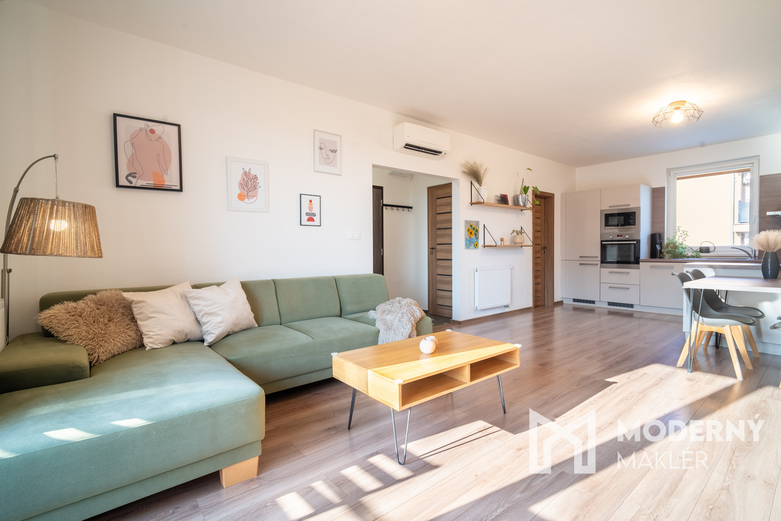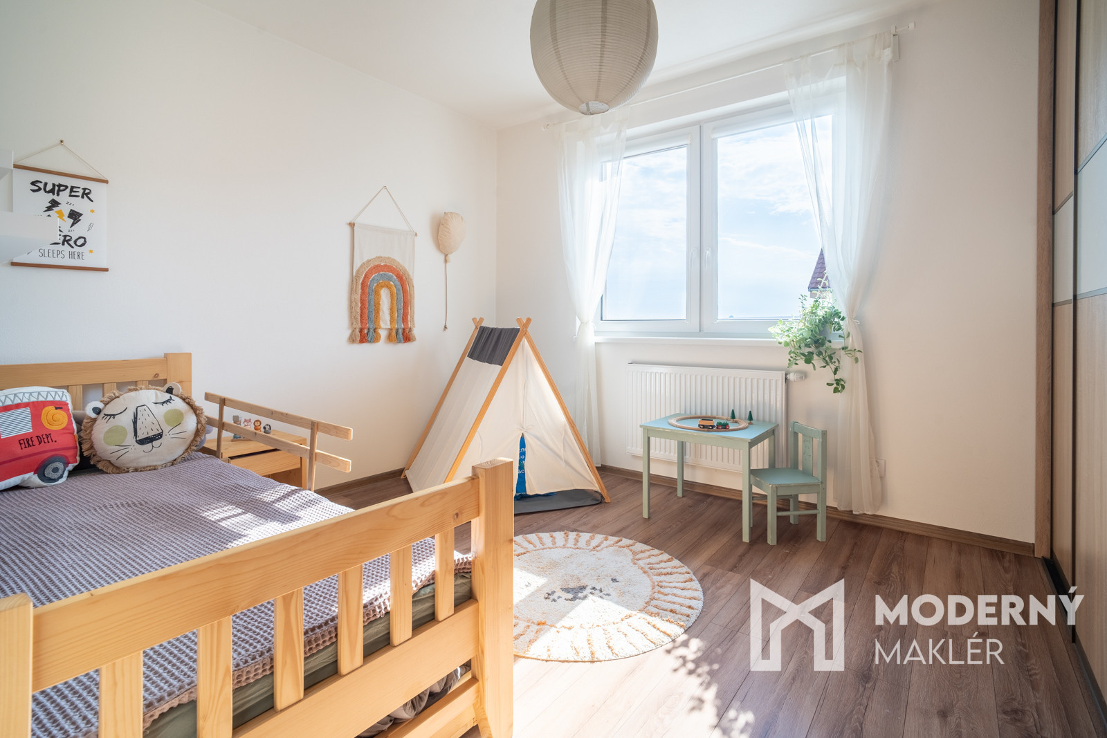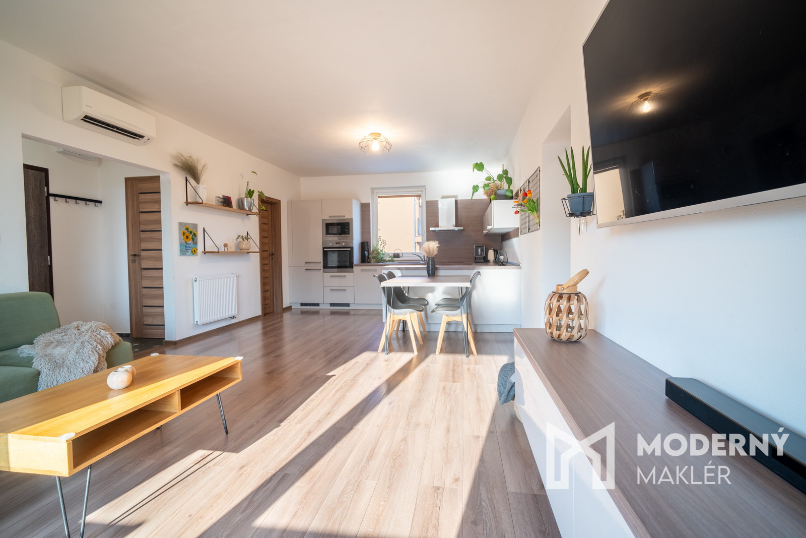 Byt pozostáva zo vstupnej chodby s chodbovou zostavou, z ktorej sa vpravo dostanete do veľkej technickej miestnosti s nadštandardným úložným priestorom. Technická miestnosť je vybavená plynovým kotlom s platnou revíziou a prípojkami na práčku a sušičku. Z chodby vľavo sa dostanete na samostatné WC s odvetraním. Hlavný priestor bytu tvorí priestranná denná zóna zlučujúca kuchyňu, jedáleň a obývaciu izbu s klimatizáciou. Kuchyňa je riešená v účkovom prevedení a je kompletne vybavená vstavaným spotrebičmi (chladnička, plynová rúra, mikrovlnka, varná doska, digestor a umývačka riadu). Kuchyňa orientovaná na východ má k dispozícii aj priestrannú špajzu, v ktorej sa nachádzajú praktické regále pre dodatočné úložné priestory. V obývacej časti nájdete skrinku pod televízor, má západnú orientáciu a umožňuje vstup na loggiu s prekrytím proti priamemu slnečnému svetlu. Z malej chodby sa dostanete do dvoch samostatných izieb. Spálňa s východnou orientáciou a detská izba sú obe vybavené vstavanou skriňou, čo zabezpečuje dostatok úložného priestoru. Kúpeľňa s južnou orientáciou je vybavená vaňou a skrinkami s ďaľším úložným priestorom. Súčasťou bytu je loggia so západným výhľadom s príjemným sedením.
