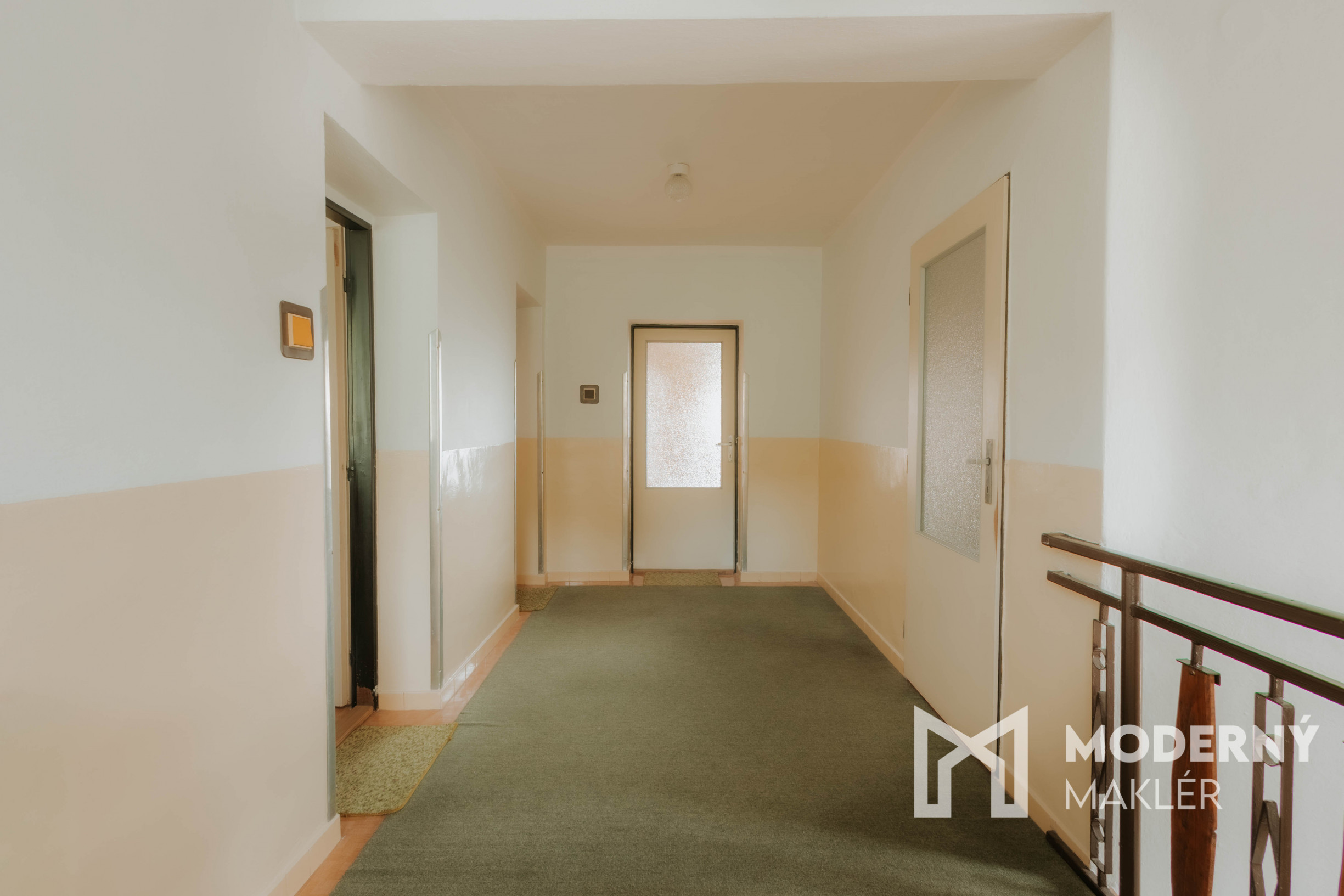 Rozľahlý dom sa vyznačuje veľkorysými chodbami a priestrannými miestnosťami rozdelenými na dve poschodia. Na prízemí sa nachádza vstupná chodba, ktorá vedie do samostatnej kuchyne a veľkej obývacej izby. Ďalej tu nájdete jednu izbu s balkónom, toaletu a veľké schodisko. Z prízemného podlažia máte priamy výstup na zadnú časť záhrady. Prvé poschodie disponuje obrovskou chodbou a tromi samostatnými veľkými miestnosťami, z ktorých dve majú balkóny. K nehnuteľnosti patrí samostatne stojaca veľká garáž s vlastným súpisným číslom a hospodárska budova, ktorá má takisto samostatné súpisné číslo. Dom je situovaný na tichej ulici a obrovský pozemok ponúka nekonečné množstvo možností na realizáciu vašich predstáv.