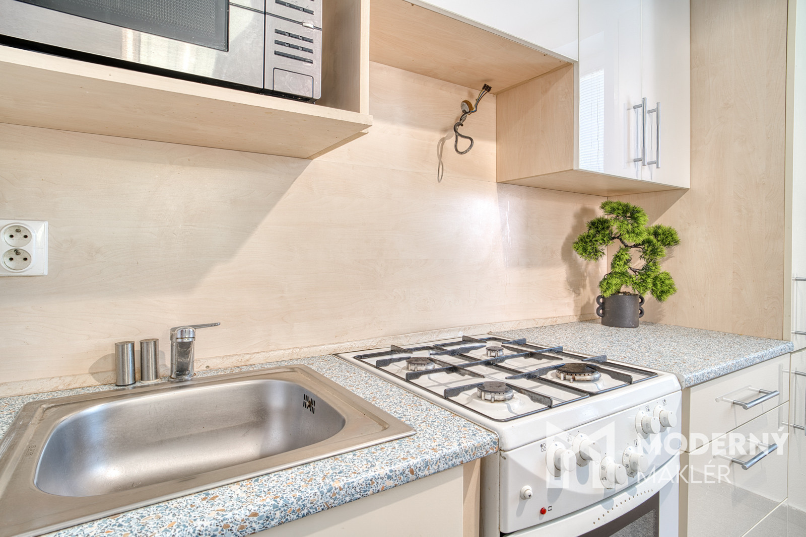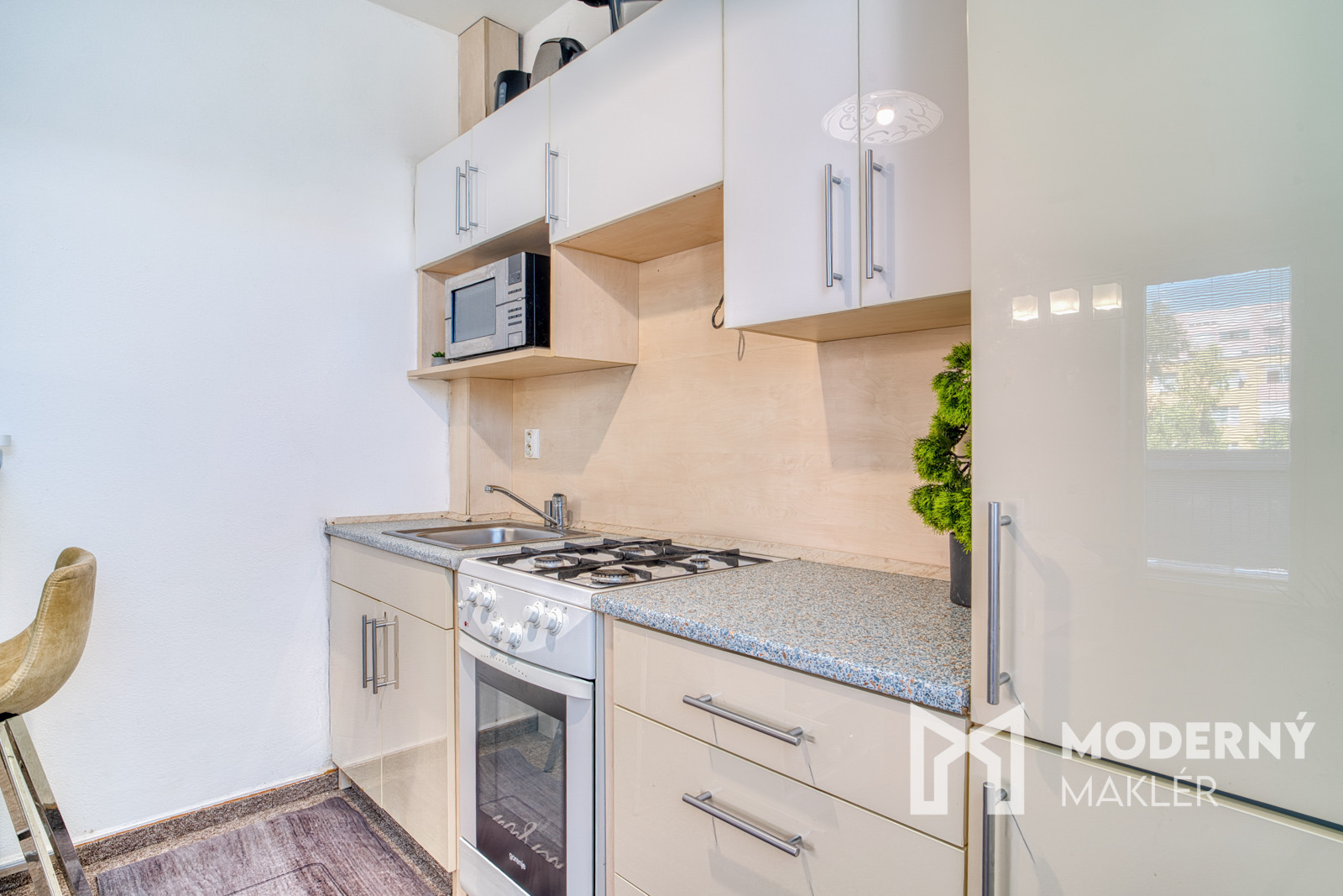 Nehnuteľnosť sa predáva čiastočne zariadená podľa dohody. V chodbe sa nachádza komoda pre praktické úložné riešenie. Kúpeľňa je vybavená sprchovým kútom a práčkou. Spálňa je zariadená manželskou posteľou pre pohodlný odpočinok. Obývacia izba ponúka kompletnú sedaciu súpravu s konferenčným stolíkom, TV zostavu pre relaxáciu a zábavu, ako aj 2 barové stoličky. Kuchyňa je vybavená kuchynskou linkou so spotrebičmi (plynový sporák s elektrickou rúrou) a barovým pultom na stolovanie. Ak byte potrebovali väčšiu kuchynskú časť je možnosť dobudovania do tvaru U.