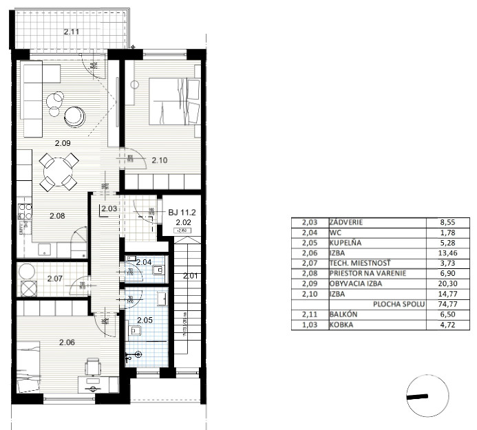 Do domu vstupujete cez bezpečnostné dvere, kde sa hneď oproti nachádza praktická pivničná kobka. Na prvé poschodie vedie schodisko priamo k bytu. Za vstupnými dverami sa nachádza priestranná chodba. Priamo oproti vchodu sa nachádza technická miestnosť. Po pravej strane vstúpite do veľkej obývacej izby prepojenej s kuchyňou. Z obývacej časti je prístup na loggiu, ktorý poskytuje príjemný vonkajší priestor a zabezpečuje interiér prirodzeným svetlom. Vedľa obývačky je situovaná spálňa. Na ľavej strane od vstupu nájdete samostatnú toaletu, vedľa ktorej sa nachádza kúpeľňa spojená s WC. Za kúpeľňou je umiestnená detská izba. Táto premyslená dispozícia spája funkčnosť s komfortom a ponúka ideálne zázemie pre rodinný život.