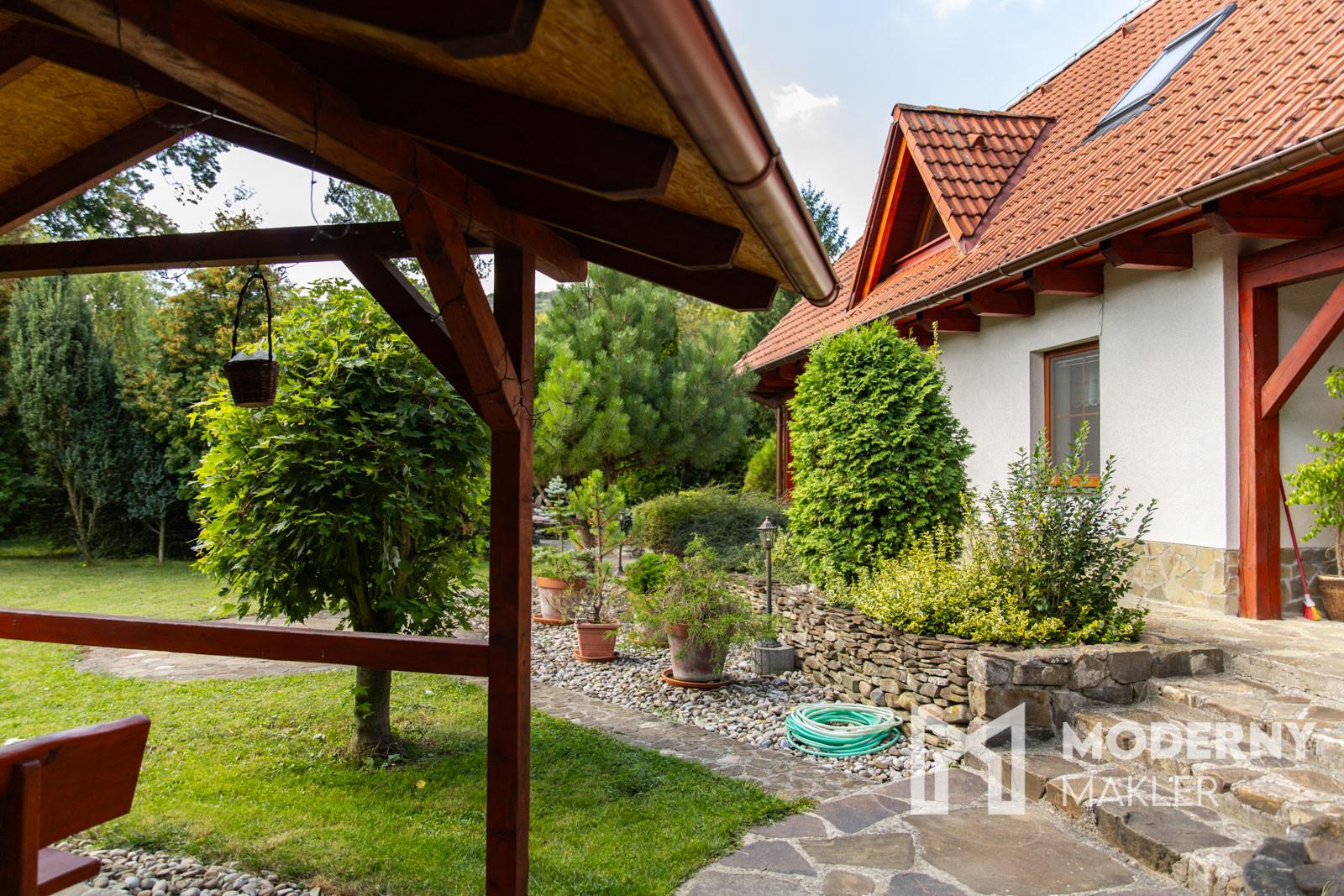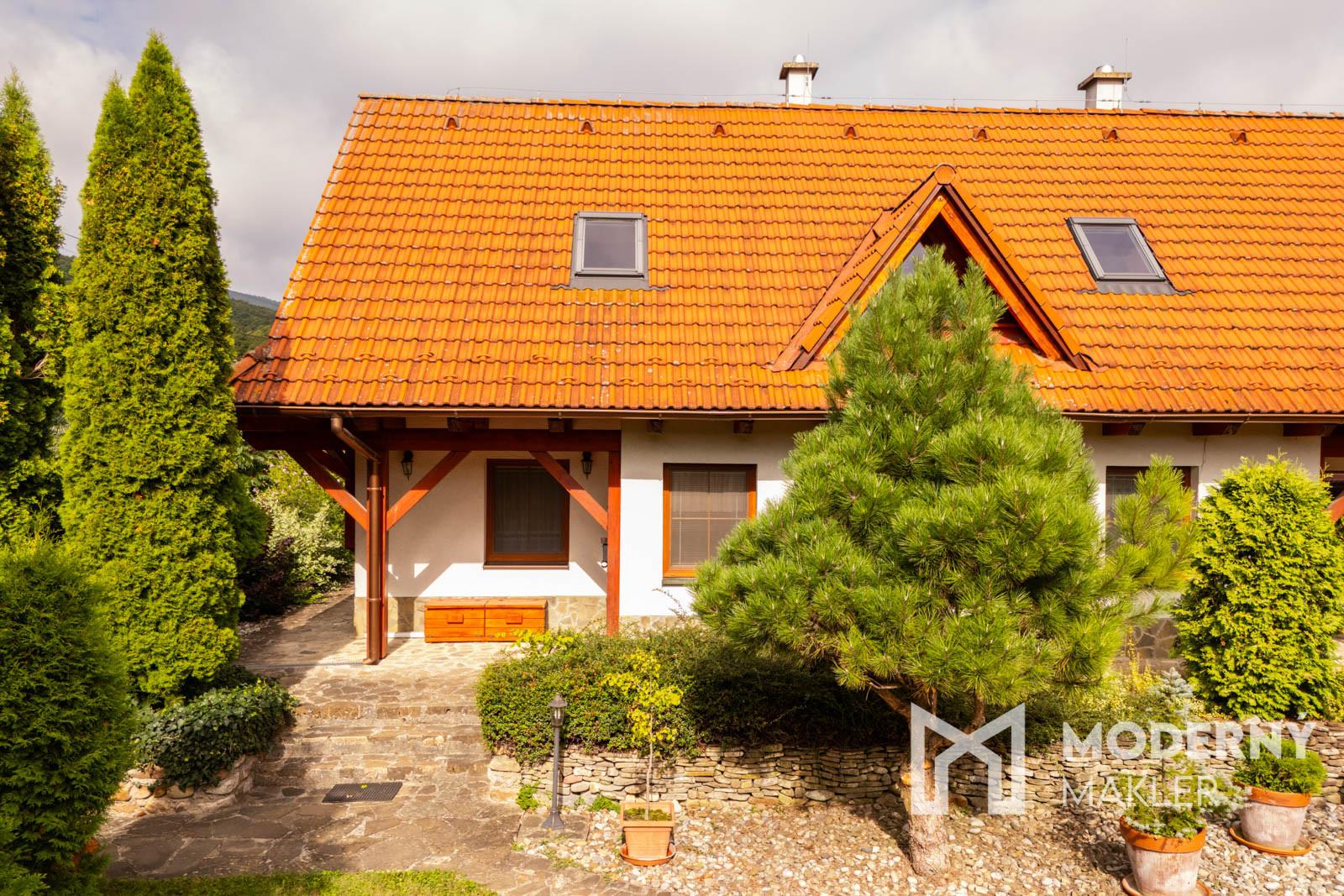 Nehnuteľnosť sa rozprestiera na dvoch podlažiach s využitím podkrovia a ponúka veľkorysé priestory pre pohodlné bývanie. Na prízemí sa nachádza vstupná chodba, ktorá vás privíta do domu. Ďalej nájdete moderne riešenú kuchyňu prepojenú s obývacou izbou, ktorá vytvára priestranný a funkčný denný priestor ideálny pre rodinný život aj spoločenské stretnutia. Z obývacej izby je možný vstup na kamennú terasu so sedením. Na tomto podlaží sa tiež nachádza spálňa, kúpeľňa s WC a sprchovým kútom, praktická komora a technická miestnosť. Za technickou miestnosťou je umiestnená kôlňa, ktorá poskytuje dodatočný úložný priestor. Druhé podlažie začína vstupnou chodbou a pokračuje dvoma priestrannými obytnými izbami, ktoré ponúkajú množstvo možností využitia - či už ako spálne, pracovne alebo relaxačné priestory. K dispozícii je samostatné WC a kúpeľňa s vaňou pre maximálne pohodlie. Povala slúži ako praktický odkladací priestor pre uskladnenie rôznych predmetov. Nehnuteľnosť je orientovaná na všetky svetové strany, čo zabezpečuje optimálne presvetlenie počas celého dňa a príjemné prostredie v každom ročnom období.