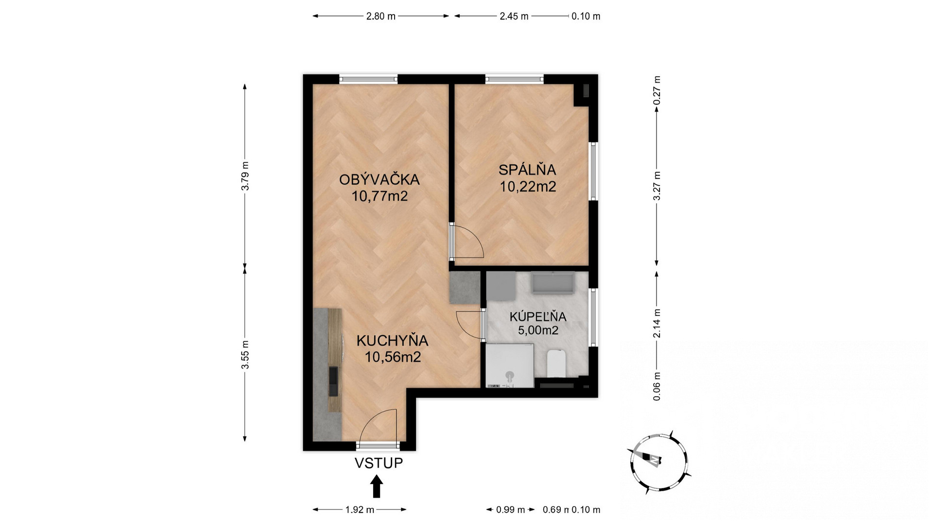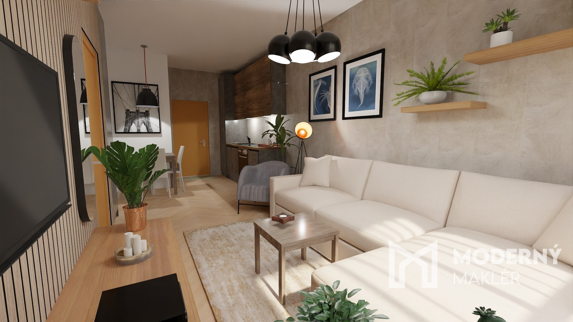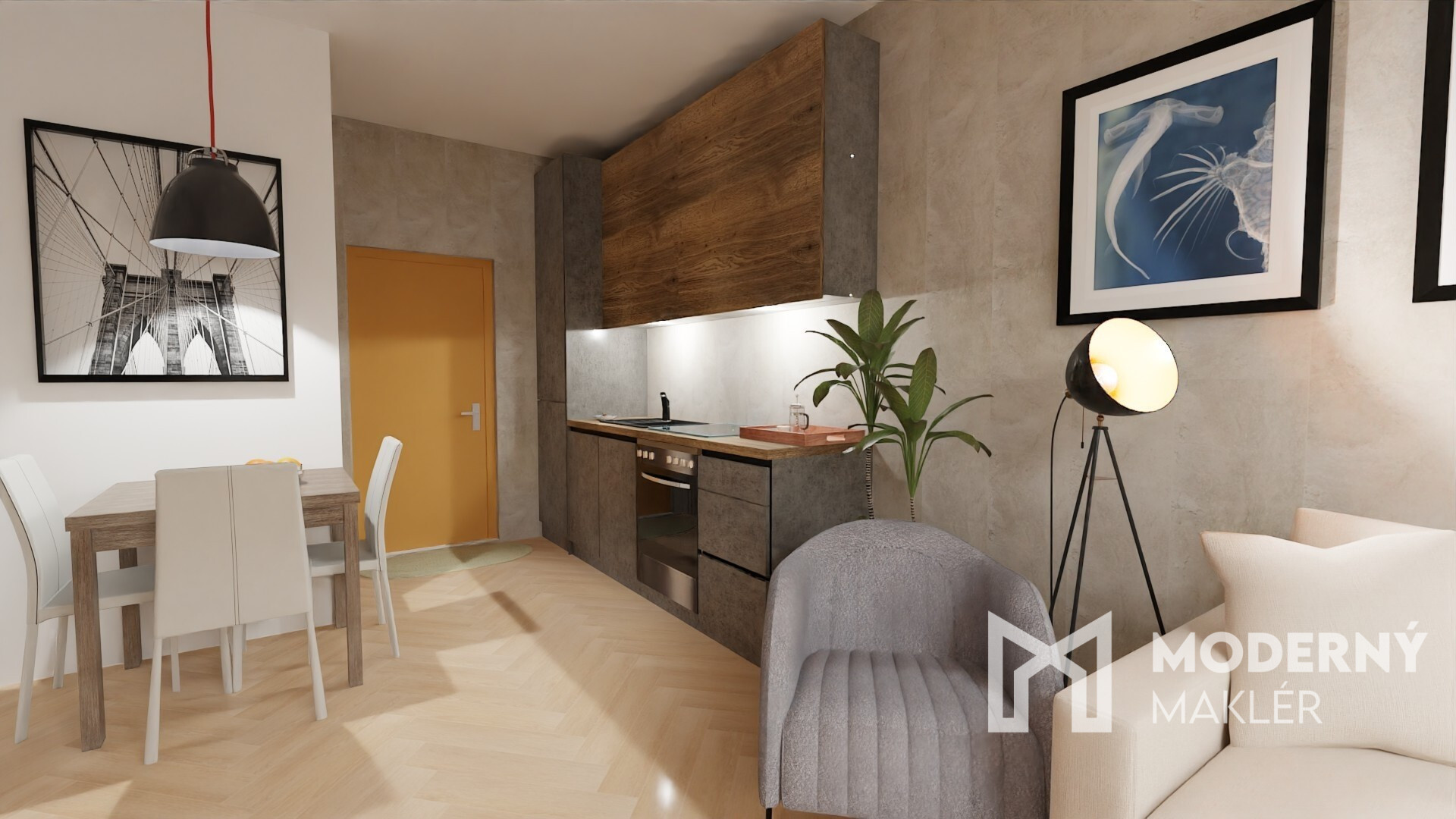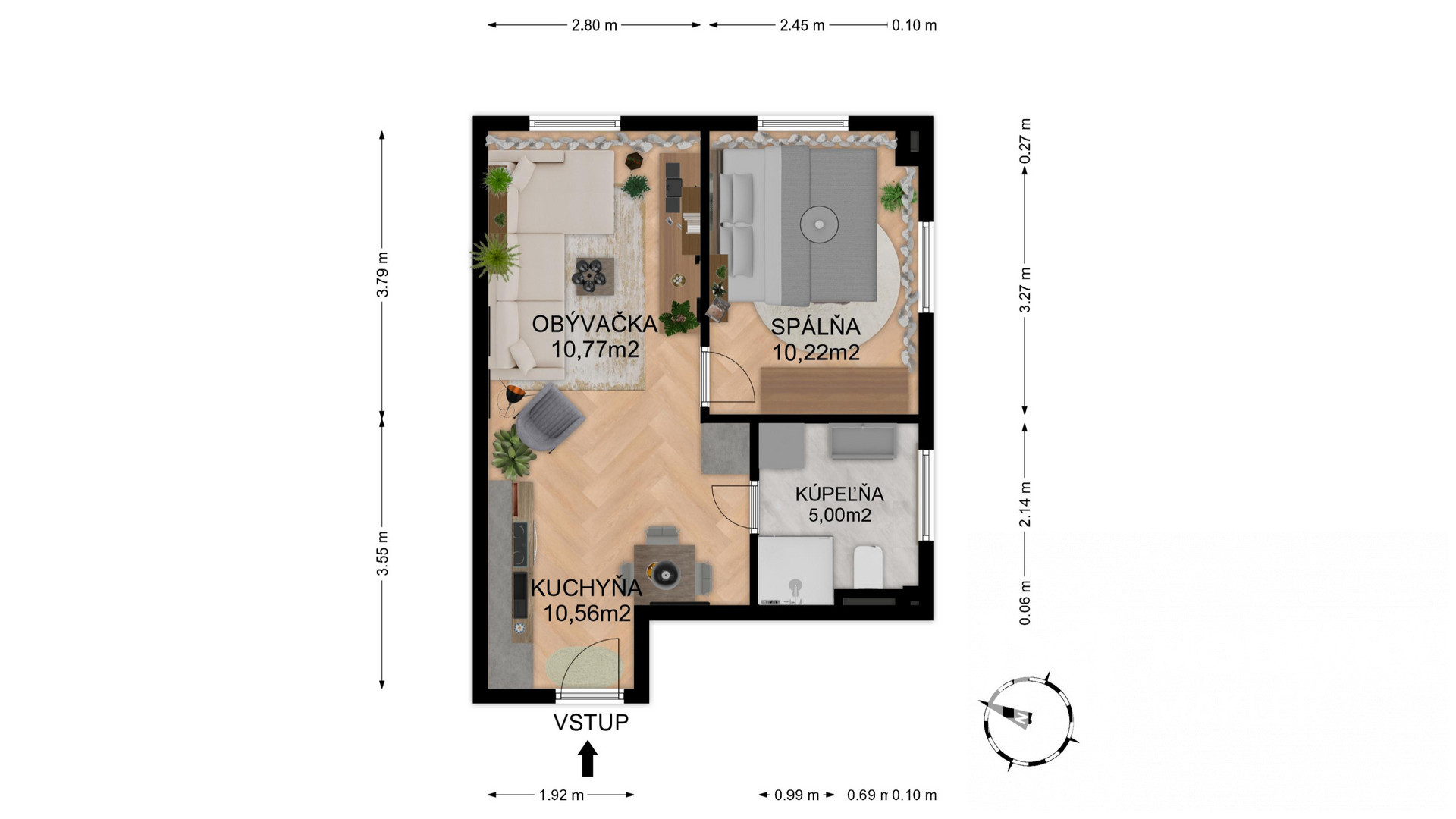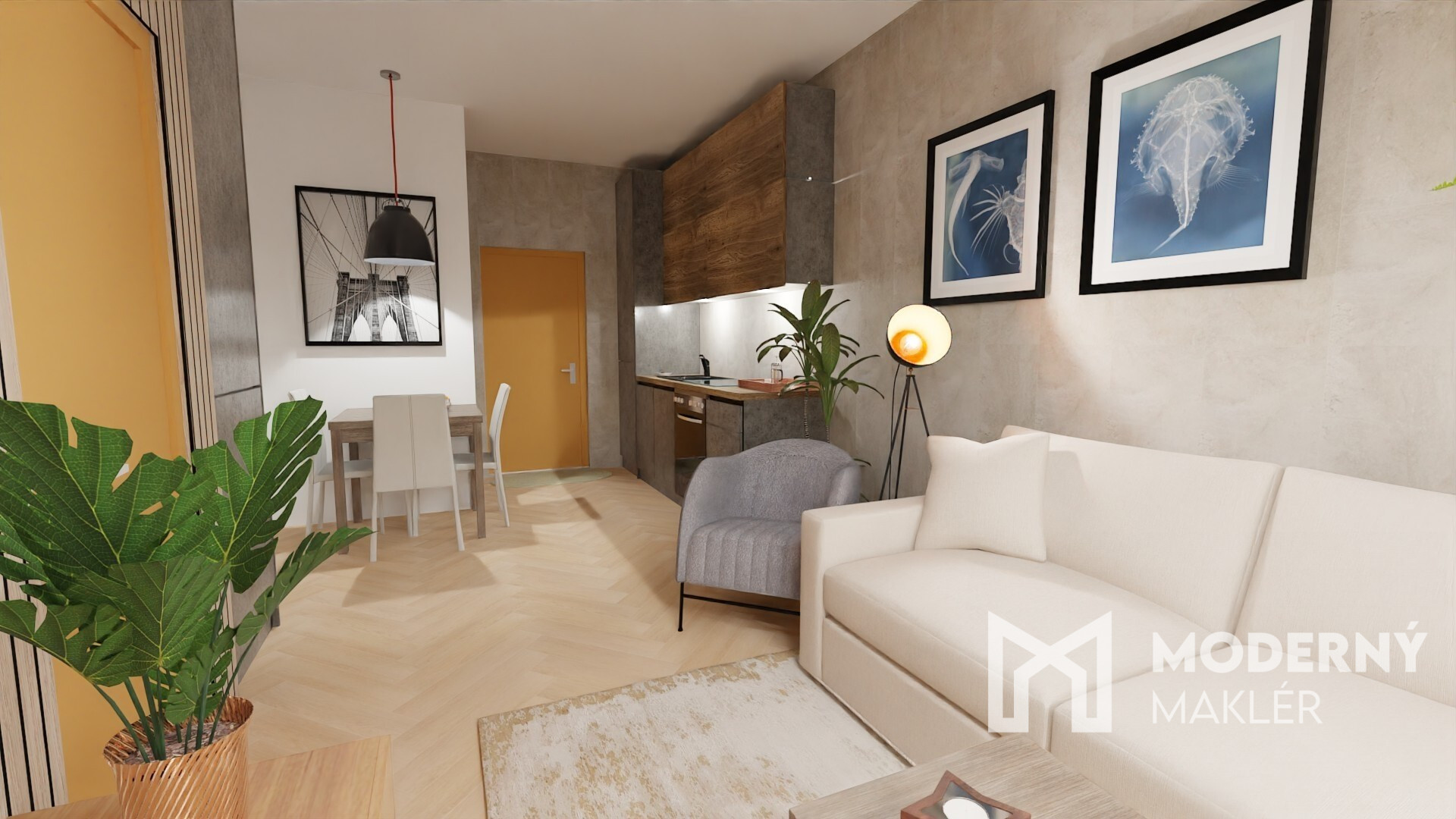 Do bytu vchádzame cez vstupnú predsieň, po ľavej strane sa nachádza priestor na kuchyňu, oproti vstupu nájdeme priestrannú obývaciu miestnosť a po pravej strane sa nachádza kúpeľňa s WC a samostatná spálňa.