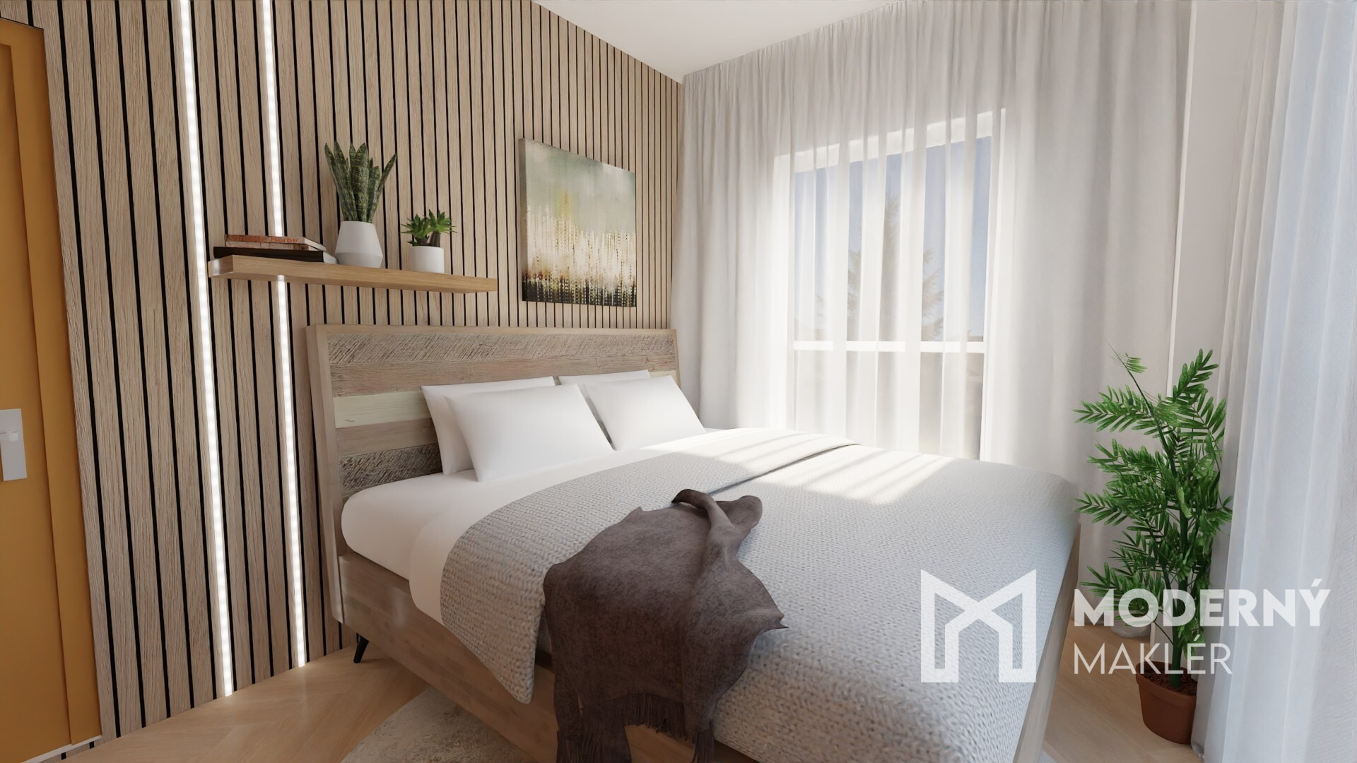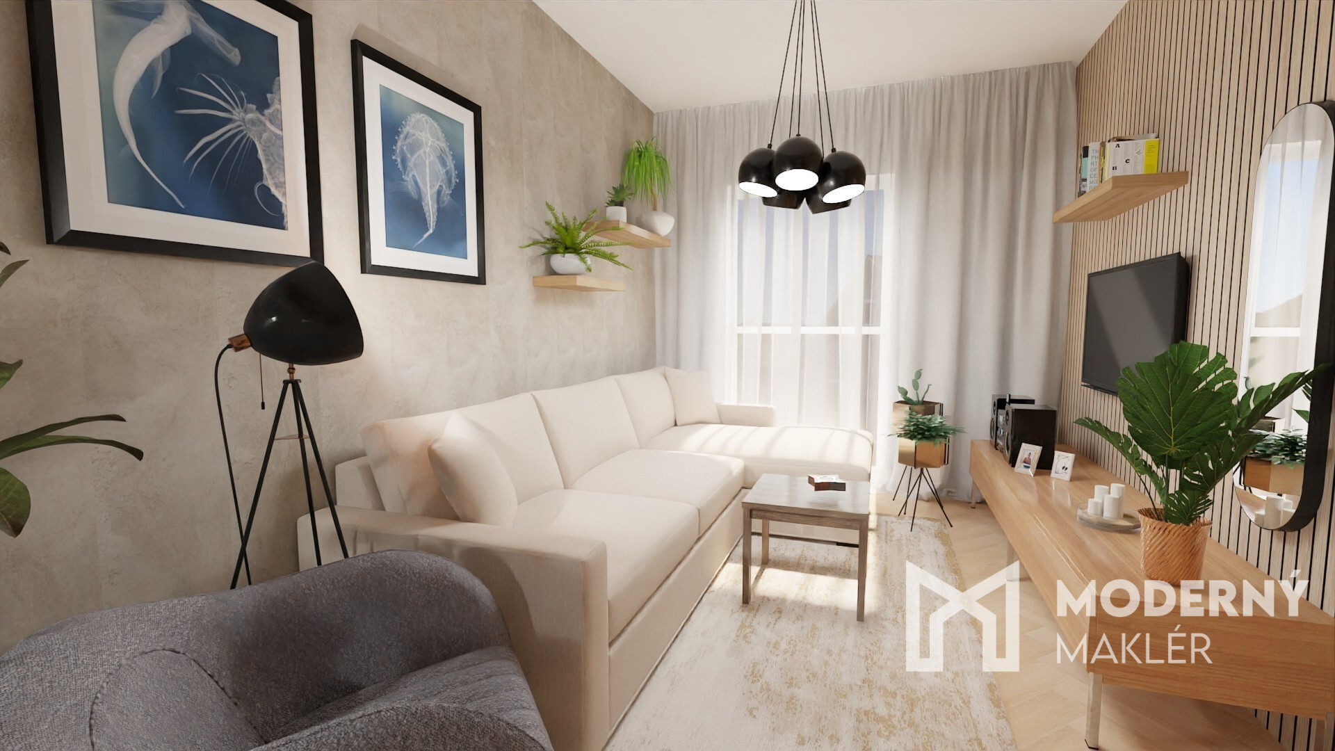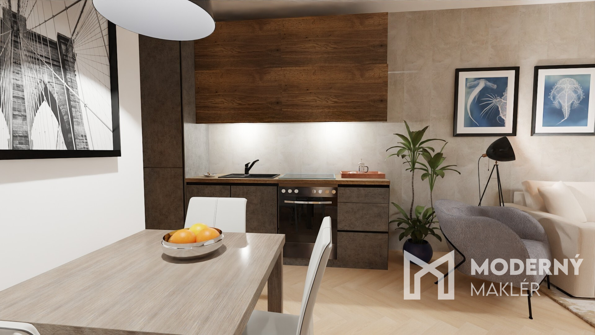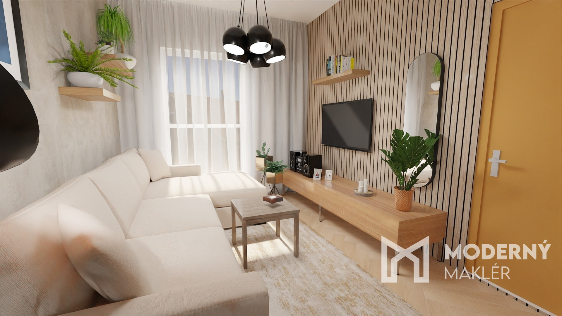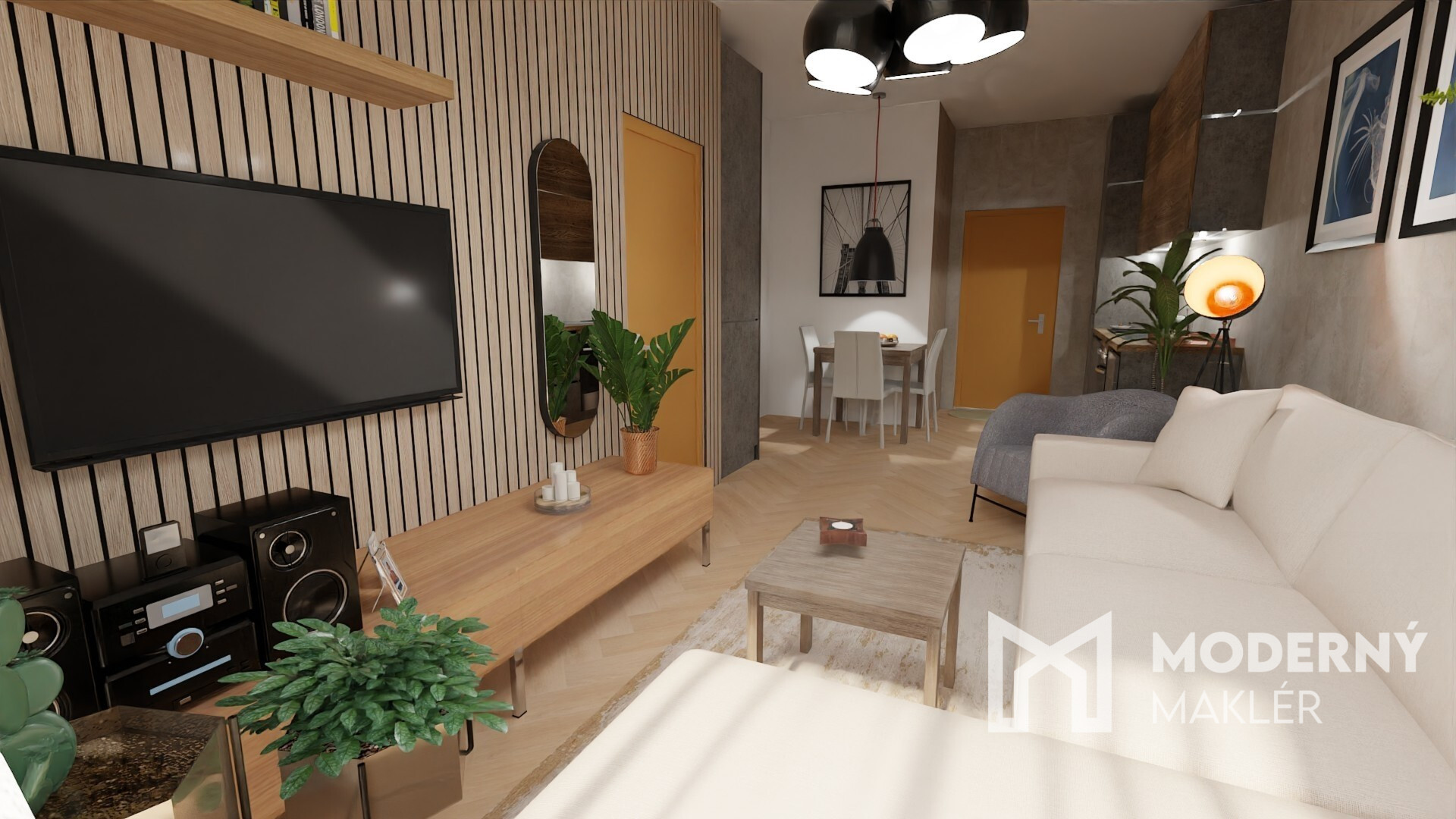 Do bytu vchádzame cez vstupnú predsieň, po ľavej strane sa nachádza priestor na kuchyňu, oproti vstupu nájdeme priestrannú obývaciu miestnosť a po pravej strane sa nachádza kúpeľňa s WC a samostatná spálňa.