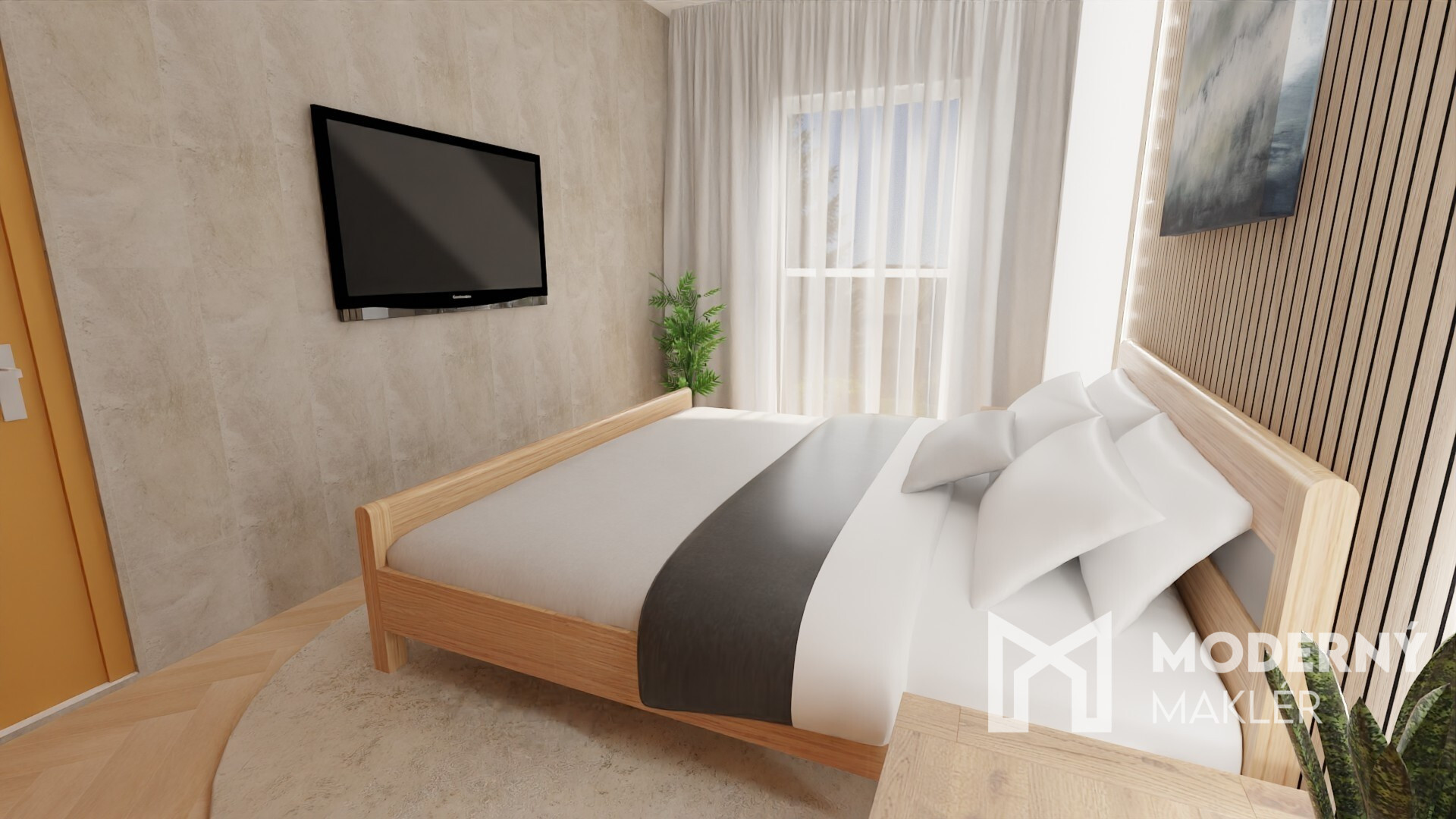 Moderný maklér ponúka na predaj úplne nový, slnečný 2-izbový apartmán v štádiu HOLOBYT, ktorý sa nachádza na Duklianskej ulici v Bardejove. Apartmán je situovaný na 3/6 podlaží domu s výťahom a prislúcha k nemu aj parkovacie miesto, ktoré je súčasťou predaja. Benefitom nehnuteľnosti je aj možnosť prenosu daňovej povinnosti na inú firmu (platcu DPH), nakoľko v cene je zarátaná aj DPH. Súčasťou inzerátu sú aj vizualizácie pre inšpiráciu nového majiteľa.