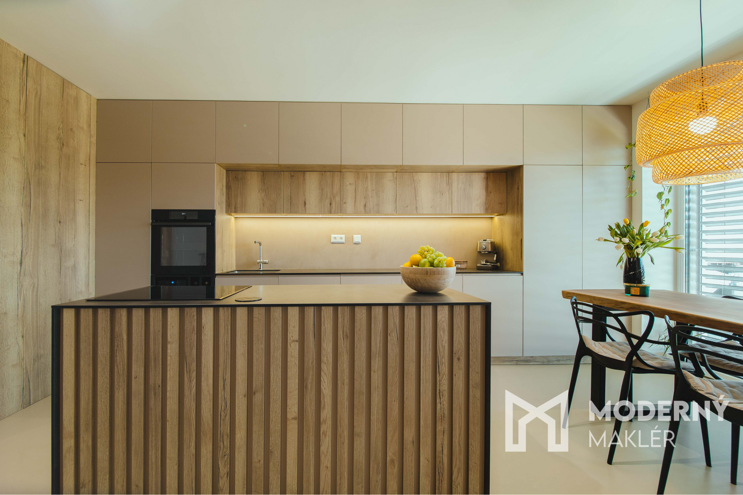Dom sa predáva kompletne zariadený a pripravený na okamžité bývanie. Interiér je ladený do moderného, no zároveň útulného štýlu, s dôrazom na funkčnosť a dizajnovú čistotu. Obývacia časť ponúka pohodlnú sedaciu súpravu, konferenčný stolík a televízor . Vzdušná kuchyňa je vybavená kuchynskou linkou so vstavanými spotrebičmi, chladničkou na víno a dominantným jedálenským stolom z masívneho orechového dreva so stoličkami. Spálňa disponuje vstavanou skriňou a komodou, kúpeľne sú kompletne vybavené modernou sanitou a úložným nábytkom. Praktickou súčasťou domu je aj samostatná technická miestnosť s práčkou, sušičkou a vstavanou skriňou, ktorá poskytuje dostatok úložného priestoru. V predsieni sa nachádza vstavaná skriňa s botníkom. K dispozícii je tiež exteriérové sedenie. Všetok nábytok je vyrobený na mieru, čo zabezpečuje maximálne využitie priestoru a esteticky jednotný dizajn v celom dome.