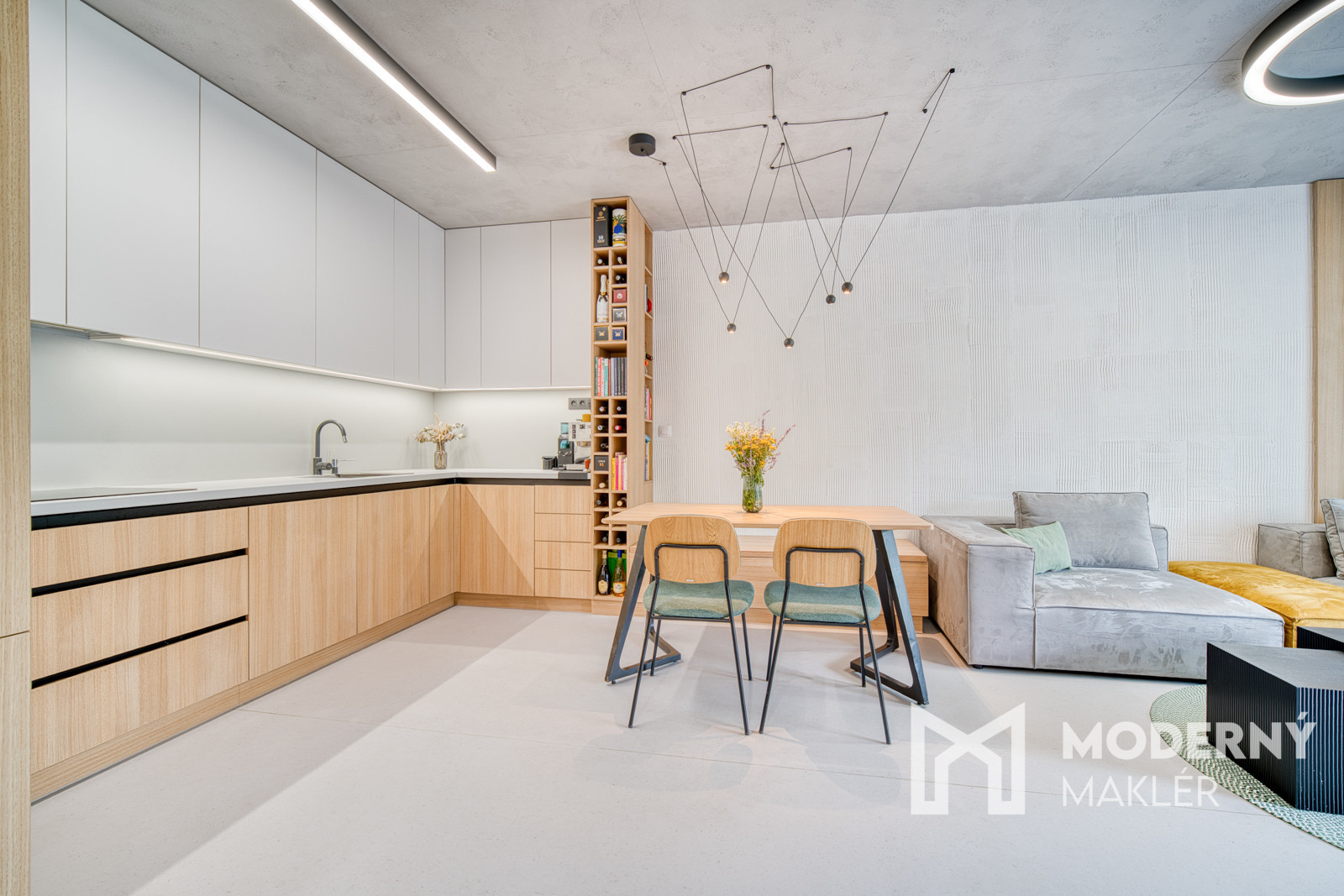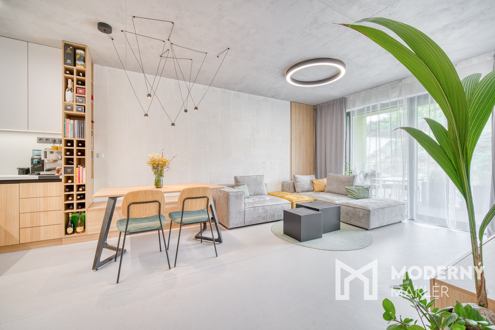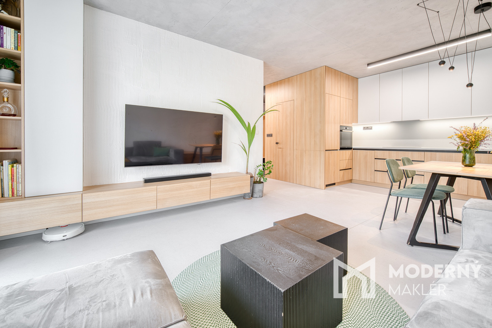 Byt sa predáva kompletne zariadený nábytkom na mieru. Bol navrhnutý architektonickým štúdiom IAVD architekt, ktorý vytvoril nadčasový dizajn bytu s funkčnosťou a premyslenými detailami. Každý centimeter priestoru je využitý efektívne a s dôrazom na estetiku. V kuchyni sa nachádza svetlá kuchynská linka so spotrebičmi (indukčná varná doska, digestor, teplovzdušná rúra, umývačka riadu, chladnička). Obývacia časť dotvára moderný vzhľad kuchyne a poskytuje ideálny priestor na filmový zážitok. Kuchyňa spojená s obývačkou ponúka koberce a stoličky značky KAVE a konferenčný stolík značky MUZZA. V kúpeľni sa nachádza sprchový kút s dizajnovým umývadlom, skrinkami s uložným priestorom a zrkadlom. Spálňa je vybavená pohodlnou posteľou s 2 šatníkovými skriňami. Druhá izba poskytuje priestor pre deti a ich kreatívne využitie času. Práčka so sušičkou sa nachádzajú v samostatnej miestnosti.