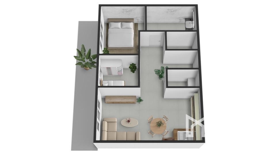 Dispozícia pozostáva zo vstupnej chodby, obývacej izby s kuchyňou, spálne, detskej izby, kúpeľne a samostatnej toalety. Zo spálne a obývacej izby je zároveň výstup na veľkú terasu.