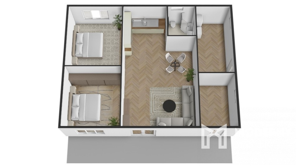 Dom sa skladá z priestrannej kuchyne spojenej s obývačkou orientovanej na juh, ktorá poskytuje dostatok prirodzeného svetla počas celého dňa. Nájdete tu dve samostatné spálne, ktoré zabezpečujú súkromie a pohodlie pre všetkých obyvateľov. Nehnuteľnosť disponuje plne vybavenou kúpeľňou s toaletou. Pre praktické využitie slúži technická miestnosť a skladovací priestor, ktoré poskytujú dostatok úložných možností. Pridanou hodnotou je priestranná terasa, ktorá rozširuje obytný priestor, umožňuje vychutnať si vonkajšie prostredie a dá sa zväčšiť podľa požiadaviek klienta. Celkové usporiadaniedomu je funkčné a premyslené s dôrazom na maximálne využitie každého metra štvorcového.