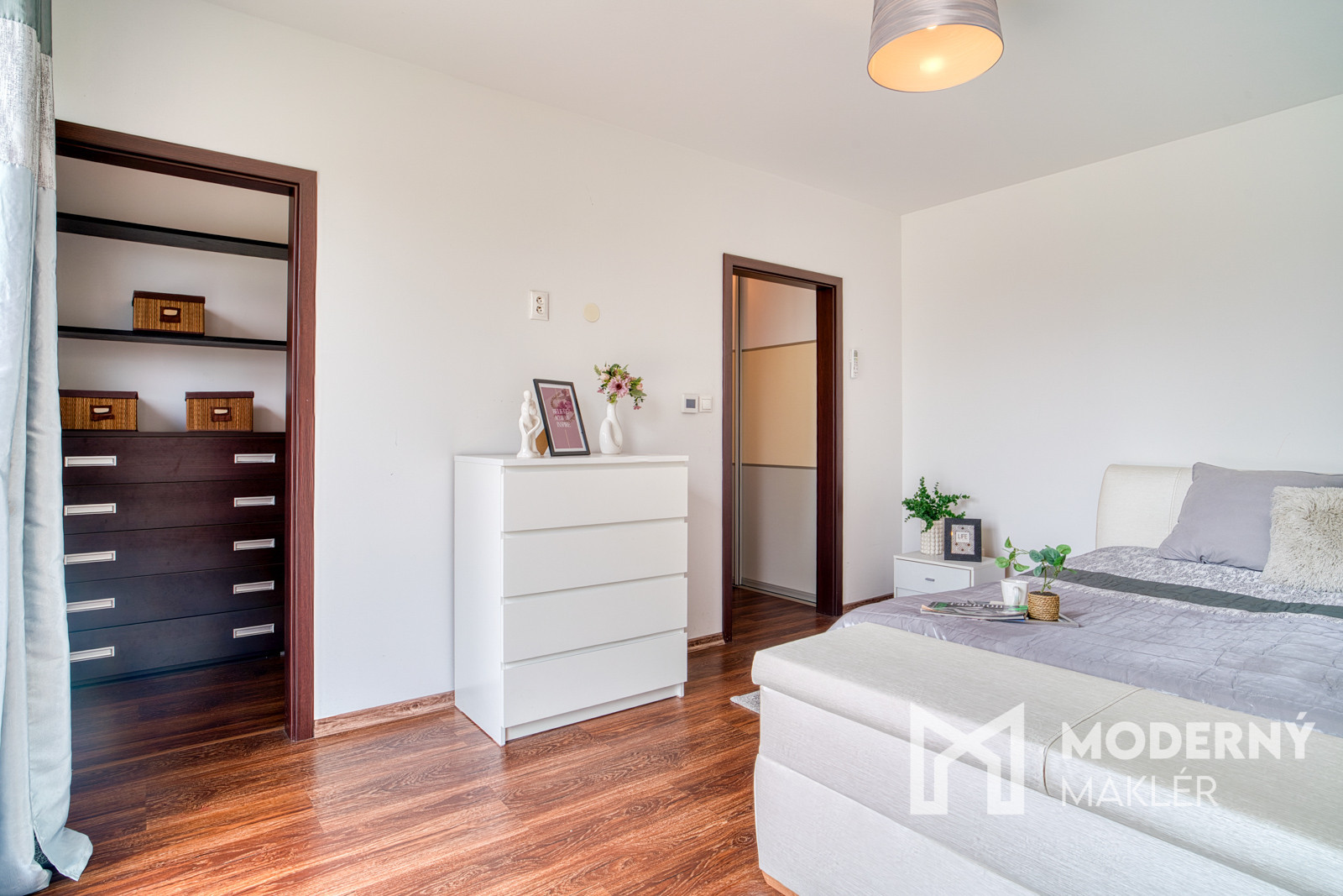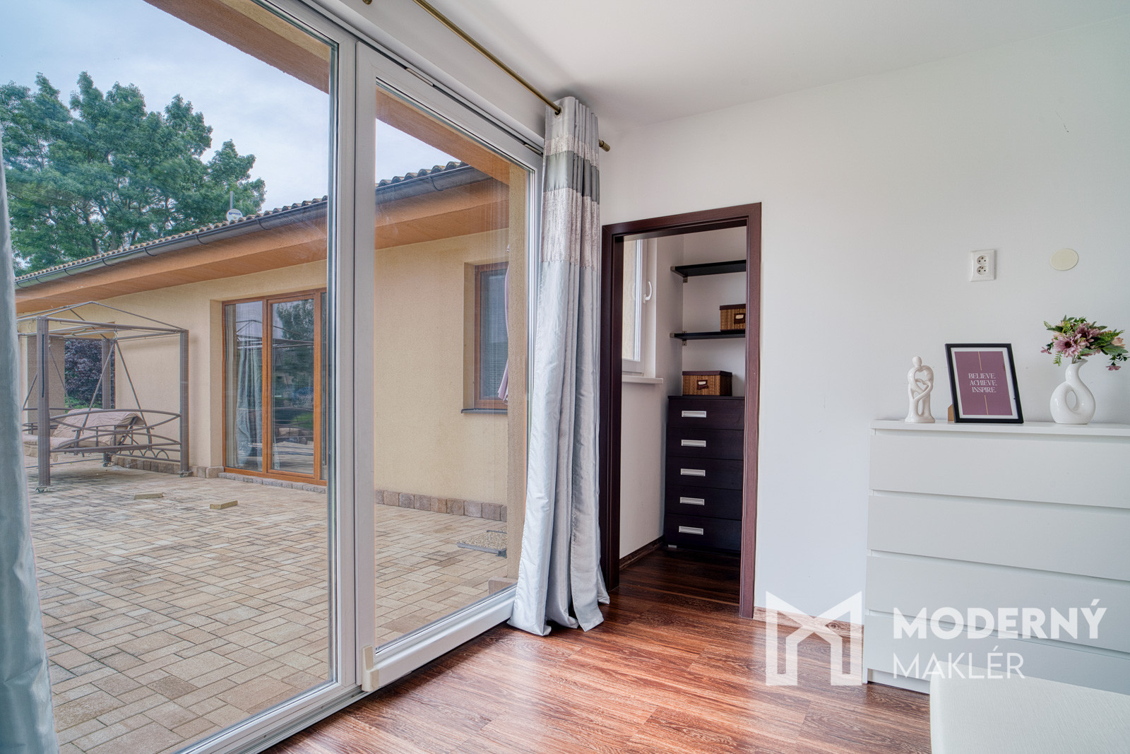 Za vstupnými dverami vás privíta praktická predsieň, odkiaľ sa vstupuje do samostatného WC a hlavnej chodby, ktorá prepája všetky časti domu. K dispozícii sú dve samostatné izby, kúpeľňa, technická miestnosť a praktická špajza – ideálna na každodenné uskladnenie potravín. Dominantou domu je spálňová časť, do hlavnej spálne sa vchádza cez priestranný šatník so vstavanou šatníkovou skriňou s posuvnými dverami. Bonusom je priľahlá menšia izba s možnosťou vybudovania vlastnej rodičovskej kúpeľne. Zo spálne vedie priamy výstup na terasu – ideálne miesto na oddych či rannú kávu. Srdcom domu je vzdušný, otvorený priestor kuchyne spojenej s jedálňou a obývacou izbou, ktorý prirodzene prepája rodinný život. Aj z tejto časti je možný priamy vstup na terasu, ktorá je orientovaná na juhovýchod – perfektná poloha na vychutnanie si prvých ranných lúčov pri šálke kávy.