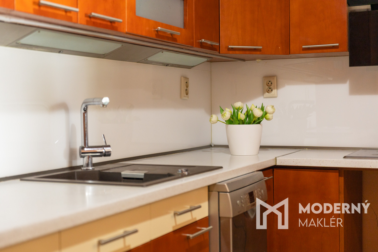 Byt sa predáva čiastočne zariadený. V chodbe sa nachádza vstavaná skriňa spolu s botníkovou zostavou. Kuchyňa je vybavená kompletnou kuchynskou linkou a spotrebičmi (umývačka riadu, digestor, chladnička, indukčná varná doska a mikrovlnná rúra). Jedálenská časť ponúka jedálenský stôl s kapacitou pre 6 osôb. Obývačka je zariadená dvoma gaučmi, konferenčným stolíkom a trojdielnou obývačkovou stenou s úložným priestorom. Spálňa je vybavená manželskou posteľou a vstavanou skriňou. Vstavanú skriňu nájdete taktiež aj v detskej izbe. V kúpeľni sa nachádza vaňa, práčka a police na odkladanie vecí.