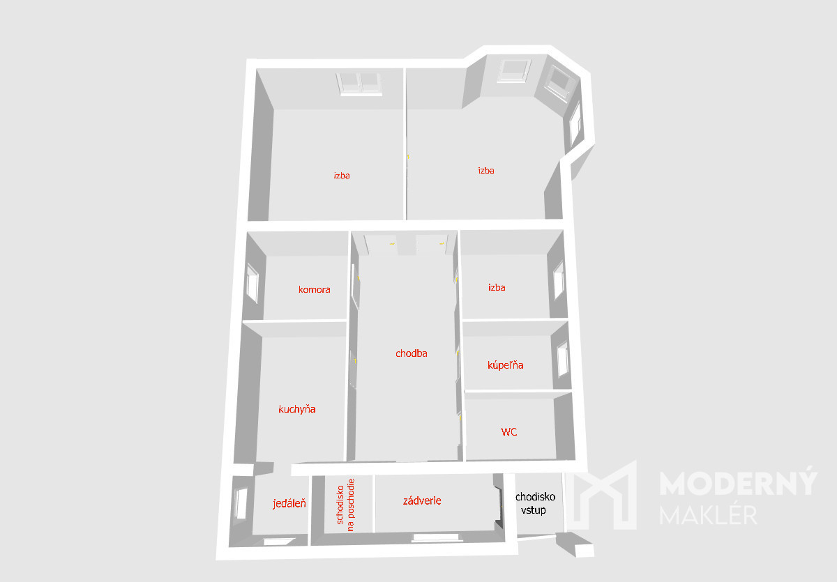 Na poschodí sa nachádza hala, schody, chodba, zábavná miestnosť, kúpeľňa s WC, kuchyňa , komora , 4 izby a balkón s výmerou 6,5m2.