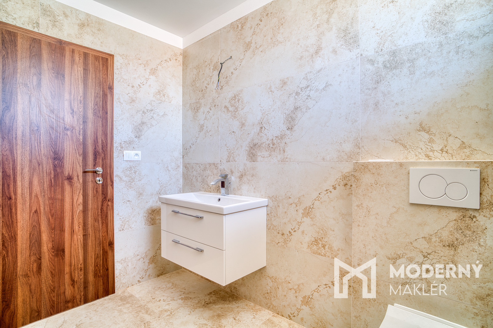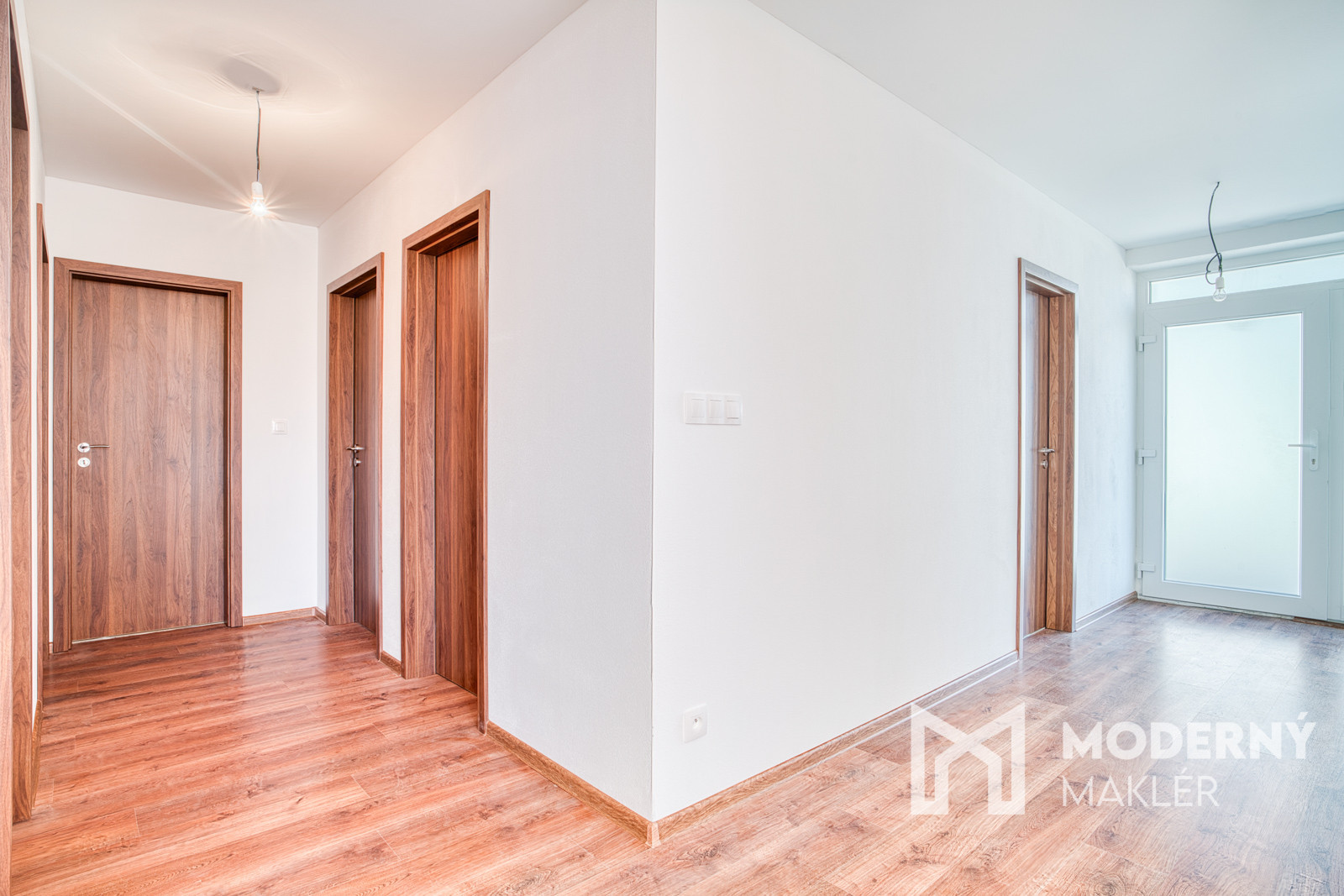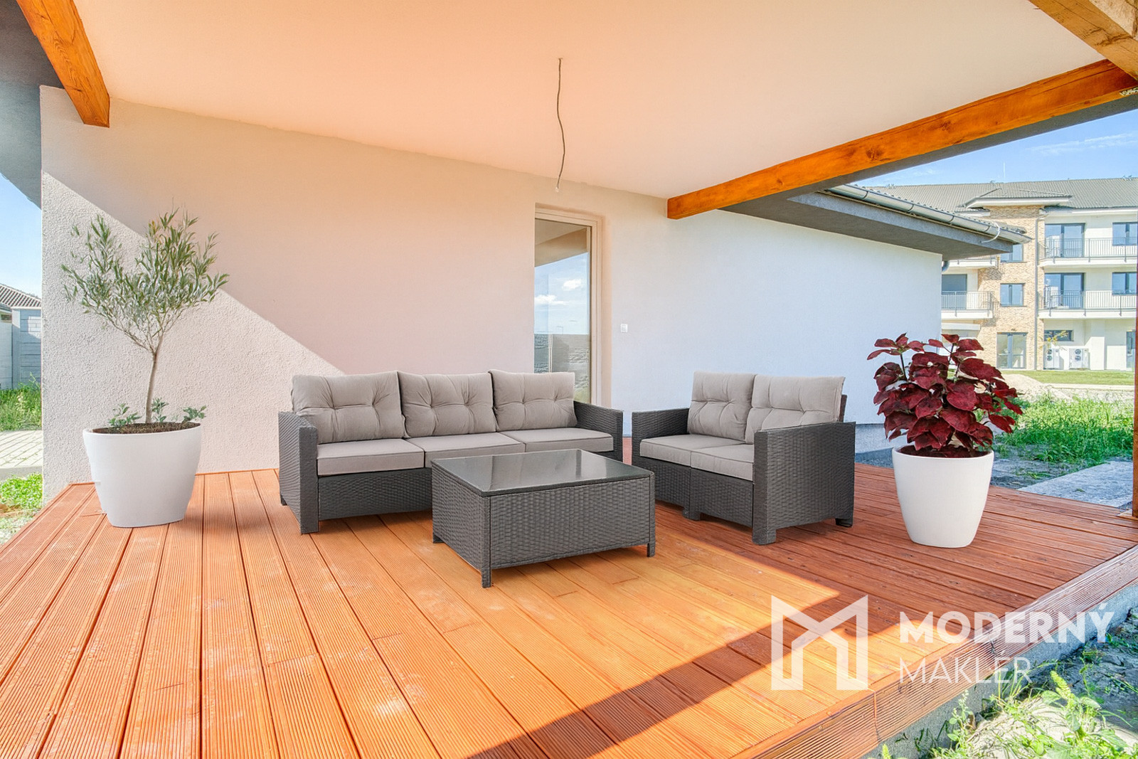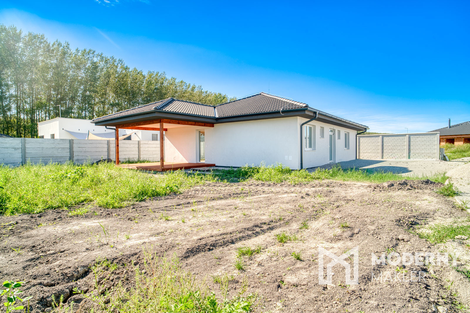 Dom pozostáva zo starostlivo premyslenej dispozície na jednom podlaží, ktorá kombinuje praktickosť s moderným komfortom bývania. Po vstupe do domu sa dostanete do vstupnej chodby, z ktorej máte prístup do všetkých miestností. V prízemí nájdete hosťovské WC s umývadlom, praktickú technickú miestnosť určenú pre tepelné čerpadlo s prívodom na pračku, ako aj užitočnú komoru a samostatnú miestnosť slúžiacu ako šatník. Srdcom domu je veľkorysá obývacia izba otvorene spojená s kuchyňou, ktorá má východ na dve priestranné terasy, kde si môžete vychutnať vonkajšie posedenie a relaxáciu. Dom ďalej ponúka tri samostatné izby, ktoré sú krásne presvetlené prirodzeným denným svetlom a pôsobia vzdušne a veľkoryso. Všetky štyri miestnosti svojou veľkosťou dokonale spĺňajú potreby modernej rodiny. Dispozícia je doplnená veľkou kúpeľňou, ktorá je vybavená vaňou aj samostatným sprchovým kútom, čo poskytuje maximálnu flexibilitu a komfort pri každodennom používaní.