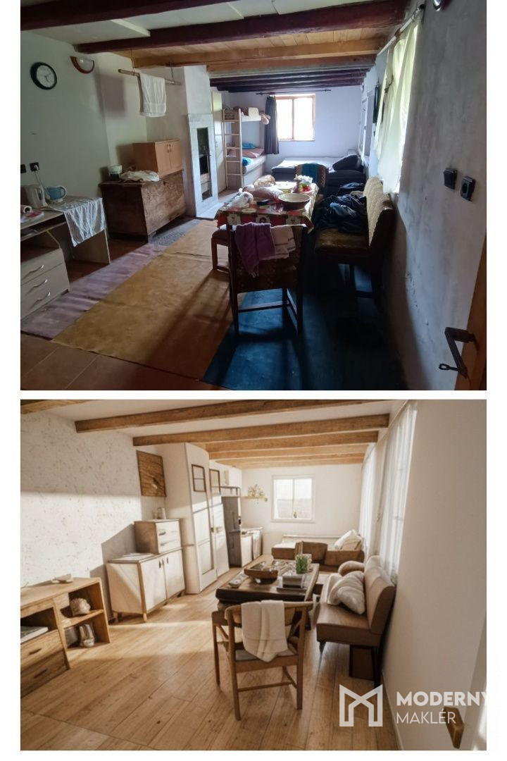 Ponúkame Vám na predaj starú dobovú chalupu /pozostávajúcu z 2 malých domčekov/, ktorá môže slúžiť po rekonštrukcii ako rekreačný domček v obci Slatina nad Bebravou. Chalupa prešla čiastočnou rekonštrukciou, ktorá zahrnula komplet novú strechu, elektroinštaláciu, napojenie domu na obecný vodovod. Odpad je zvedený do žumpy. Dispozične chalupu tvorí: vstupná chodba, z ktorej je vchod do kúpeľne spojenej s wc. Ďalej sa v dome nachádza samostatná izba a jedna veľká priestranná miestnosť - momentálne využívaná ako kuchyňa spojená s obývacou časťou. Vchod na povalu domu je cez vonkajšie schodisko. Tu je možnosť do budúcna z-obytniť podkrovie. Vstup do domu je cez spoločný dvor - je tu možnosť vybudovať si samostatný vchod, chalupa sa nachádza v zadu na pozemku, čo poskytuje dostatok súkromia. Pozemok pod domom aj záhrada sú nevysporiadané /sú 2 žijúci vlastníci, zvyšnú časť spravuje SPF - vieme zabezpečiť právnu pomoc s vyporiadaním/. Celková výmera pozemku je 3598m2, s toho podiel predávajúceho je 706m2. Momentálne je chalupa využívaná ako rekreačný dom. Vo foto-dokumentácii Vám prinášame aj náhľad možnej prípadnej rekonštrukcie. Cena 34 400 €. Obhliadku si môžete zabezpečiť na 0949 171 917. prípadne e-mailom: puterkova@spektrumreality.sk