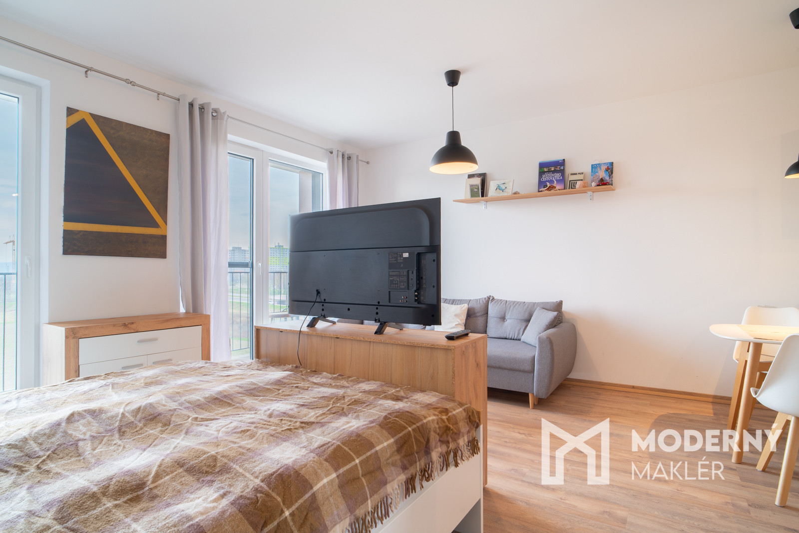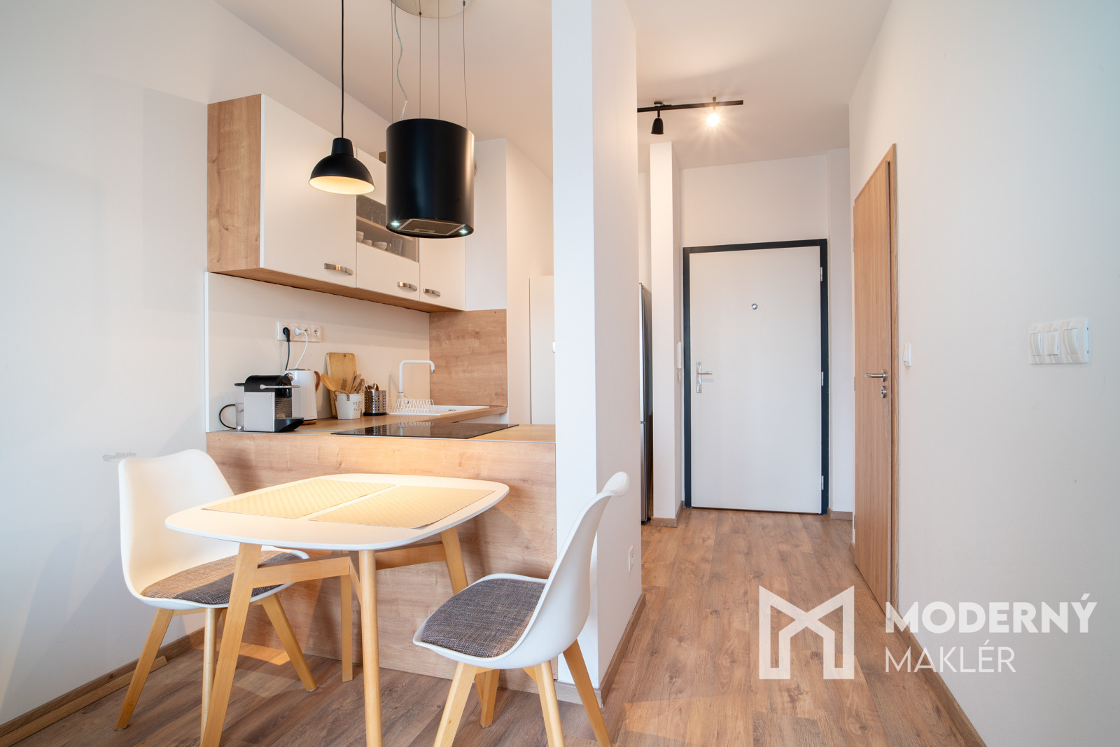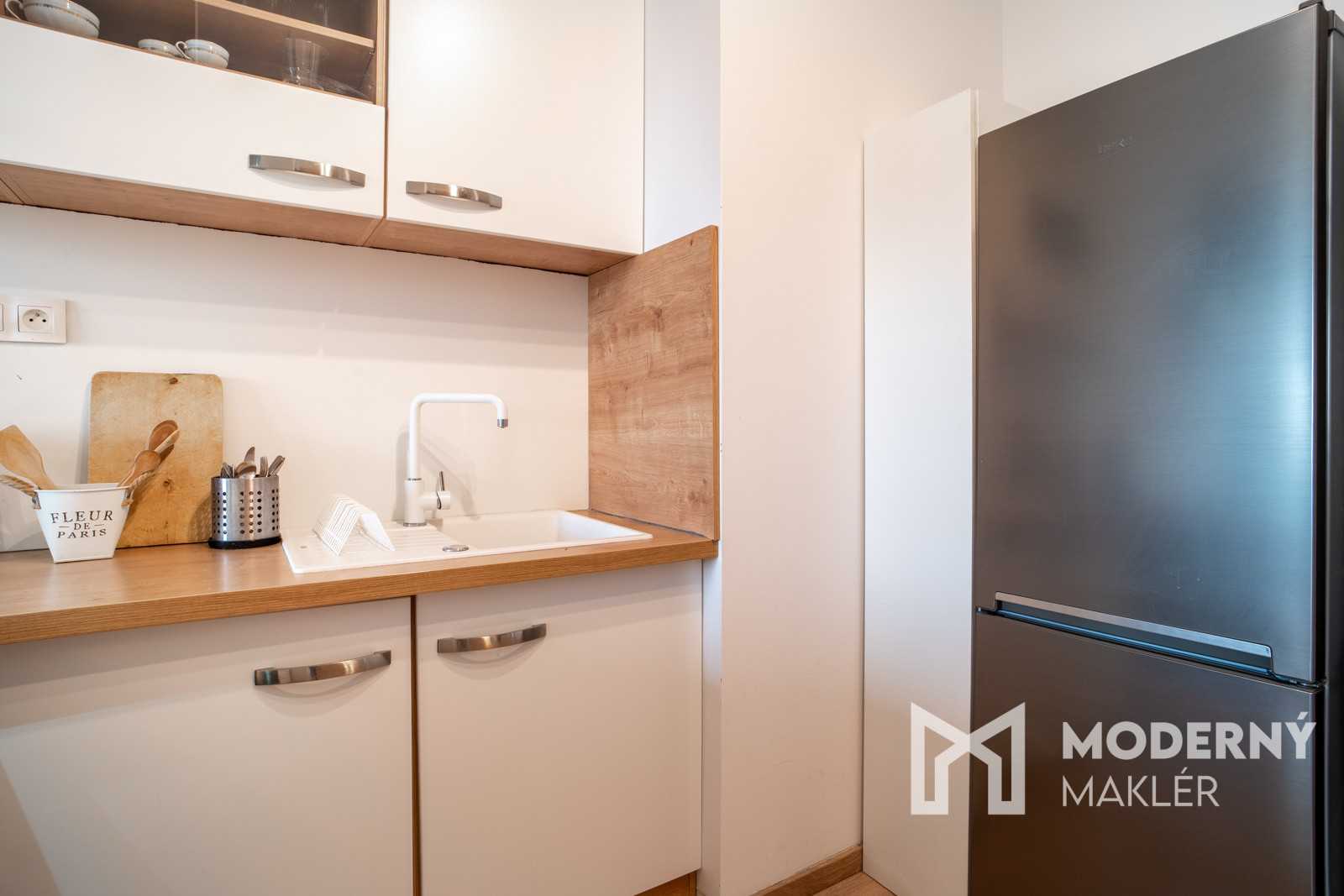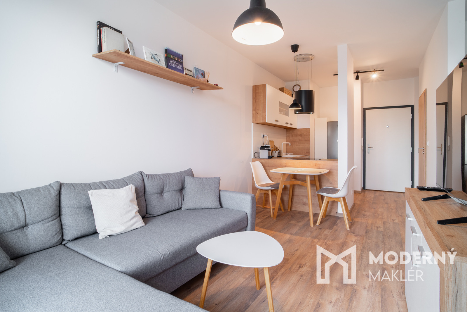 Moderný maklér ponúka na prenájom štýlový 1,5-izbový byt v bratislavskej Petržalke, v obľúbenej štvrti Slnečnice. Byt je kompletne zariadený a vybavený modernou kuchynskou linkou so spotrebičmi, útulnou obývacou časťou a plne vybavenou spálňou.