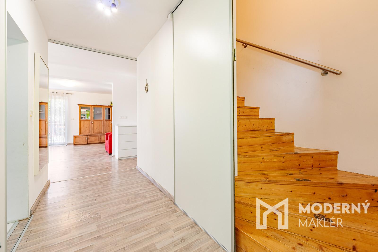 V dome zostáva nábytok podľa dohody s kupujúcim. Súčasťou predaja je vstavaná kuchynská linka vyrobená na mieru, ktorá efektívne využíva priestor a ponúka množstvo úložných riešení. Na prízemí sú nainštalované praktické posuvné dvere, ktoré šetria miesto a zároveň dodávajú interiéru moderný a čistý vzhľad.