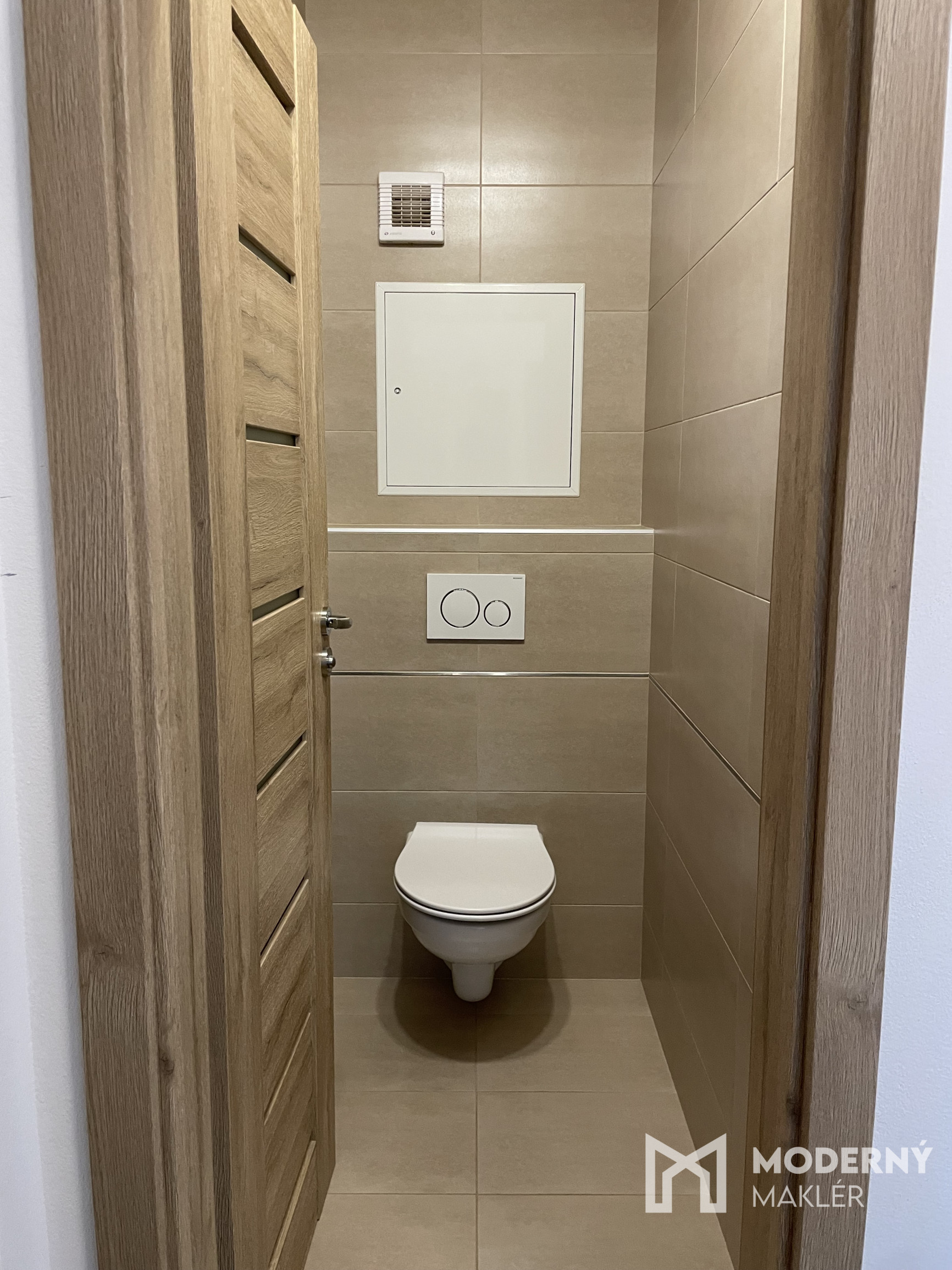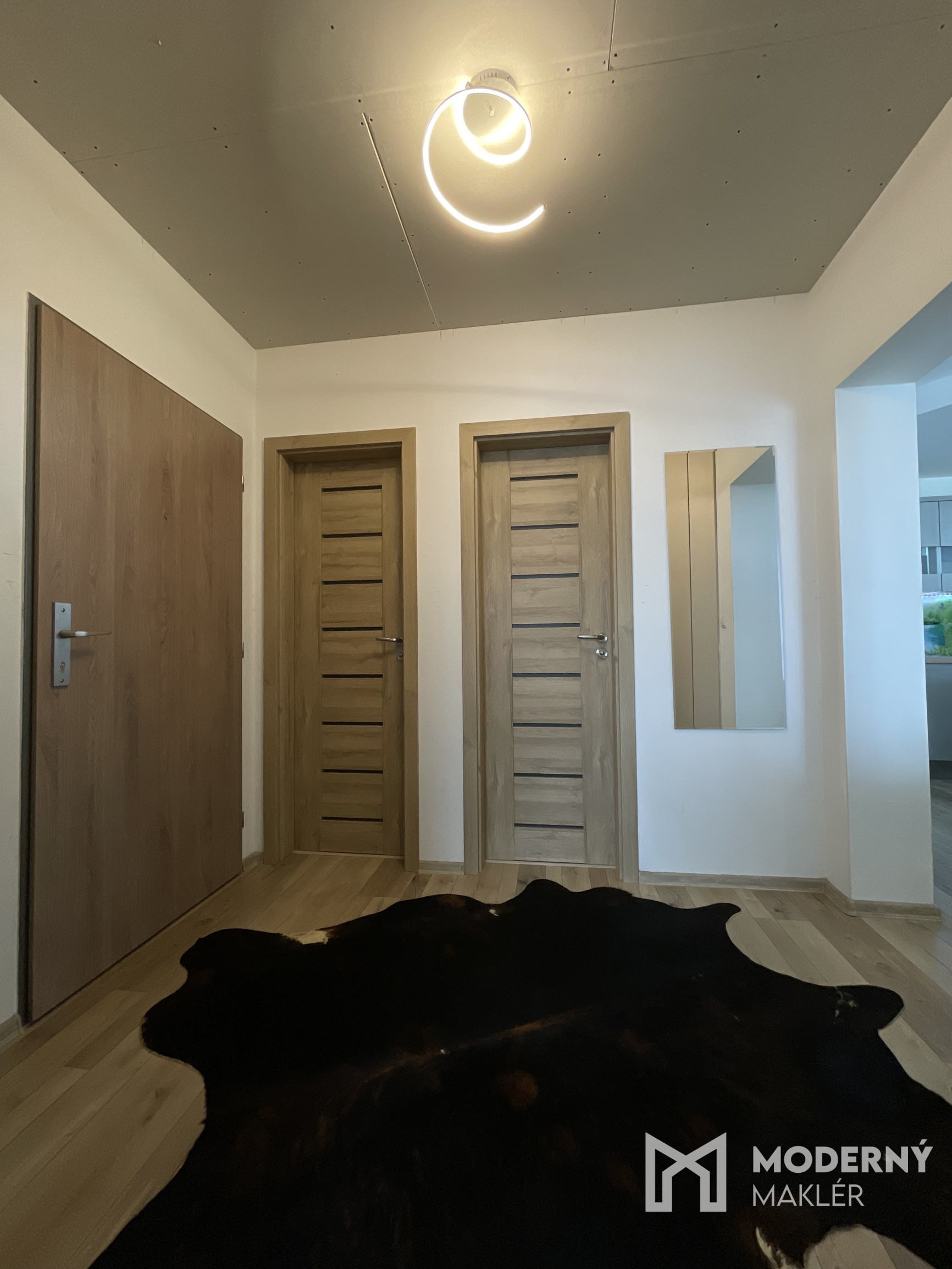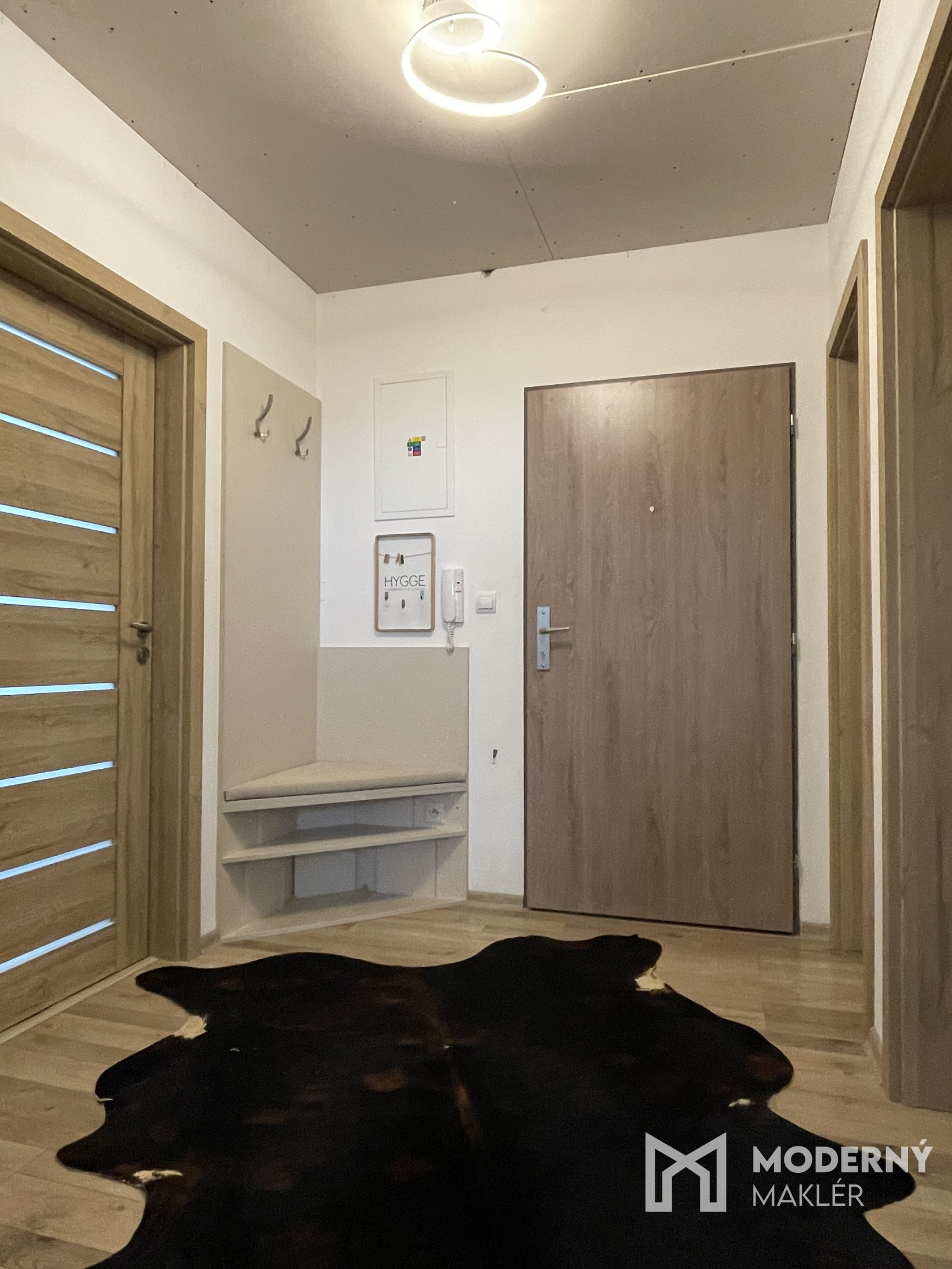 Pri vstupe do bytu sa nachádza priestranná chodba s vešiakovou stenou a botníkom s miestom na sedenie. Z chodby je vstup do samostatnej toalety a kúpeľne vybavenej sprchovým kútom, umývadlom so skrinkou a automatickou práčkou. Hlavný obytný priestor tvorí obývacia izba s balkónom, prepojená s novou kuchynskou linkou so vstavanými spotrebičmi, čo vytvára moderný a funkčný priestor vhodný na každodenné bývanie aj prijímanie hostí. Spálňa disponuje manželskou posteľou, nočnými stolíkmi a vstavanými skriňami.