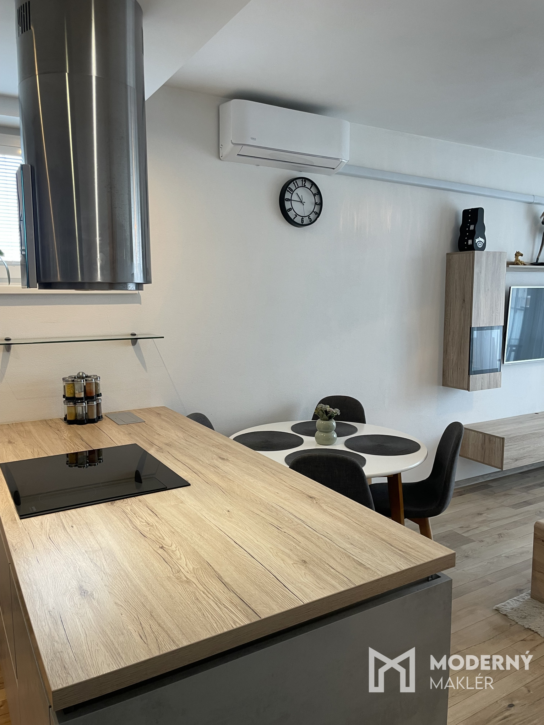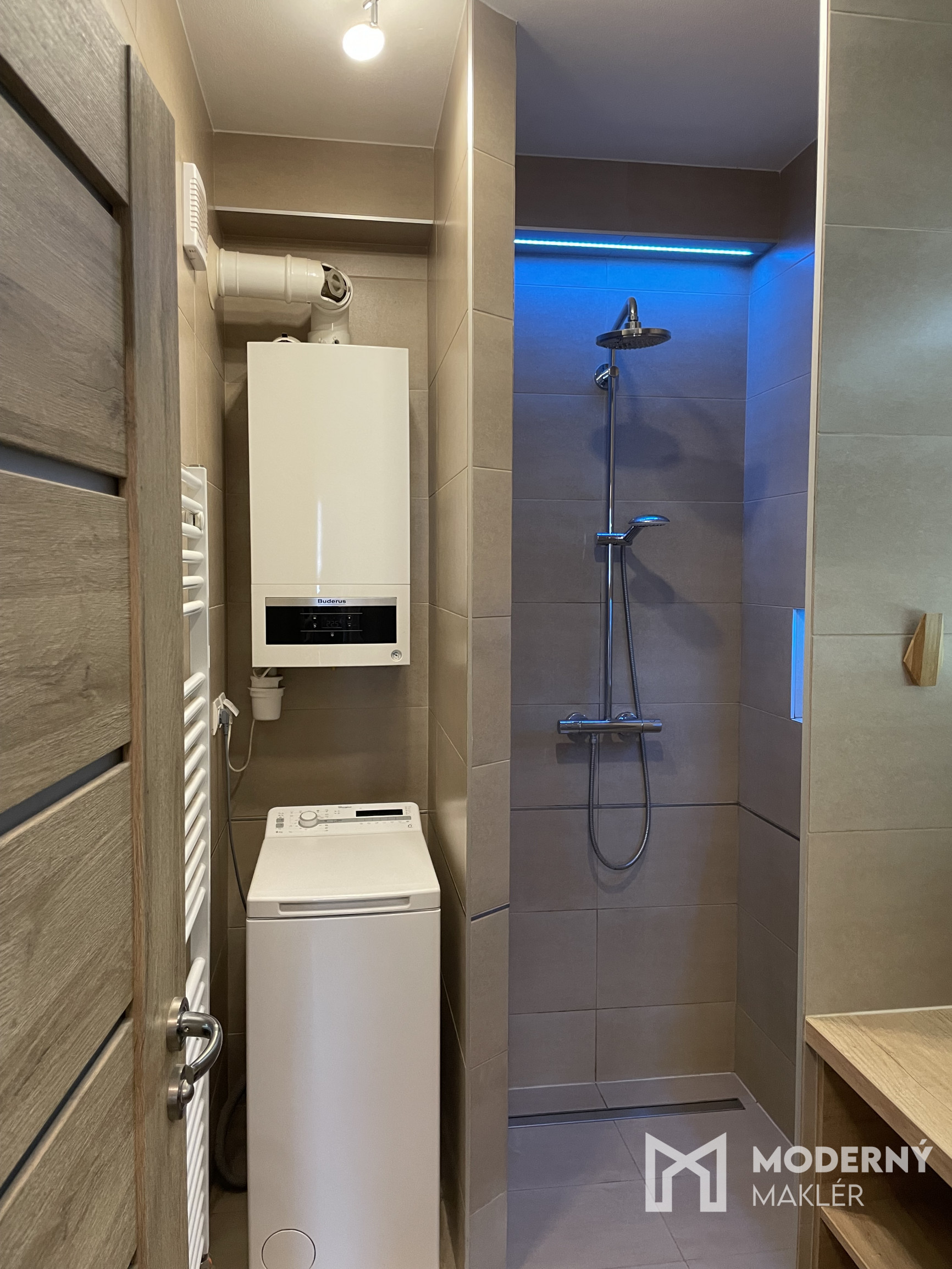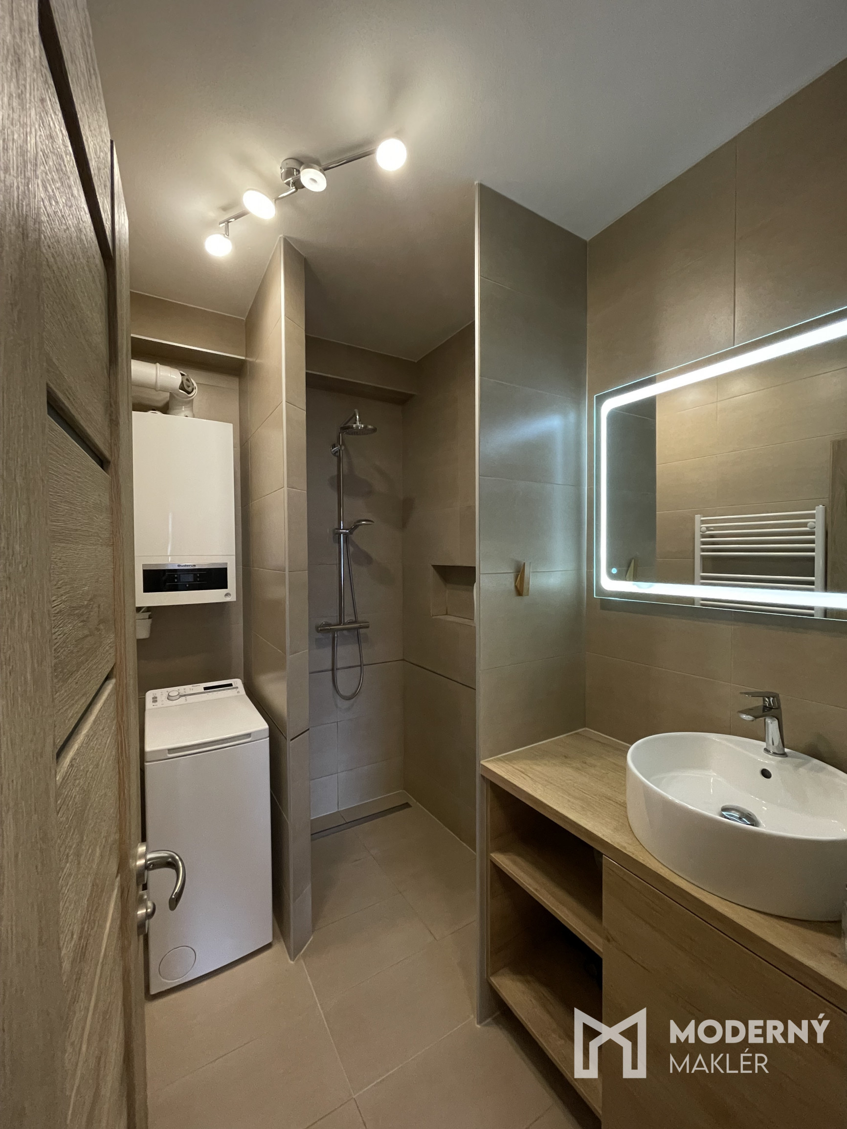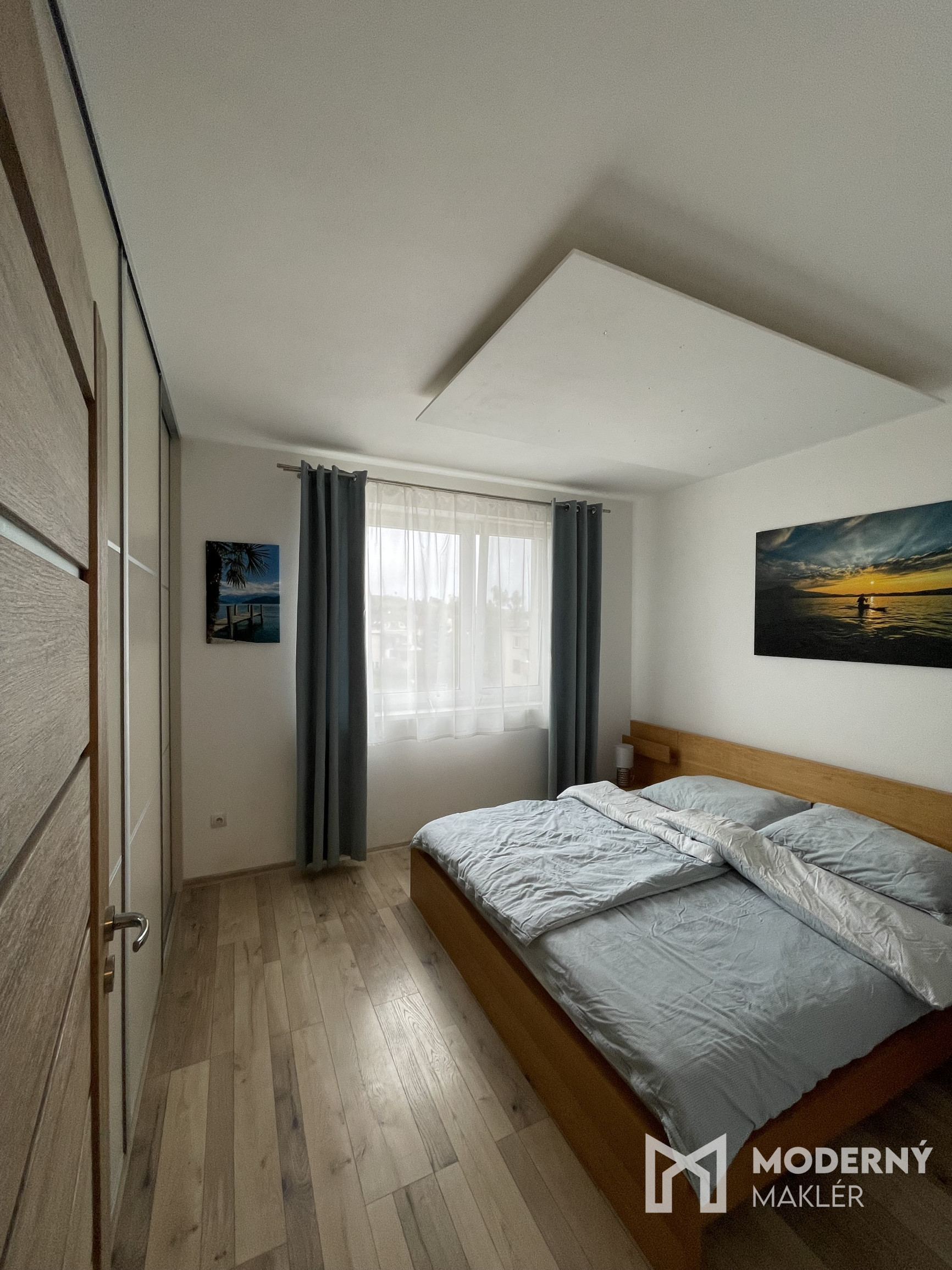 Pri vstupe do bytu sa nachádza priestranná chodba s vešiakovou stenou a botníkom s miestom na sedenie. Z chodby je vstup do samostatnej toalety a kúpeľne vybavenej sprchovým kútom, umývadlom so skrinkou a automatickou práčkou. Hlavný obytný priestor tvorí obývacia izba s balkónom, prepojená s novou kuchynskou linkou so vstavanými spotrebičmi, čo vytvára moderný a funkčný priestor vhodný na každodenné bývanie aj prijímanie hostí. Spálňa disponuje manželskou posteľou, nočnými stolíkmi a vstavanými skriňami.