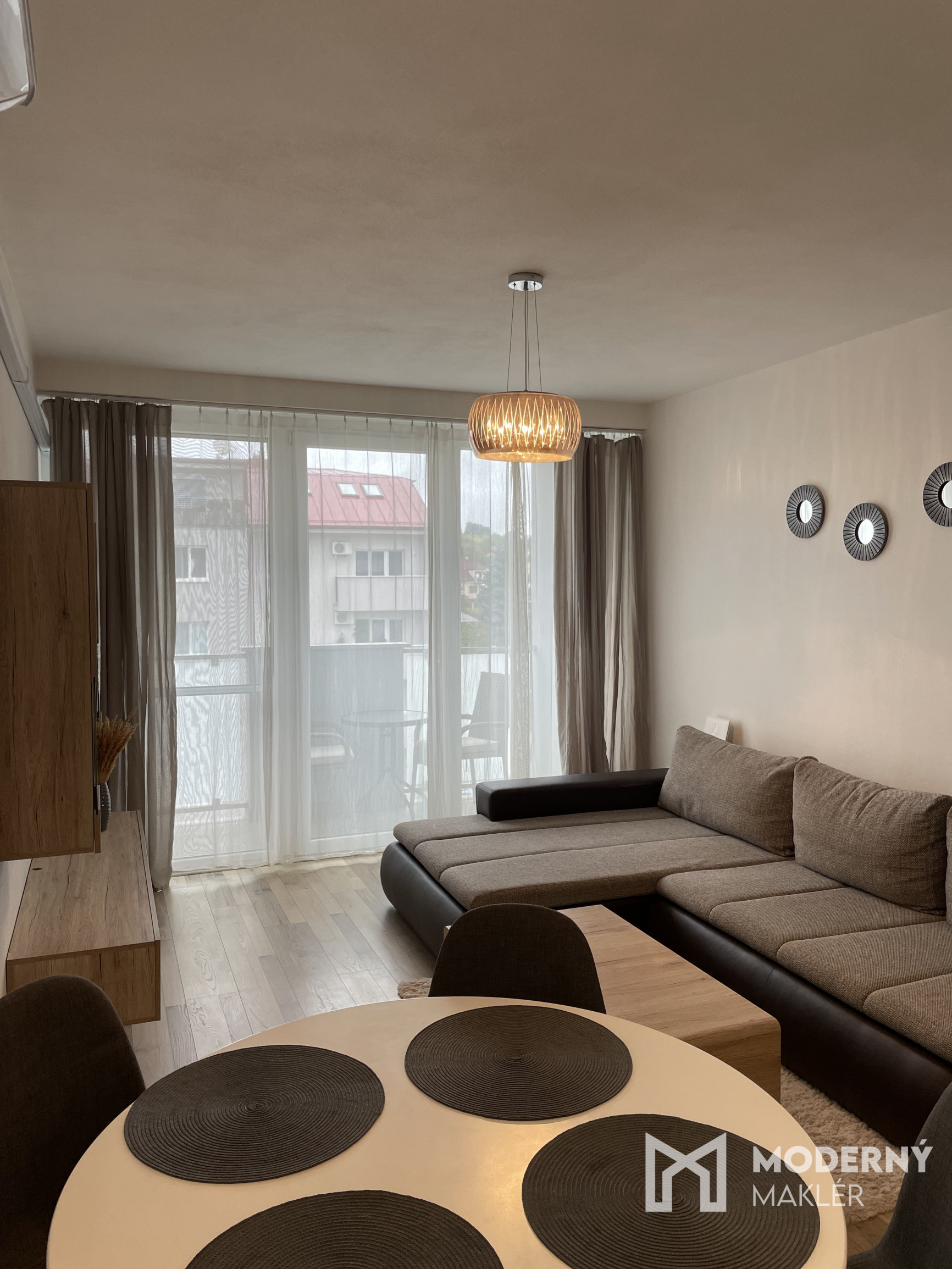Byt sa prenajíma kompletne zariadený vrátane nábytku a spotrebičov. Kuchyňa je vybavená kvalitnou kuchynskou linkou na mieru so všetkými základnými elektrospotrebičmi, jedálenským stolom so stoličkami a pohodlnou obývacou časťou. V spálni sa nachádza manželská posteľ a dostatok úložného priestoru.