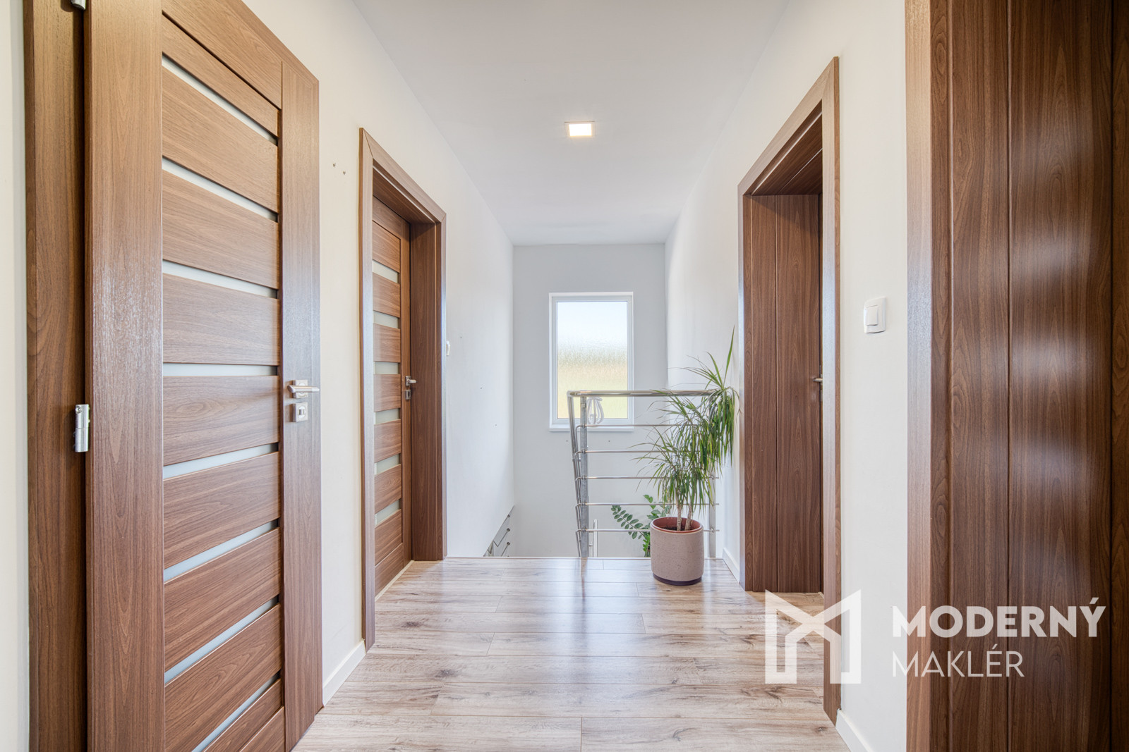 Rodinný dom sa rozprestiera na dvoch podlažiach a ponúka prakticky navrhnuté rozloženie priestorov, ktoré spája funkčnosť a komfort moderného bývania. Na prízemí sa nachádza vstupná predsieň, z ktorej sa vstupuje do priestrannej dennej časti – otvoreného priestoru spájajúceho kuchyňu, jedáleň a obývaciu izbu. Z obývacej izby je priamy vstup na terasu a balkón, ktoré rozširujú obytný priestor o príjemné vonkajšie posedenie. Na tomto podlaží sa nachádza aj kúpeľňa s WC a vaňou. Na poschodí sú situované tri izby – dve detské izby, ktoré poskytujú dostatok priestoru pre rodinu s deťmi, a spálňa s pracovňou, ktorá ponúka flexibilné využitie pre oddych aj prácu z domu. Súčasťou poschodia je aj kúpeľňa so sprchovacím kútom a WC, ideálna na každodenné používanie.