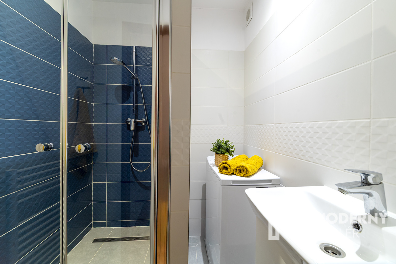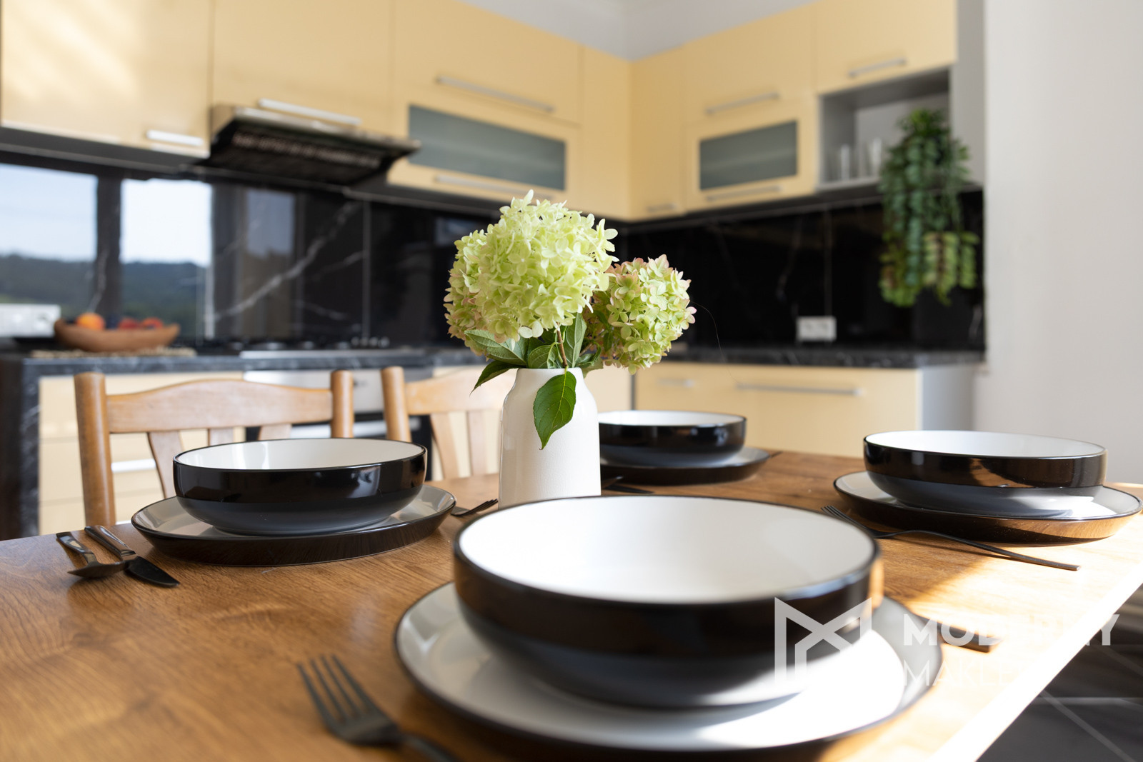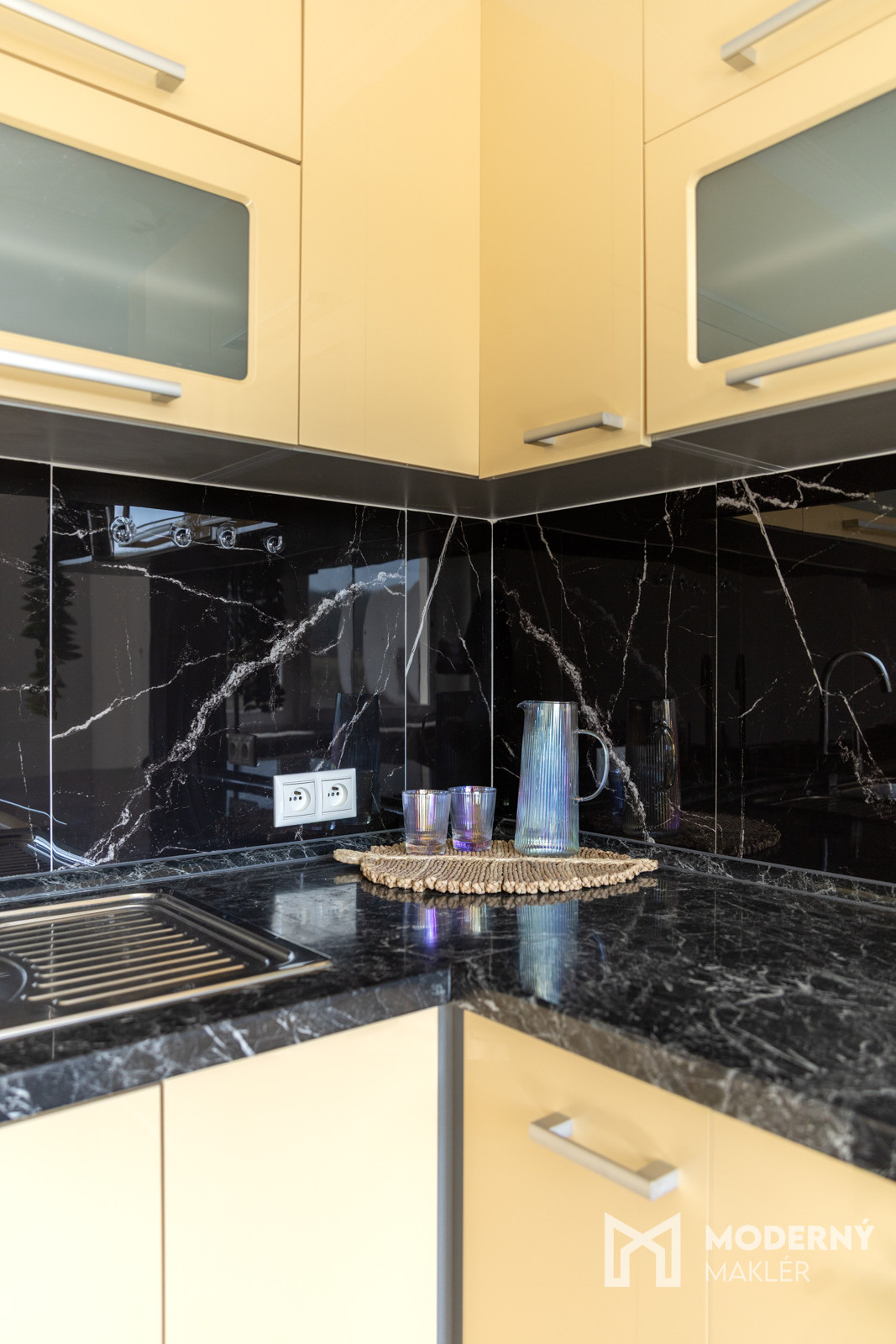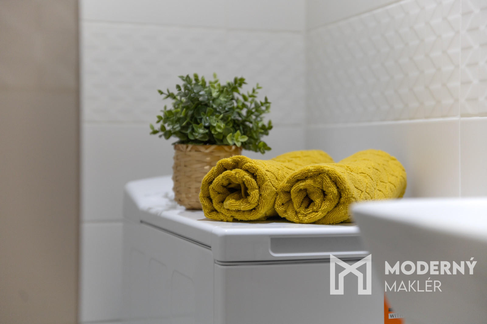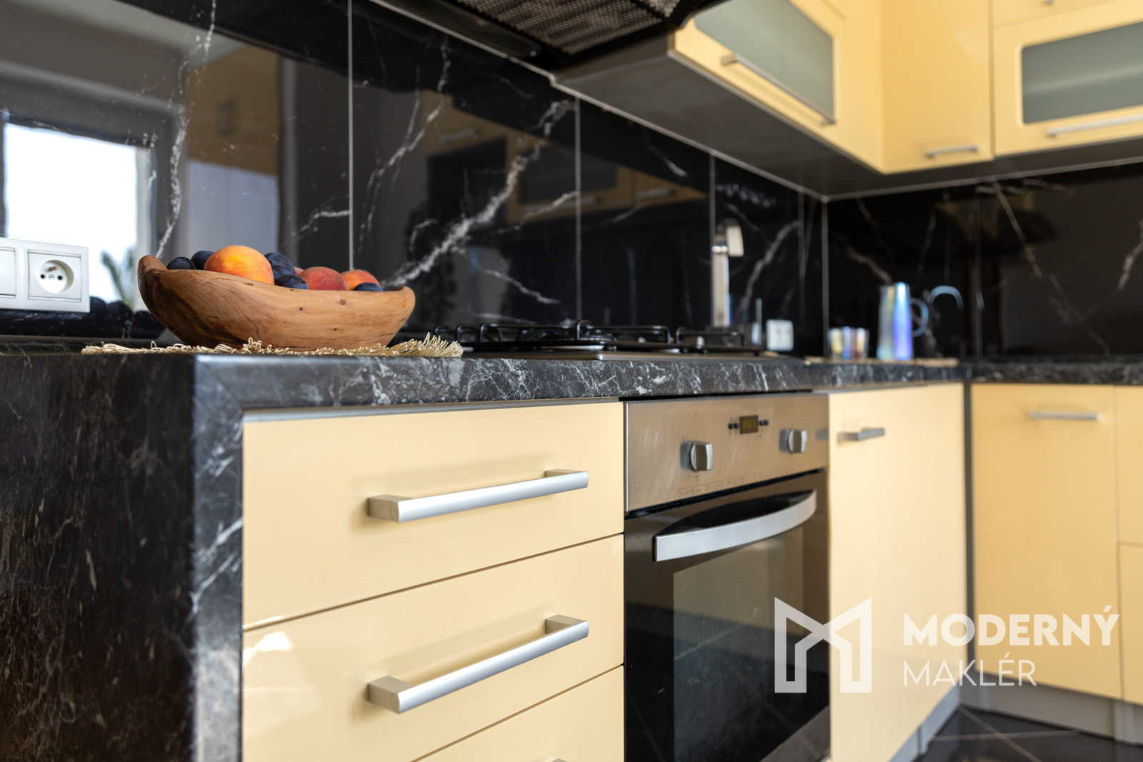 Nehnuteľnosť sa predáva čiastočne zariadená. V byte sa nachádza kompletne zariadená kuchynská linka vybavená spotrebičmi (elektrická rúra, plynová varná doska a digestor). Súčasťou kuchyne je aj potravinová skriňa a rohová lavica so stolom a stoličkami, ktorá vytvára útulný jedálenský kútik. Kúpeľňa je vybavená sprchovým kútom, umývadlom so skrinkou a práčkou.