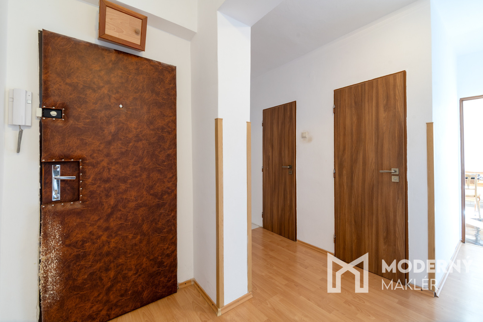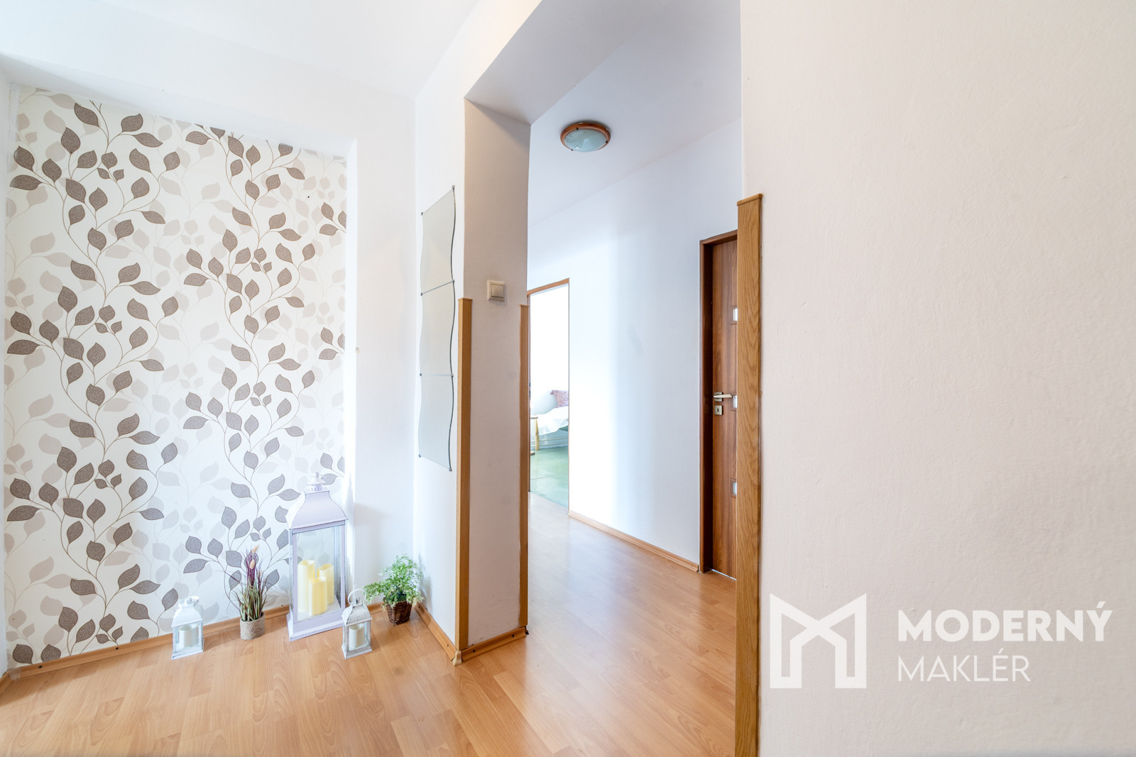 Byt sa skladá z priestrannej chodby, z ktorej sa vstupuje do všetkých miestností. Po pravej strane od vchodu sa nachádza detská izba, vedľa nej je spálňa orientovaná na sever. Priamo z chodby sa vstupuje do priestrannej obývačky s východom na balkón, ktorá je spolu s kuchyňou orientovaná na juh. Po ľavej strane od hlavného vchodu nájdete kúpeľňu a samostatnú toaletu, za ktorými sa nachádza kuchyňa. K bytu prináleží pivnica umiestnená v suteréne bytového domu, priestranná špajza priamo v byte, garáž pre jedno vozidlo situovaná pred vchodom do budovy a ďalšie vonkajšie parkovacie státie.
