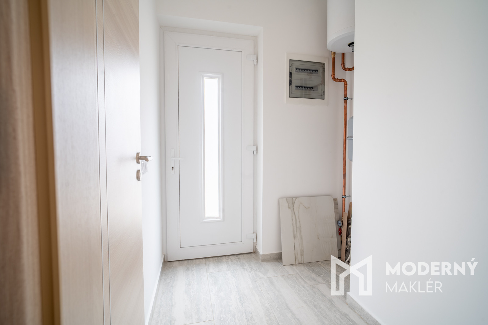 Dom pozostáva zo vstupnej chodby s hosťovskou toaletou, z ktorej sa vstupuje do priestrannej, otvorenej dennej časti spojenej s kuchyňou. Z obývacej izby je priamy vstup na veľkú, prestrešenú terasu, ideálnu na oddych či rodinné posedenia. V chodbe sa ďalej nachádza praktická technická miestnosť vybavená umývadlom a prípravou na sprchovací kút.
