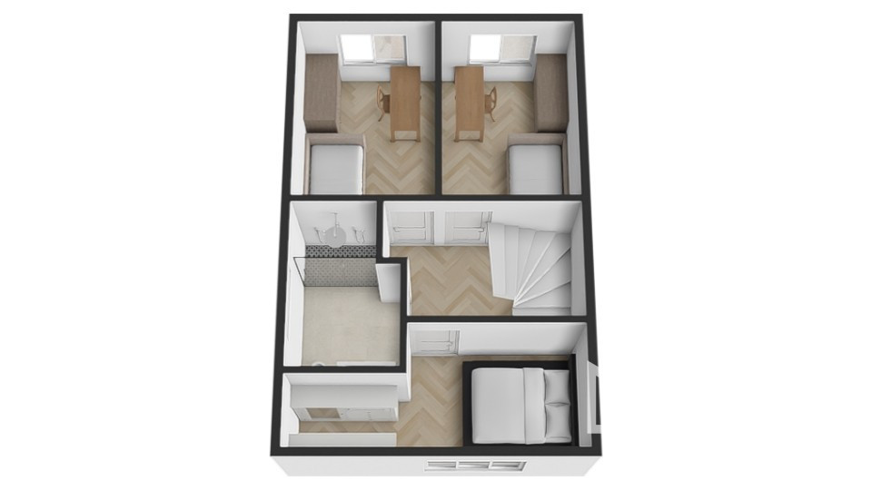 Na poschodí je spálňa, dve samostatné izby a kúpeľňa s vaňou spojená s toaletou. Dispozičné riešenie je premyslené, s jasným oddelením dennej a nočnej časti a množstvom úložného priestoru.