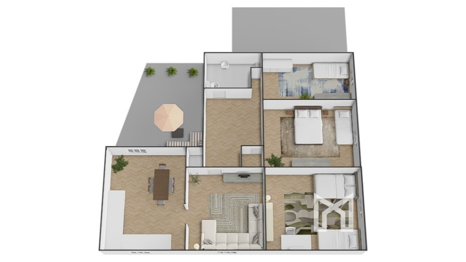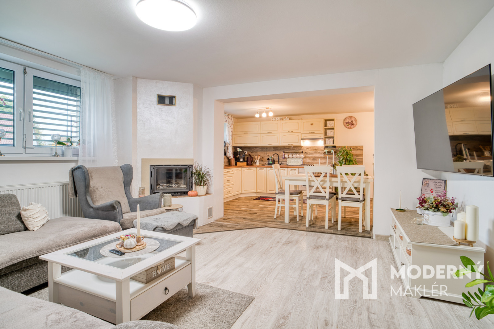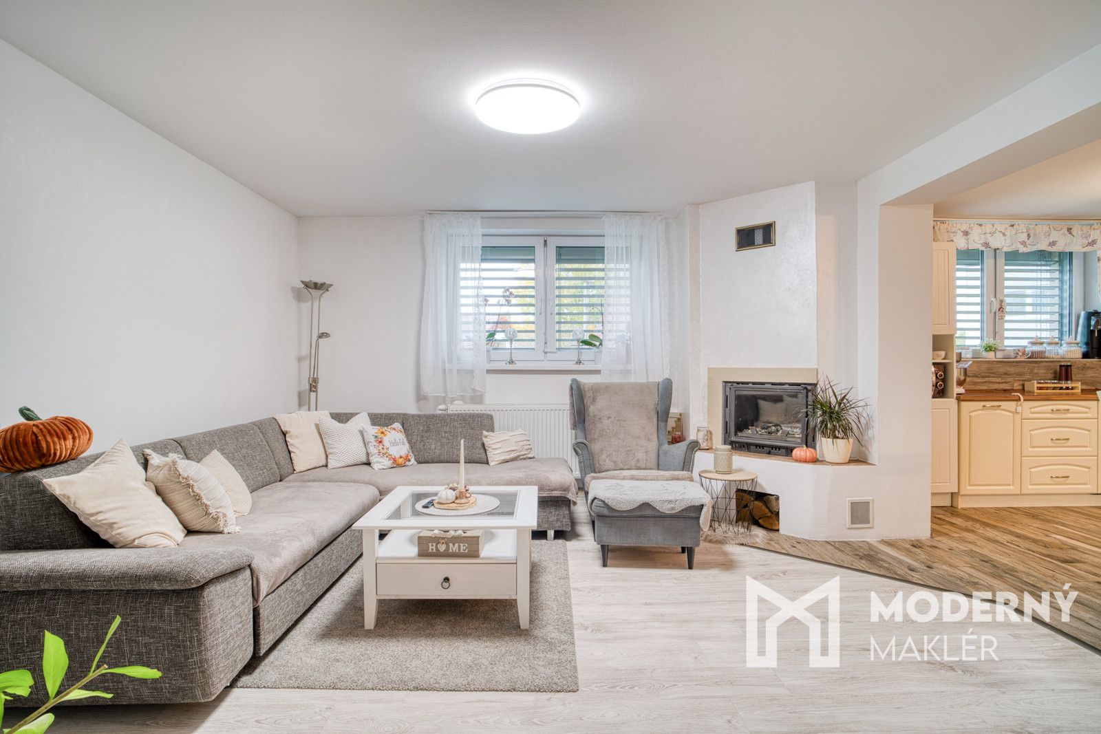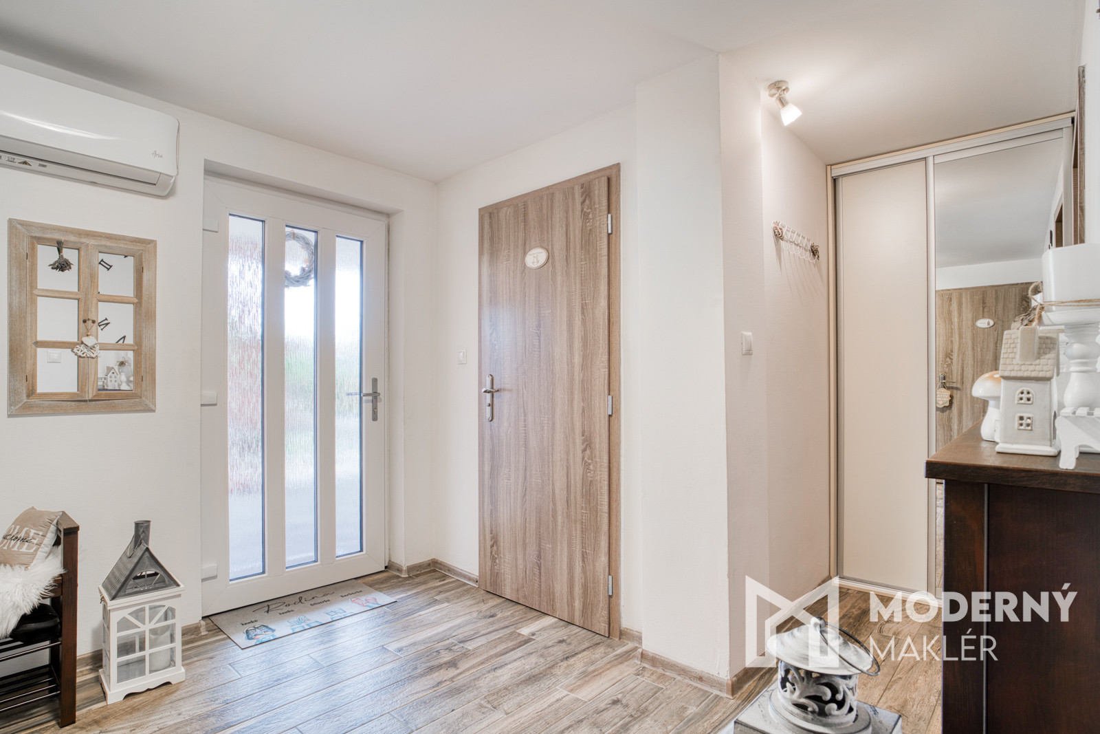 Dispozícia domu je funkčná a prehľadná, s centrálnou chodbou, ktorá tvorí srdce celého priestoru. Z chodby je vstup do dvoch detských izieb, technickej miestnosti, kúpeľne spojenej s WC a priestrannej obývacej izby s krbom, ktorá je prepojená s kuchyňou. Z obývačky vedie vstup do hlavnej spálne, čo vytvára praktické, no súkromné dispozičné riešenie. Z kuchyne je priamy výstup terasovými dverami na krytú terasu, ktorá rozširuje obytný priestor o vonkajšiu relaxačnú zónu. Dom pôsobí vzdušne a logické rozmiestnenie miestností poskytuje dostatok priestoru pre celú rodinu.