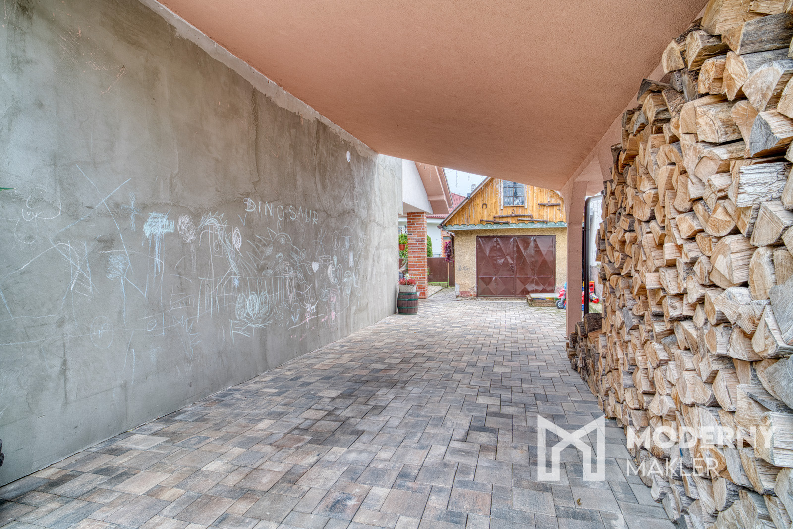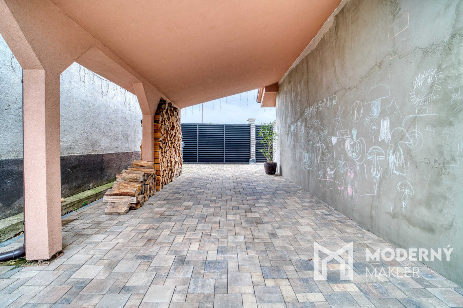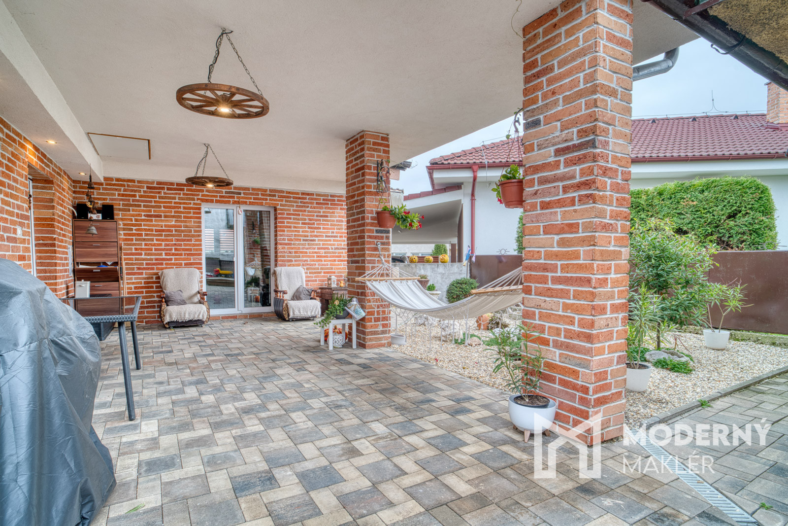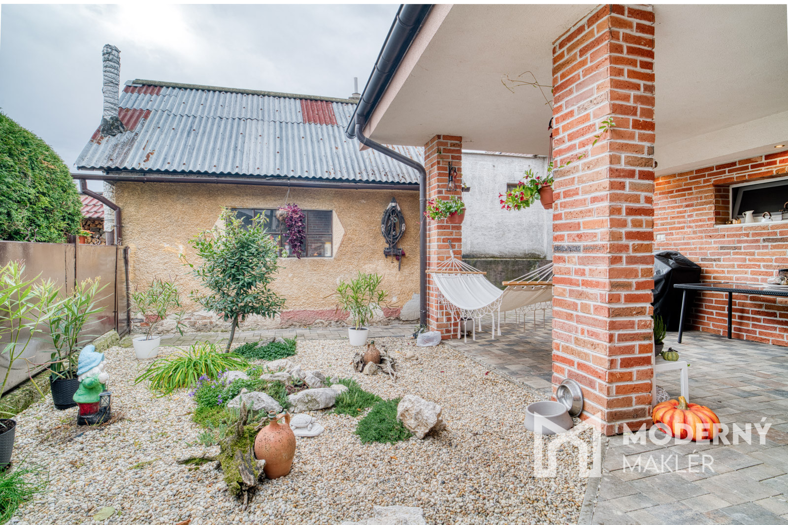 Dom sa predáva čiastočne zariadený, vrátane modernej kuchynskej linky so vstavanými spotrebičmi a nábytku podľa dohody s majiteľom. Na pozemku sa nachádza samostatne stojaca garáž a krytá terasa, ktoré poskytujú dostatok priestoru pre parkovanie, grilovanie či rodinné posedenia. Pozemok je oplotený, upravený a udržiavaný, pripravený na okamžité bývanie bez ďalších nákladov.