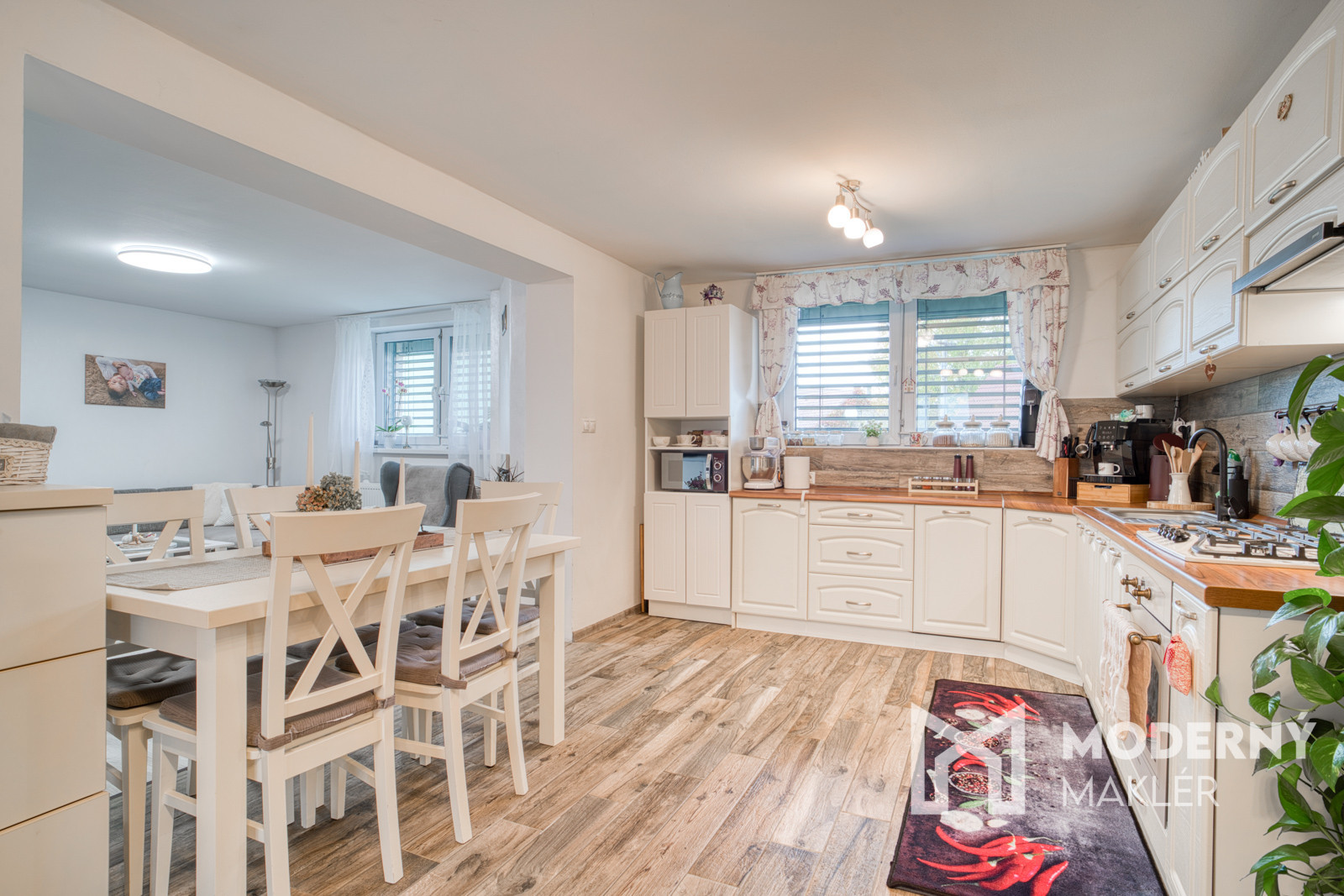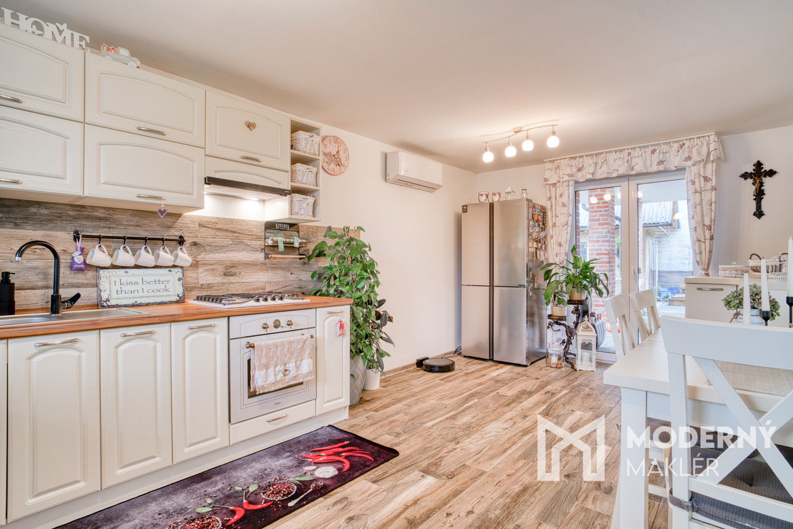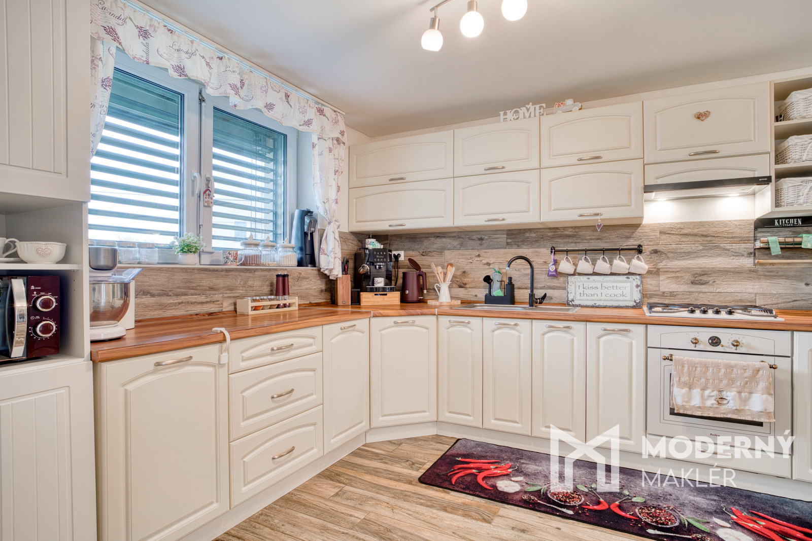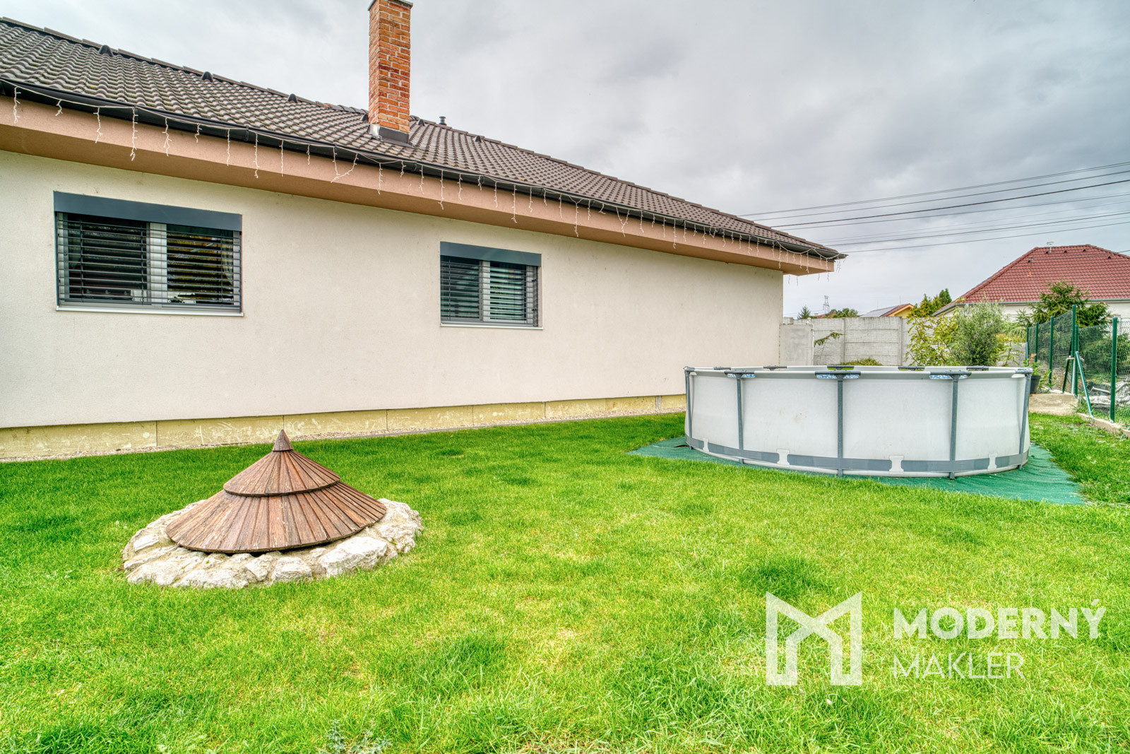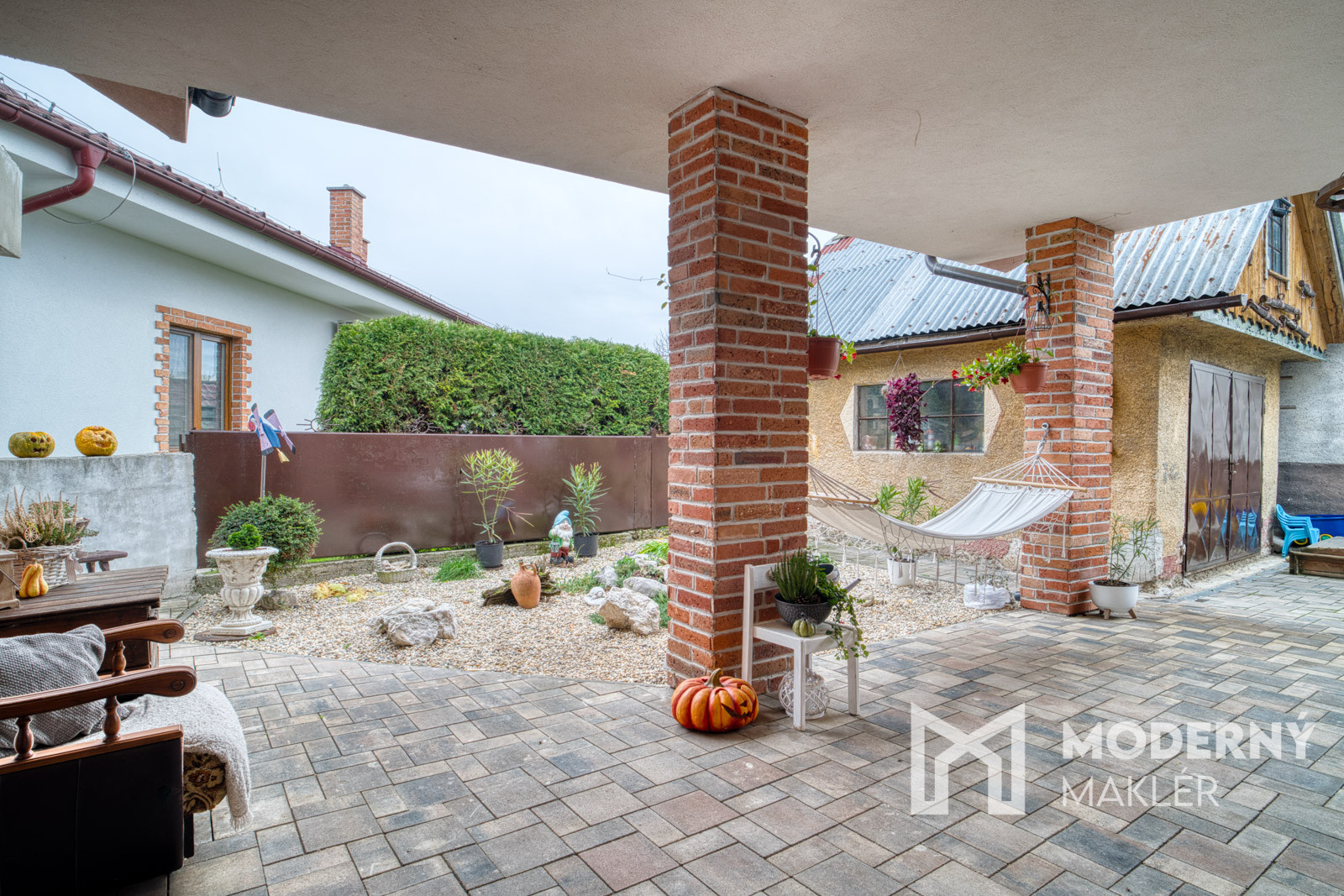 Dom sa predáva čiastočne zariadený, vrátane modernej kuchynskej linky so vstavanými spotrebičmi a nábytku podľa dohody s majiteľom. Na pozemku sa nachádza samostatne stojaca garáž a krytá terasa, ktoré poskytujú dostatok priestoru pre parkovanie, grilovanie či rodinné posedenia. Pozemok je oplotený, upravený a udržiavaný, pripravený na okamžité bývanie bez ďalších nákladov.